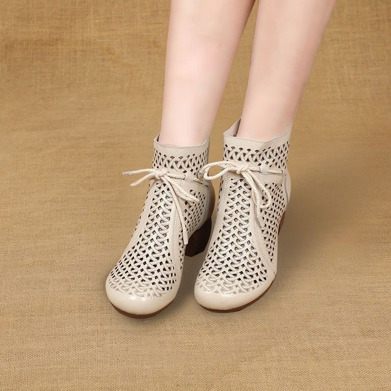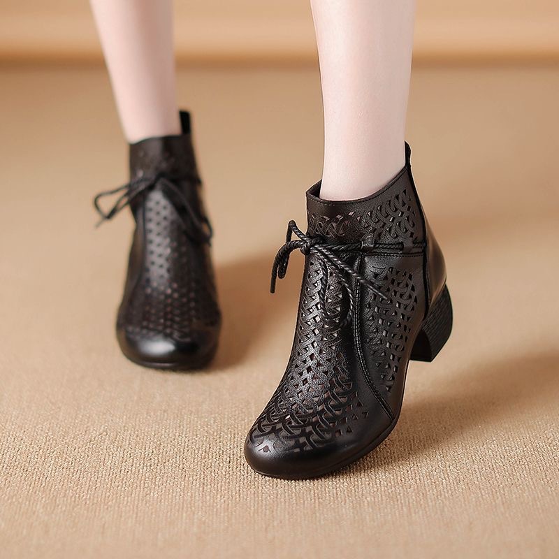 2025 여성용 에스닉 스타일 홀 부츠, 봄 여름 부드러운 가죽 중간 굽 엄마 샌들, 겉옷용 중공 짧은 부츠 도매스토어 가기