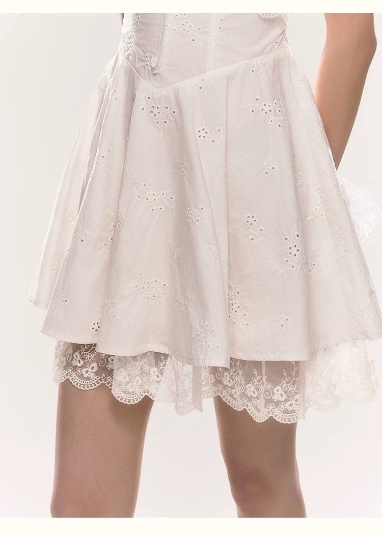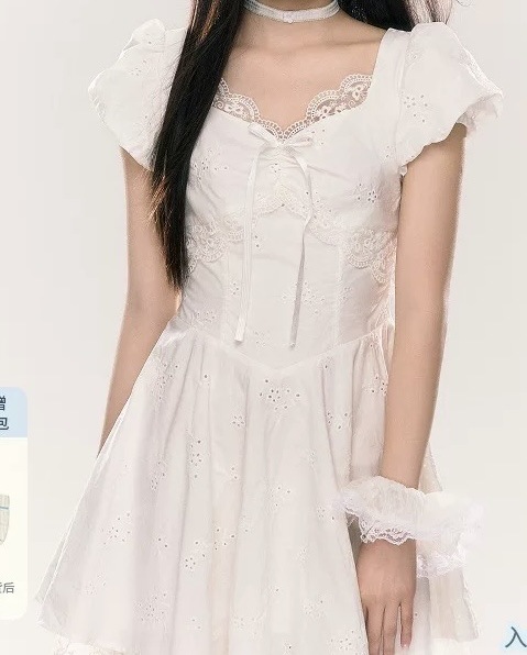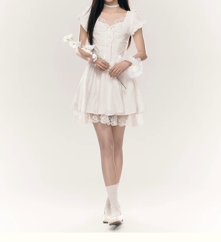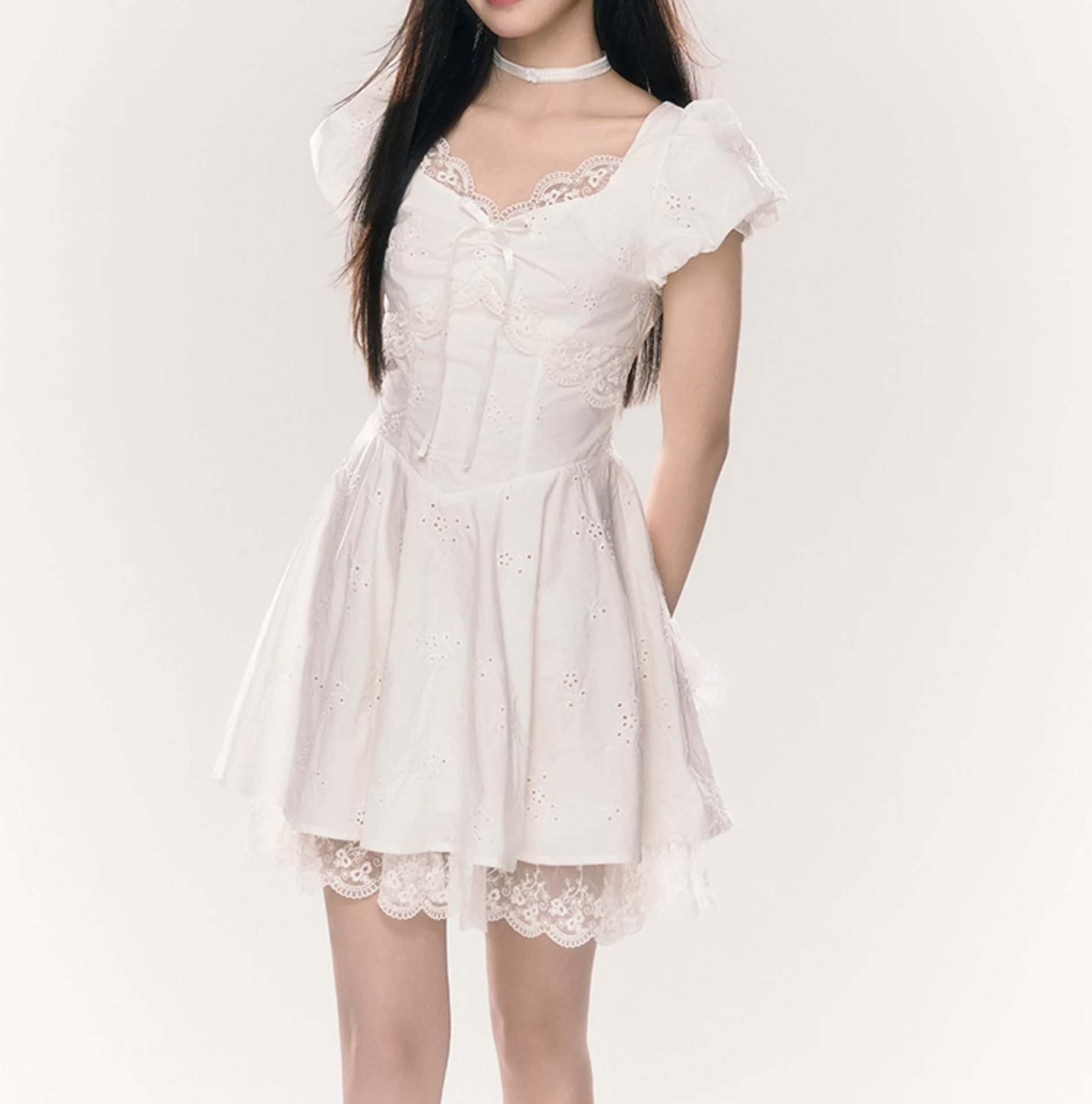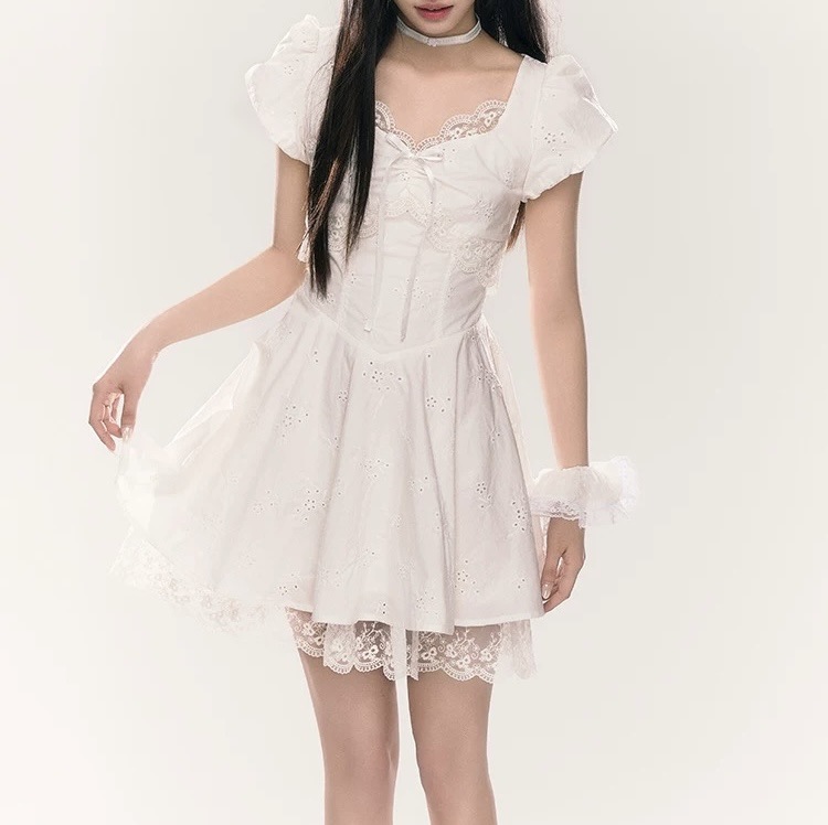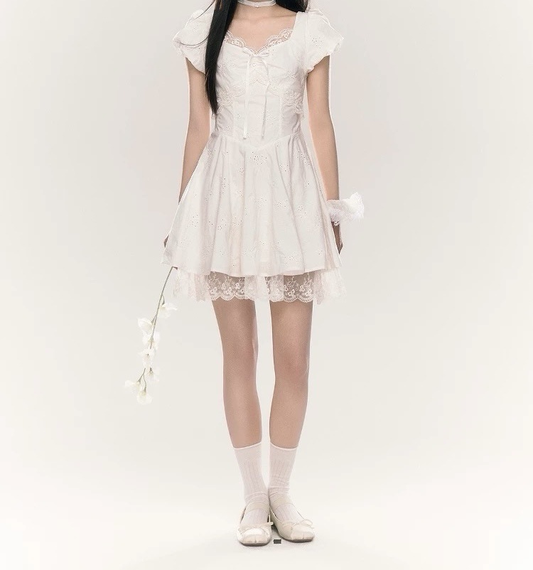 umoumo 검은 버섯(오리지널 ntot) 여름 달콤하고 부드러운 슬림 레이스 스플라이싱 중공 자수 작은 흰색 드레스