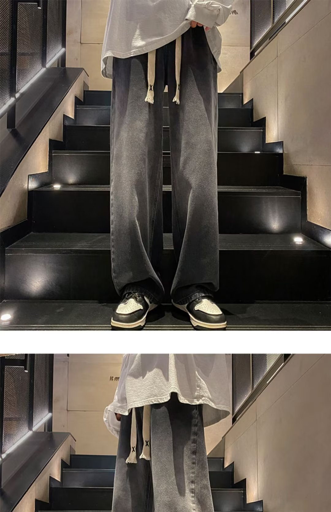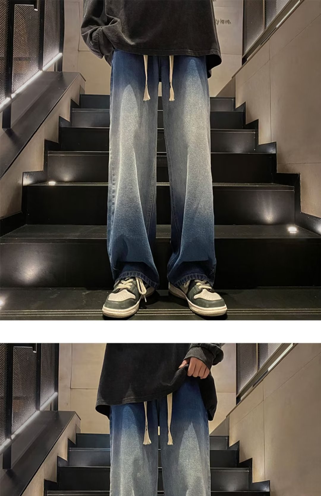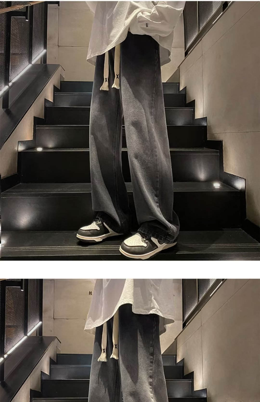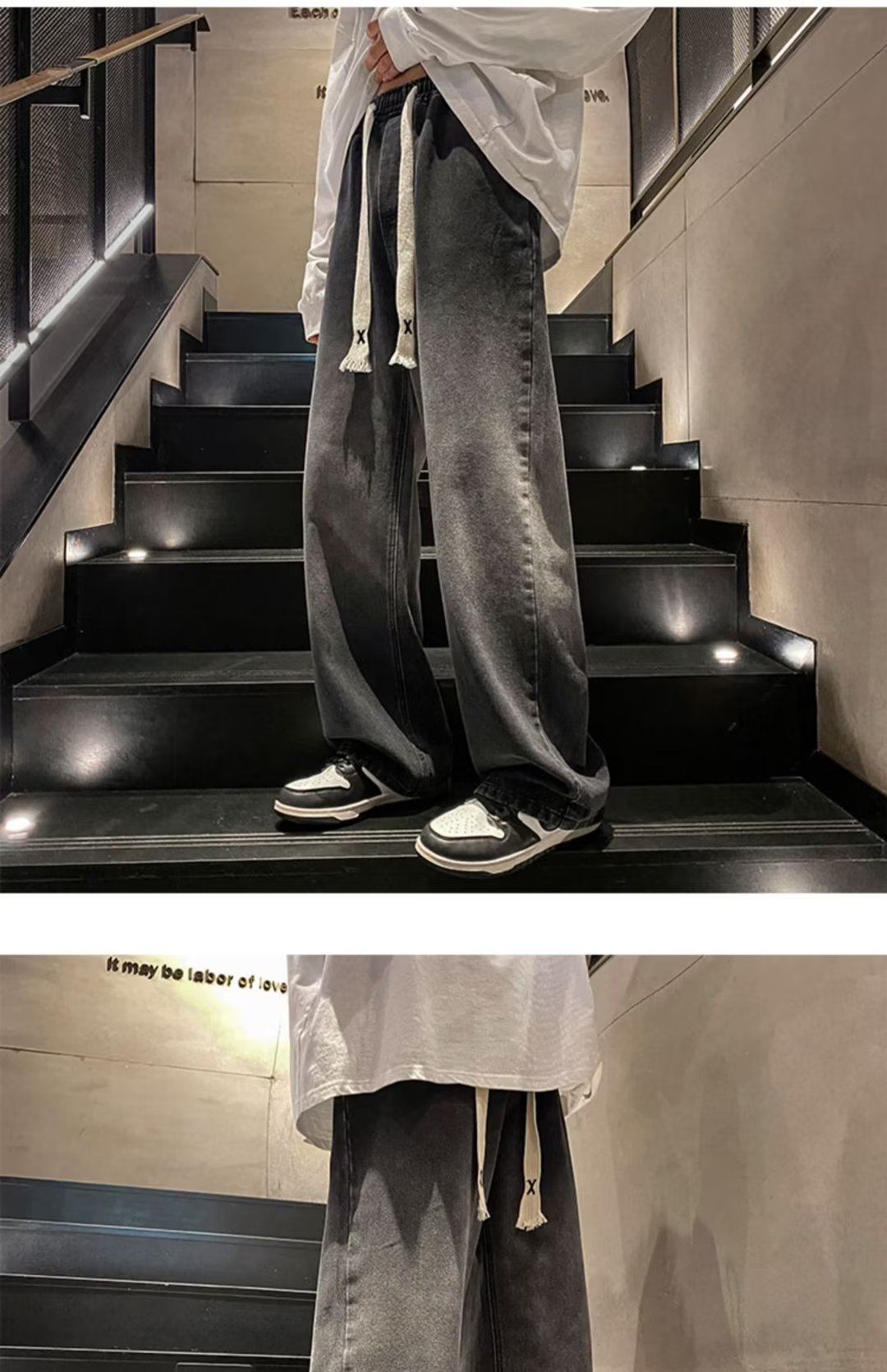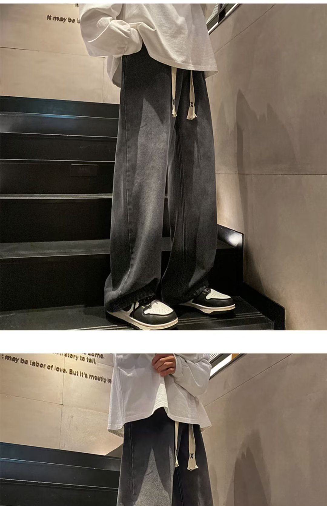 두꺼운 드로스트링 청바지 2024 봄, 가을 트렌디 아메리칸 루즈 스트레이트 와이드 팬츠 레트로 하이 스트리트 캐주얼 바지스토어 가기