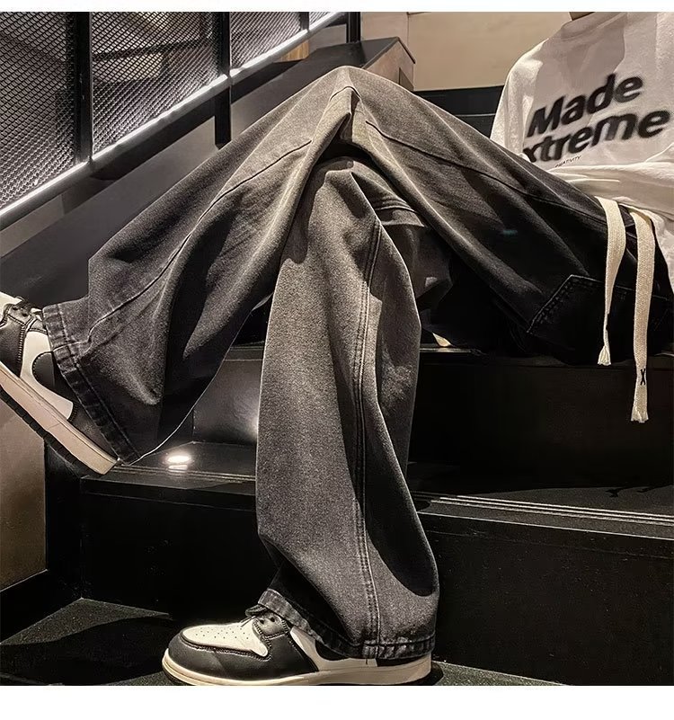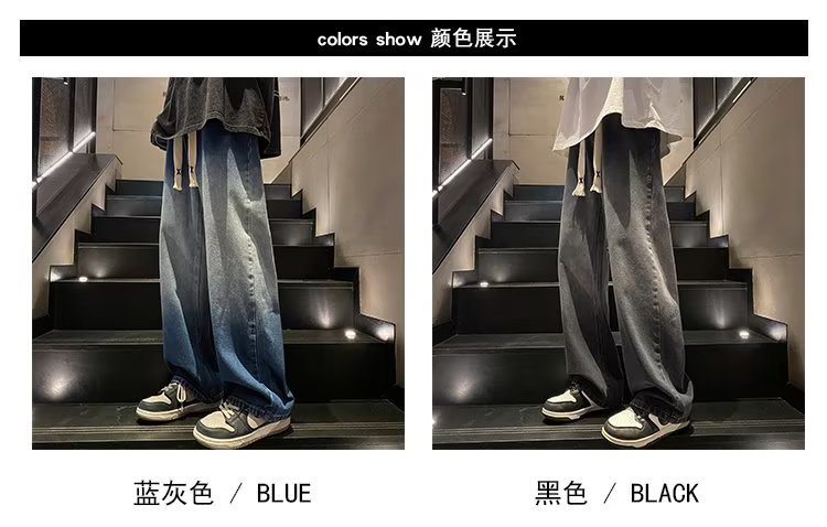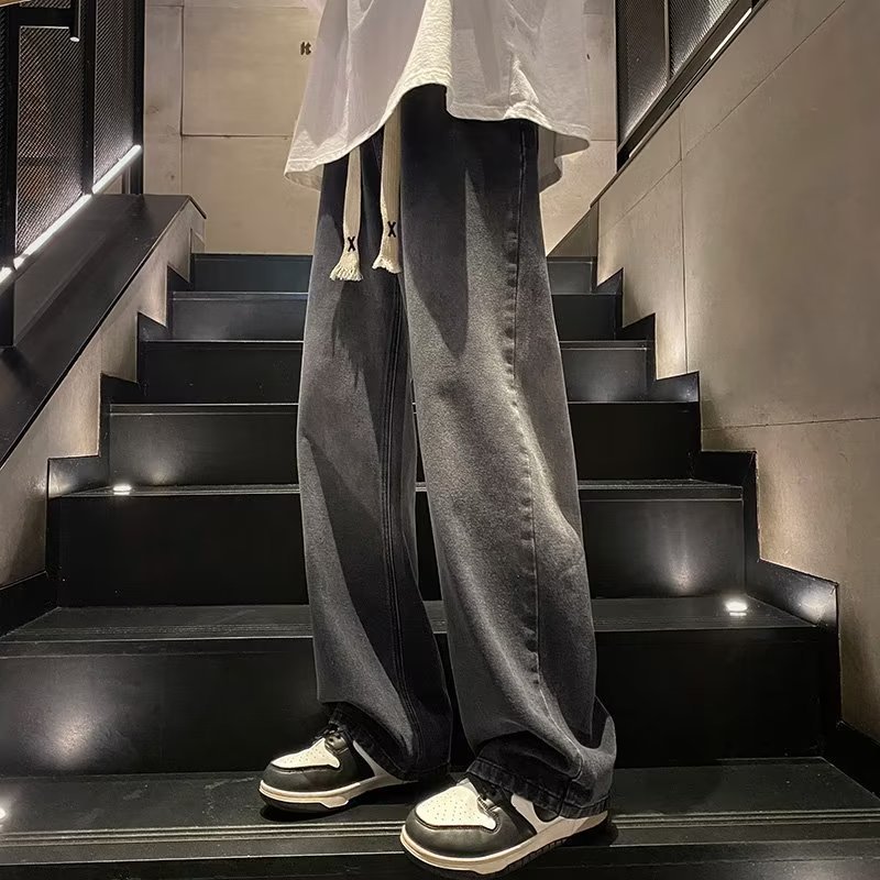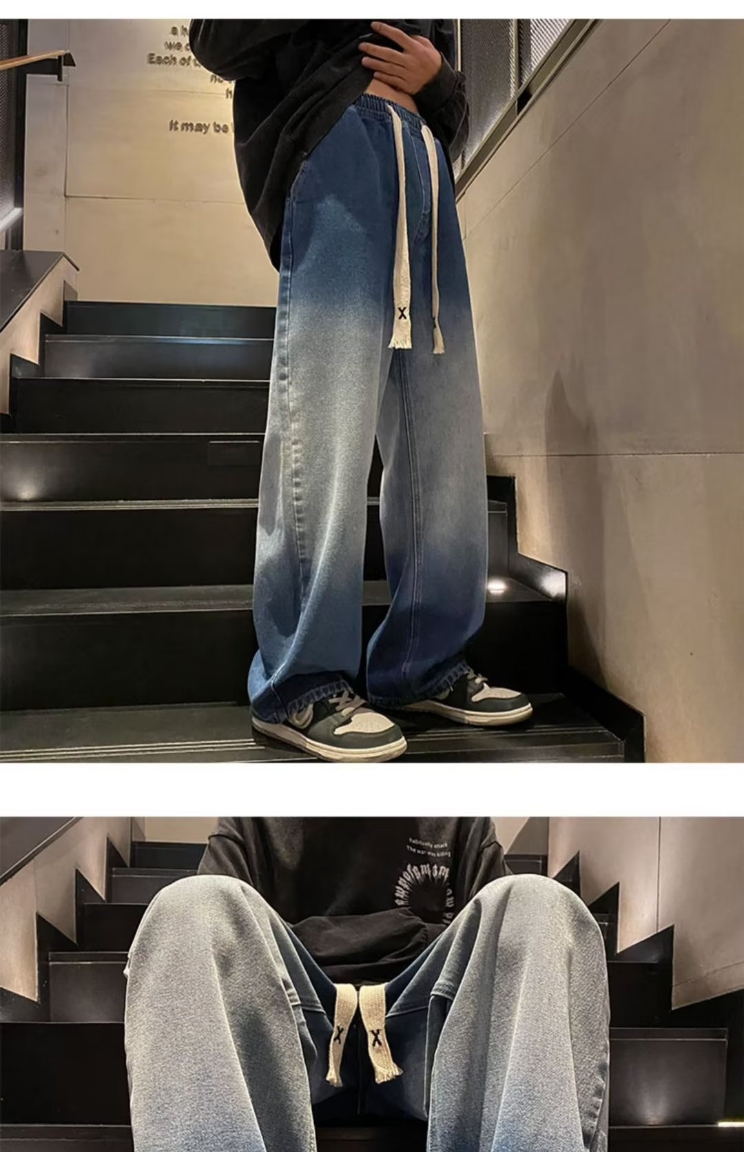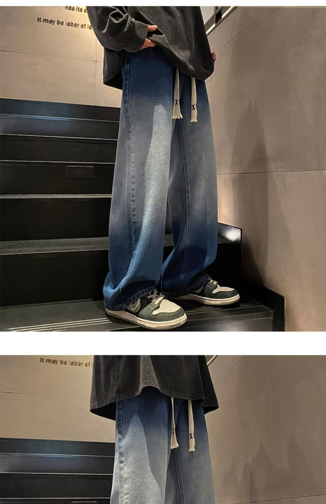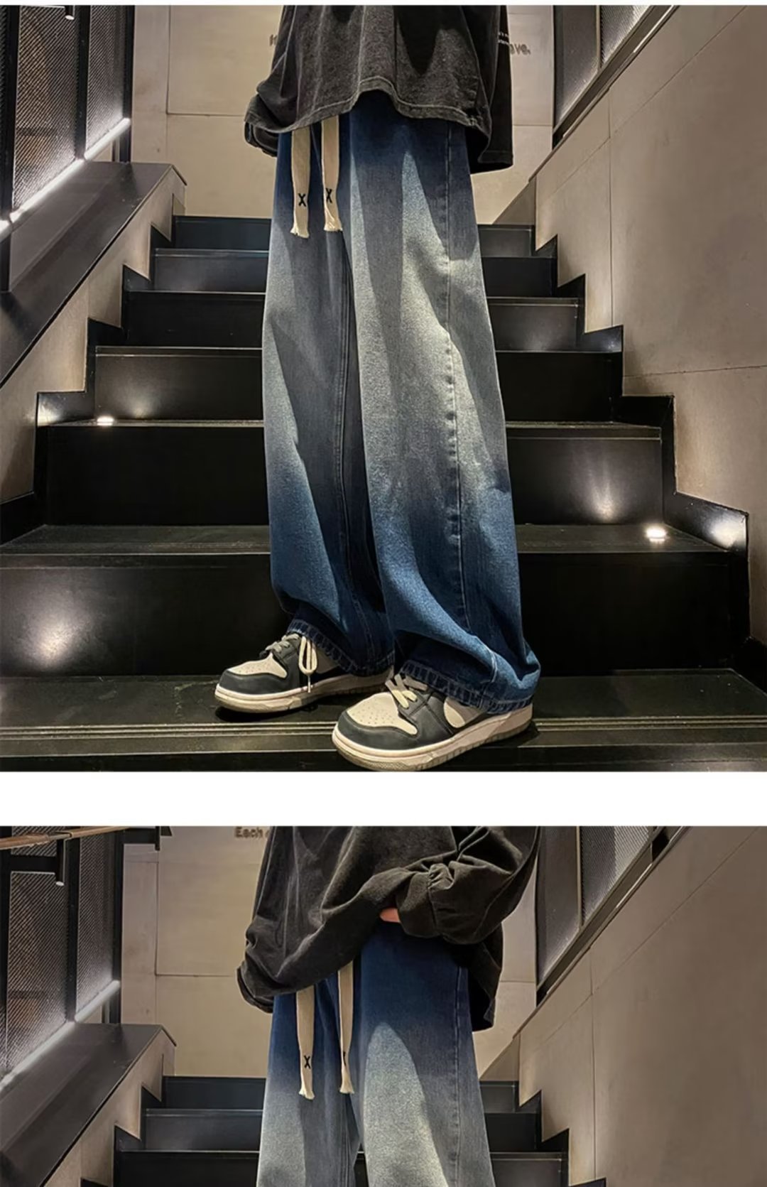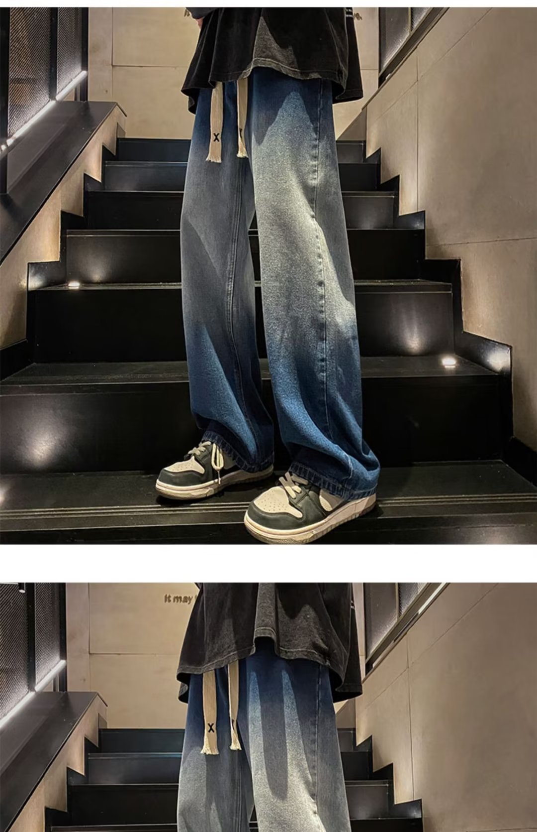 두꺼운 드로스트링 청바지 2024 봄, 가을 트렌디 아메리칸 루즈 스트레이트 와이드 팬츠 레트로 하이 스트리트 캐주얼 바지스토어 가기