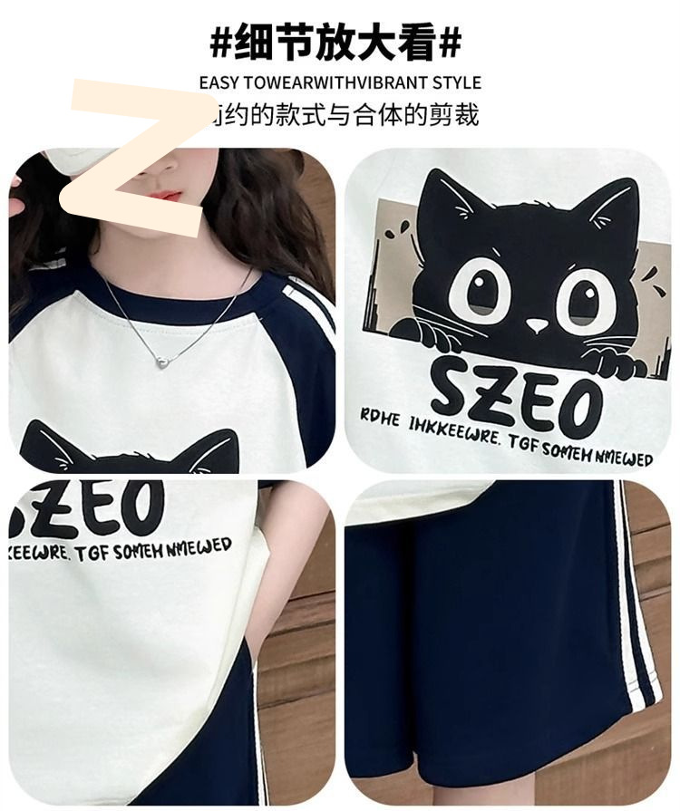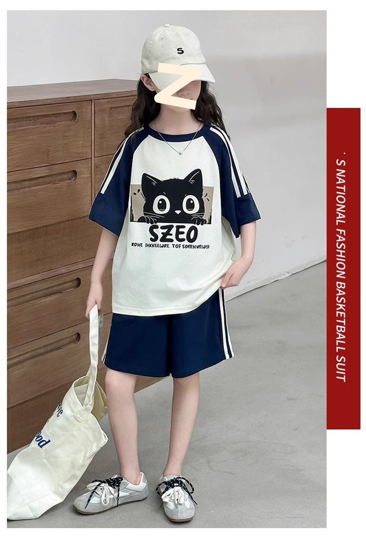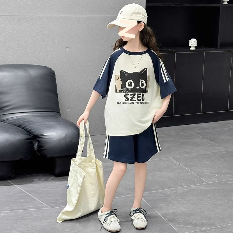여자 여름 컬러 블록 만화 반팔 양복 2025 새로운 큰 어린이 한국 스타일 티셔츠 5 점 바지 투피스 세트스토어 가기