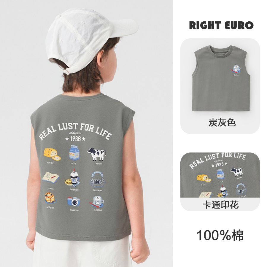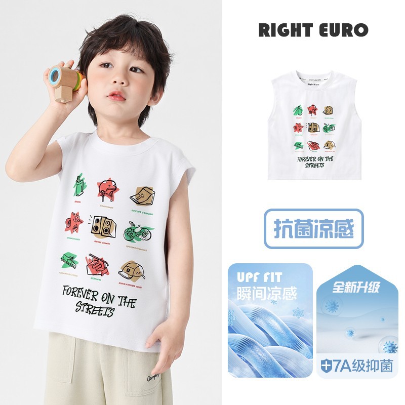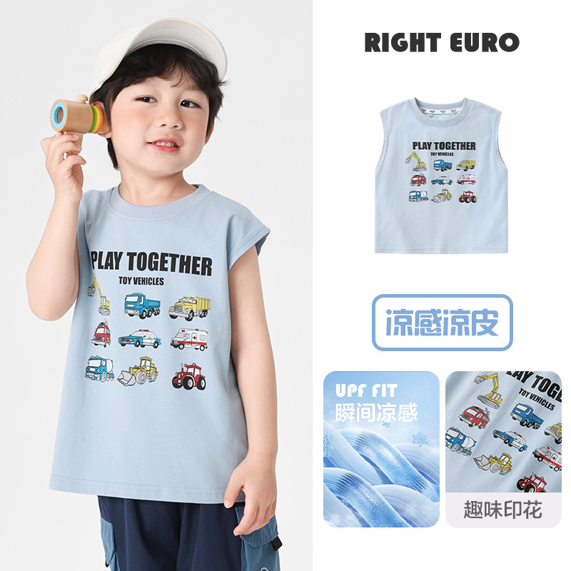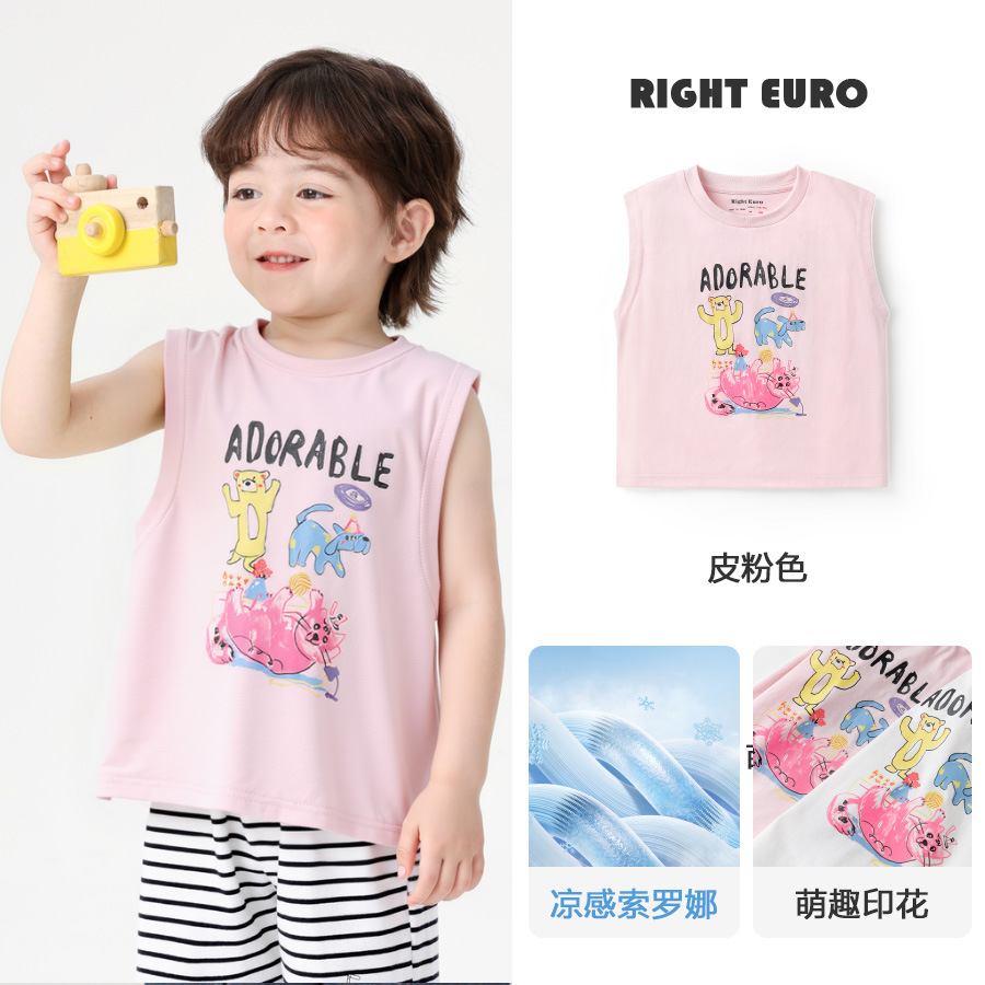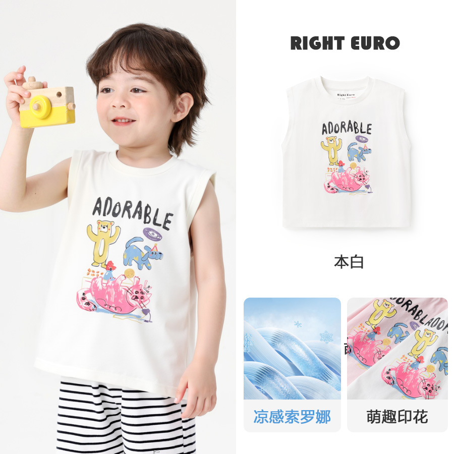 오른쪽 유럽 소년 조끼 여름 옷 2025 새로운 아동 의류 아동용 아기 소년 민소매 티셔츠 여름 얇은 스타일스토어 가기