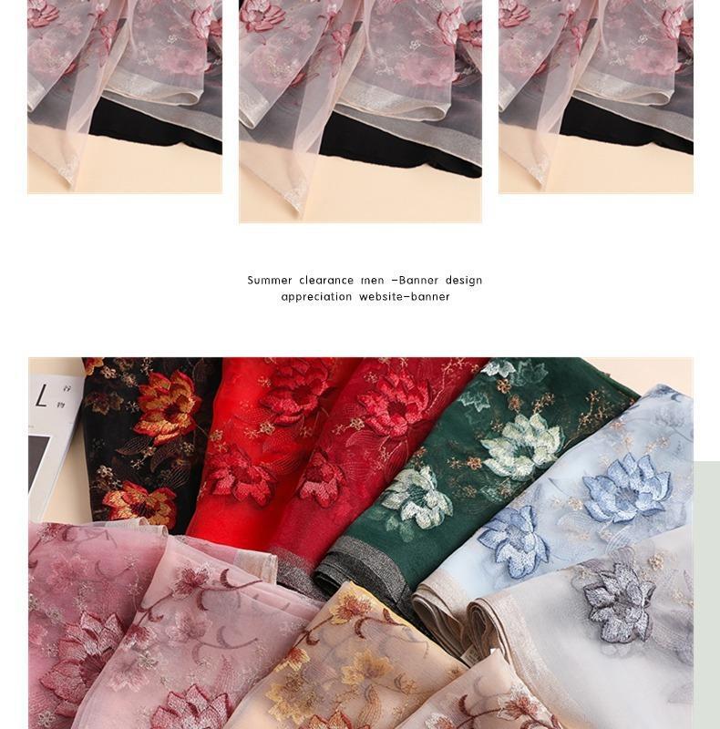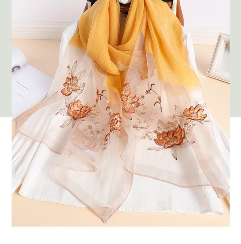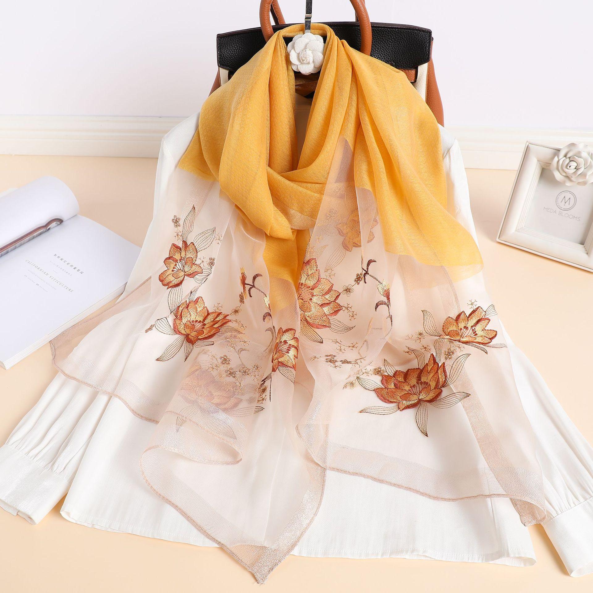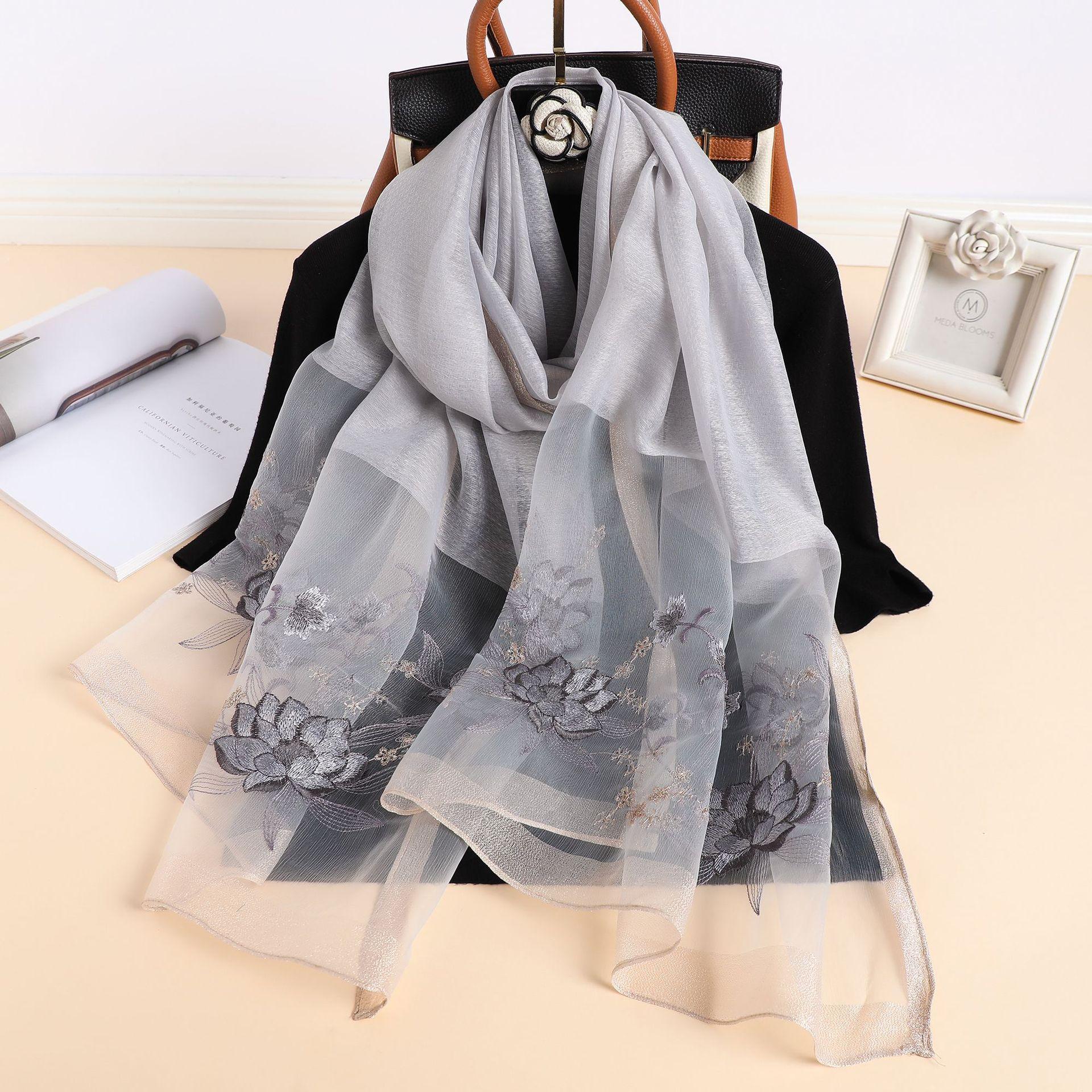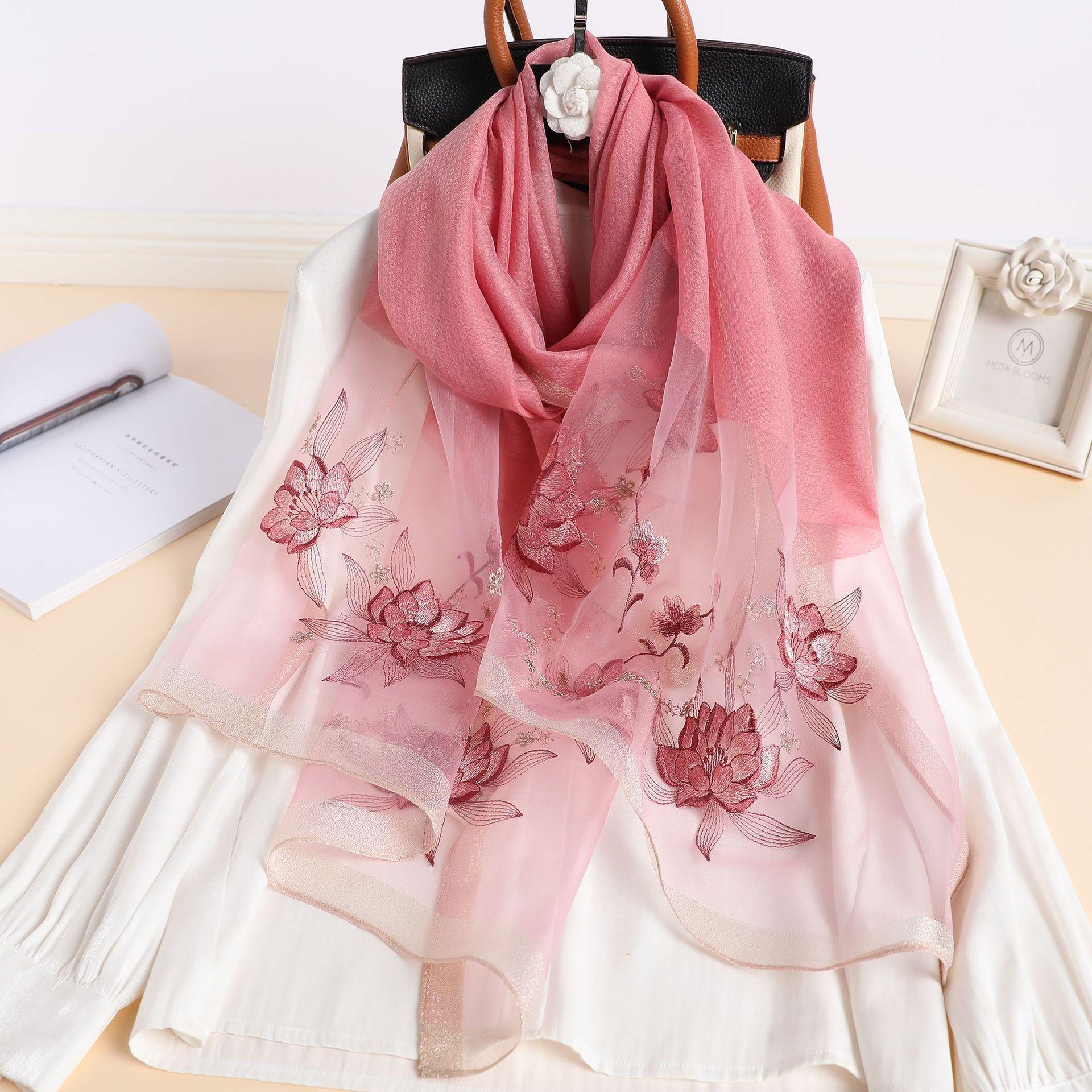 실크 스카프 여성의 새로운 우아하고 다재다능한 자수 시뮬레이션 실크 스카프 봄과 가을 장식 실크 스카프 기질 모란 자수 긴 스카프스토어 가기
