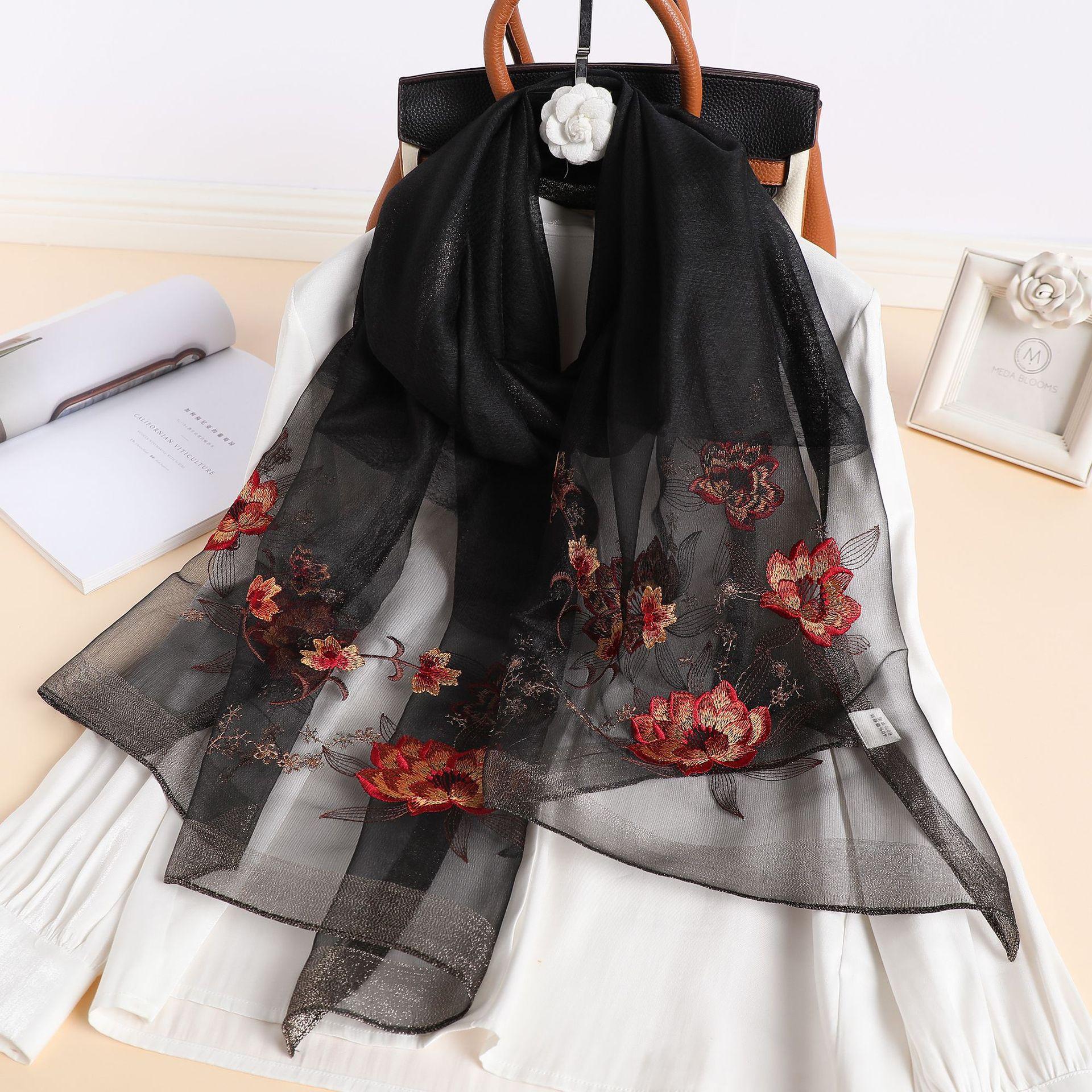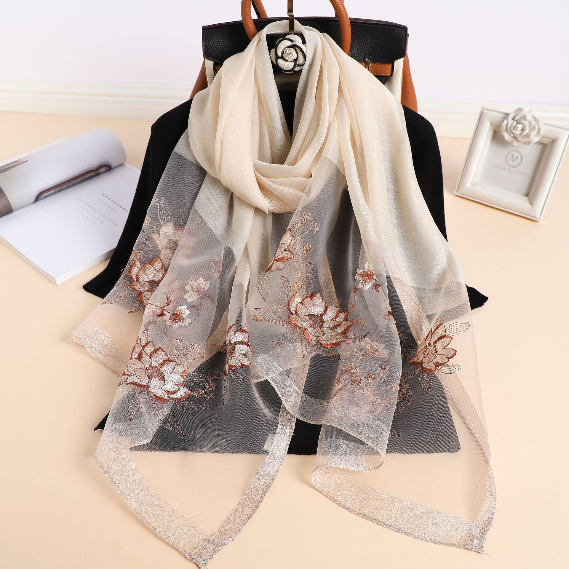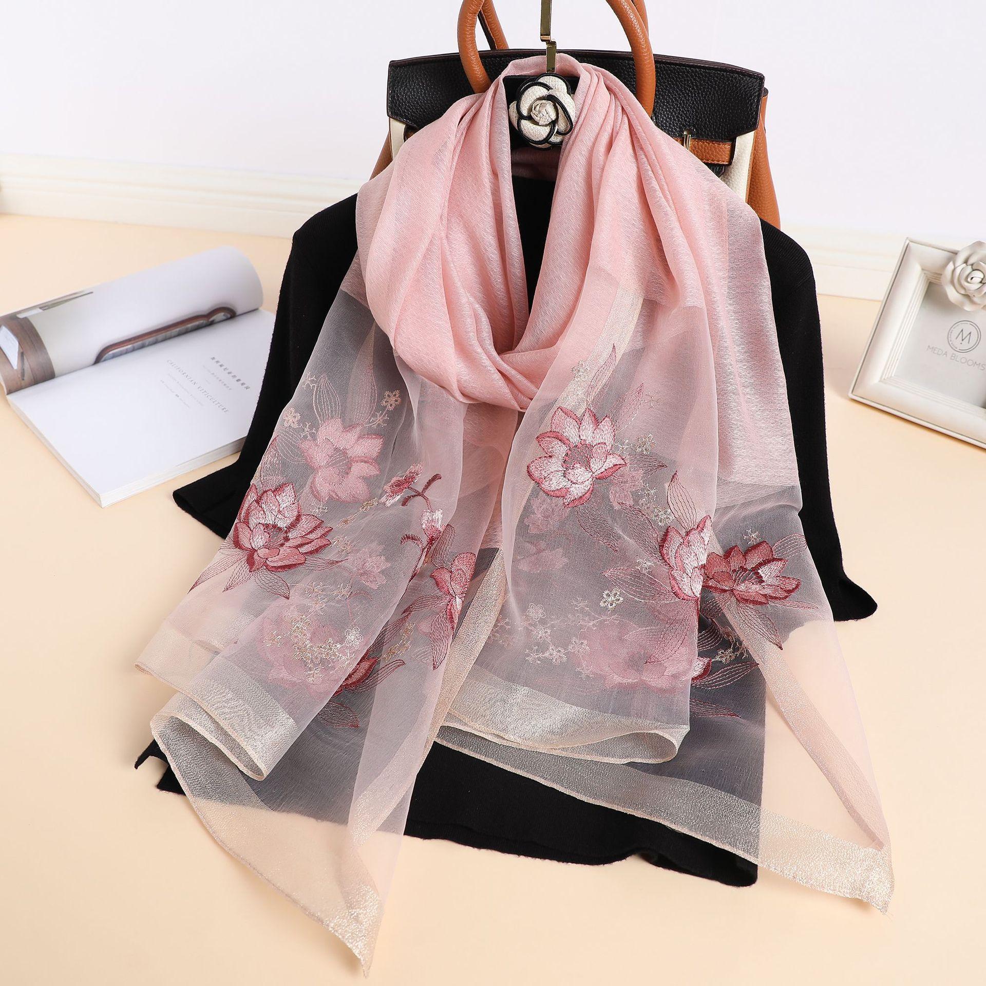 실크 스카프 여성의 새로운 우아하고 다재다능한 자수 시뮬레이션 실크 스카프 봄과 가을 장식 실크 스카프 기질 모란 자수 긴 스카프
