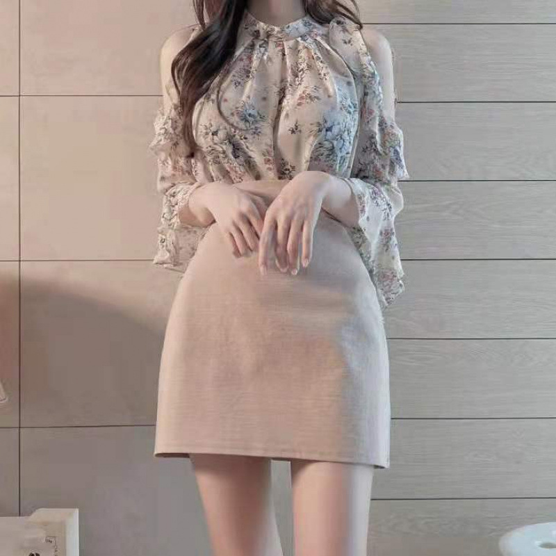 디자인 니치 오프숄더 레트로 스위트 기질 쉬폰 꽃무늬 셔츠 프렌치 탑 하이웨이스트 스커트 투피스 세트