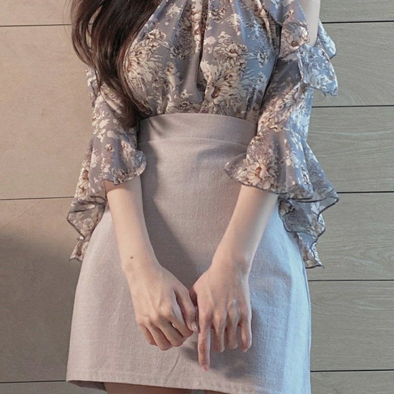 디자인 니치 오프숄더 레트로 스위트 기질 쉬폰 꽃무늬 셔츠 프렌치 탑 하이웨이스트 스커트 투피스 세트스토어 가기