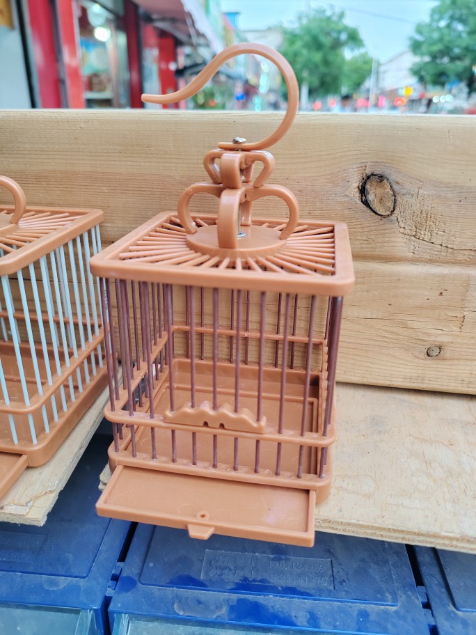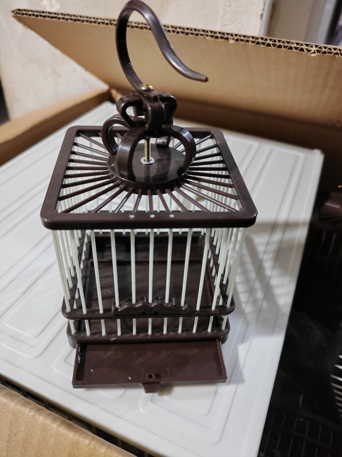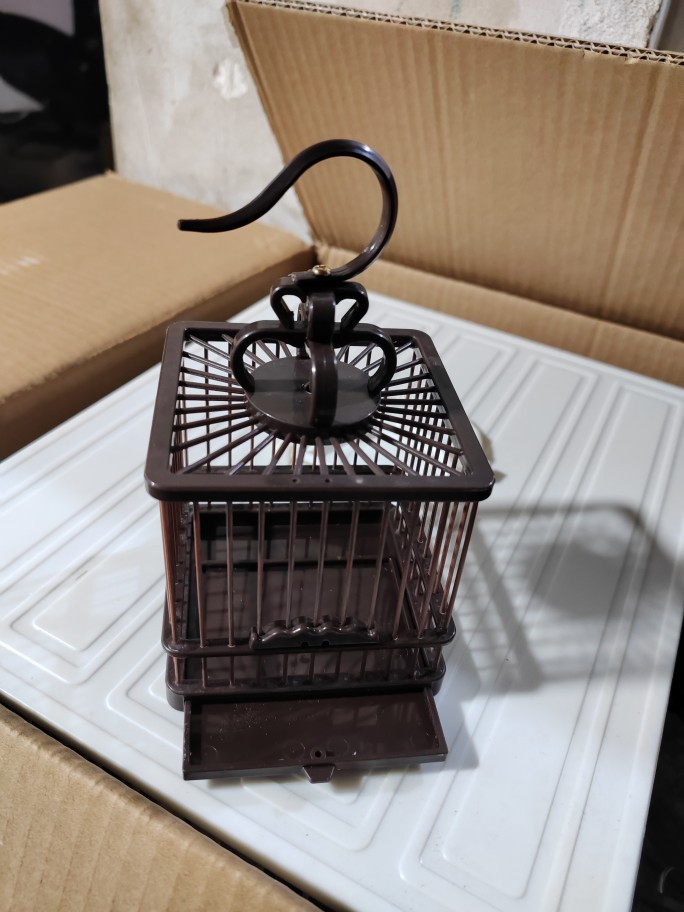 • 구리 후크가 달린 갈색과 흰색의 정사각형 메뚜기 케이지