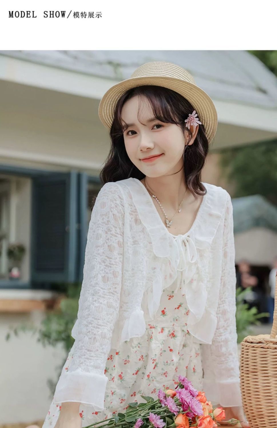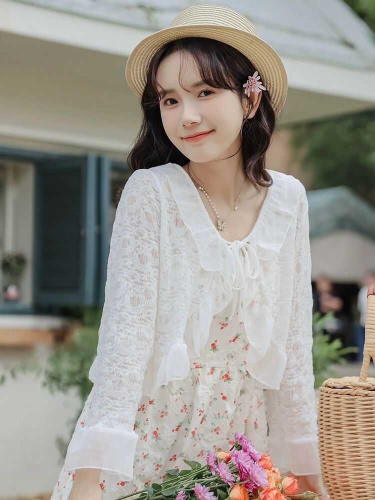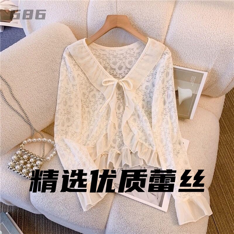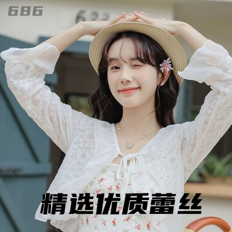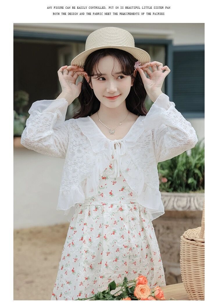 여성을 위한 작고 상큼하고 달콤한 레이스 자외선 차단 카디건, 새로운 여름 스타일, 나이를 줄여주는 스타일, 서스펜더 스커트와 숄 탑스토어 가기