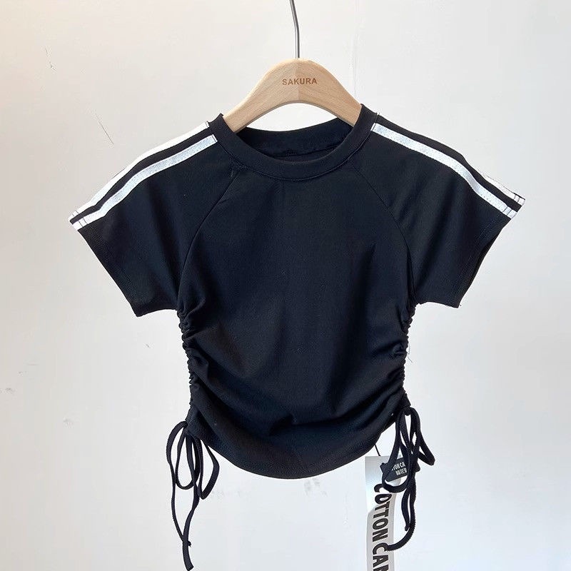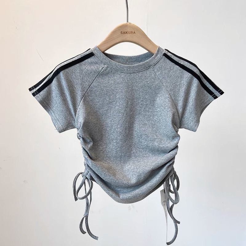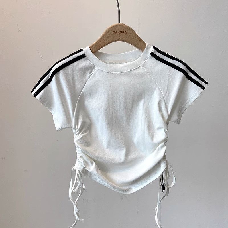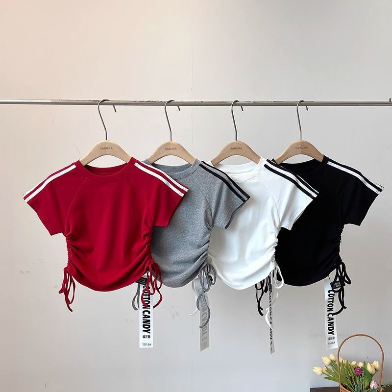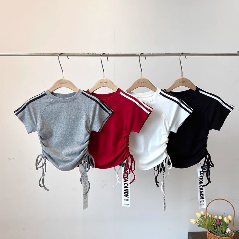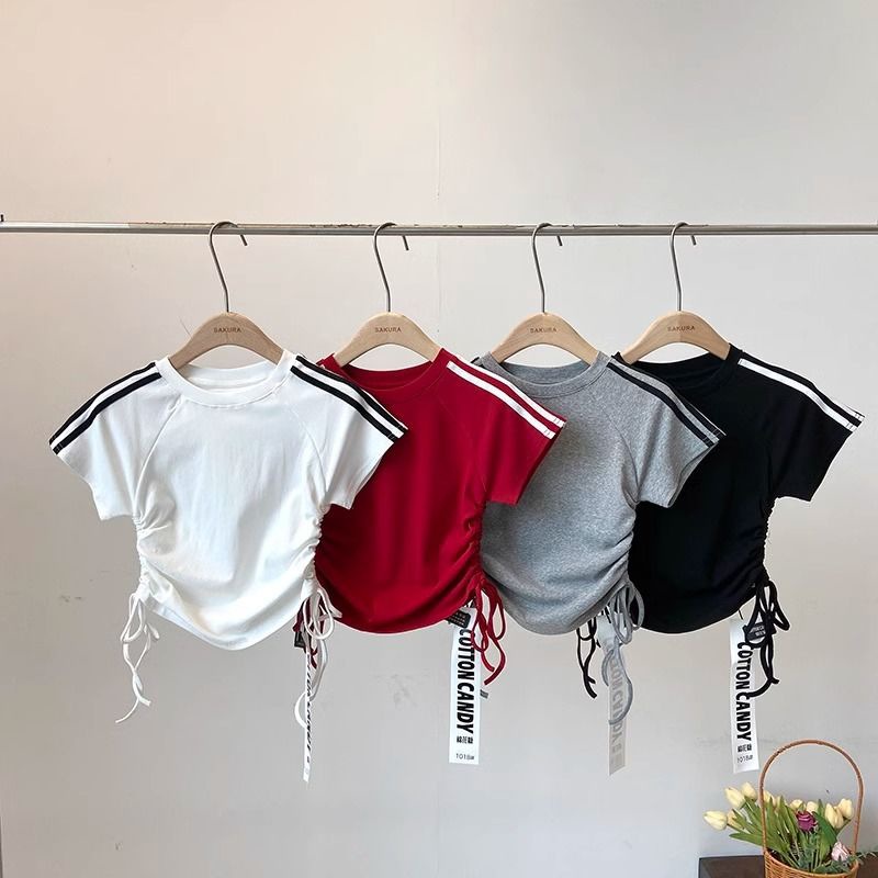 여아 여름 반팔 티셔츠, 유아용 패셔너블한 아동용 맞춤형 트렌디 한국 스타일 스포츠 스트라이프 불규칙한 드로스트링 반소매스토어 가기