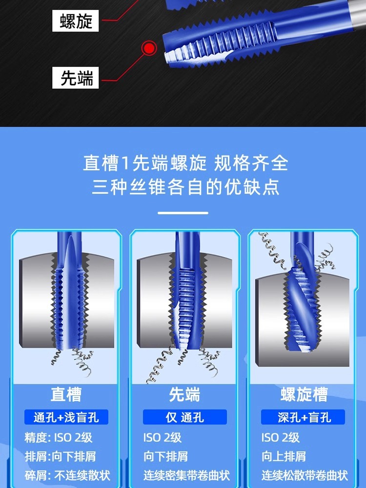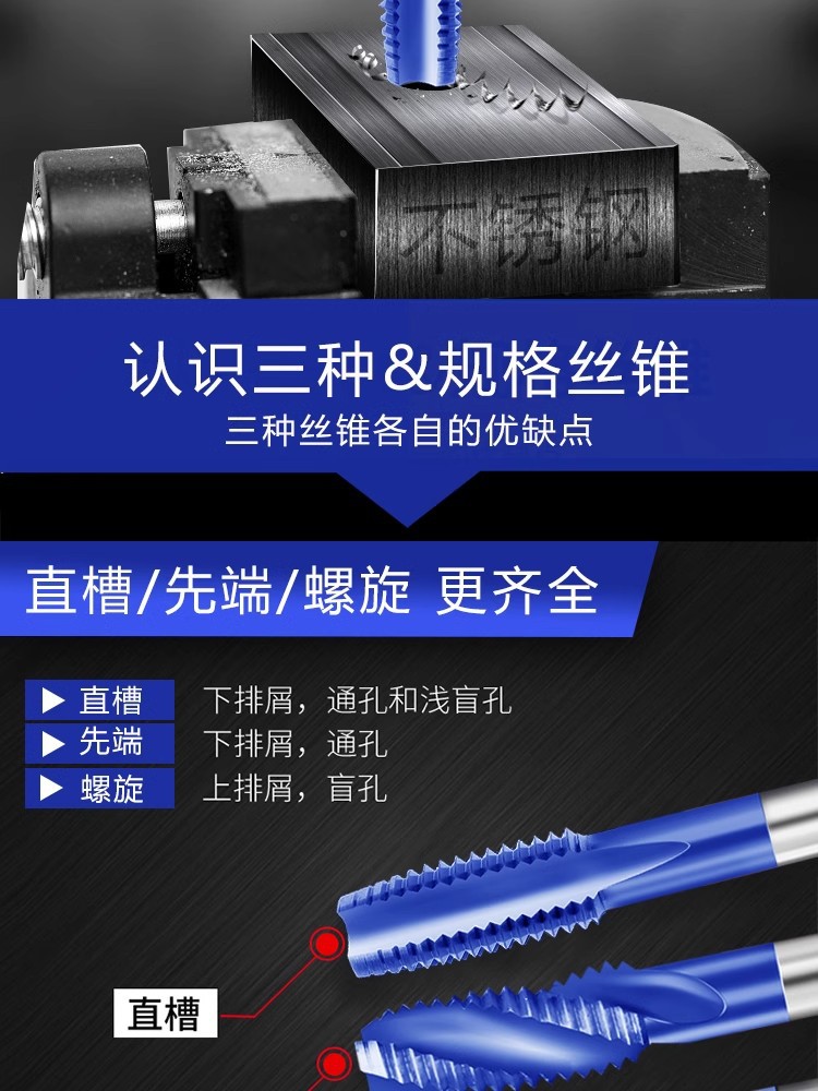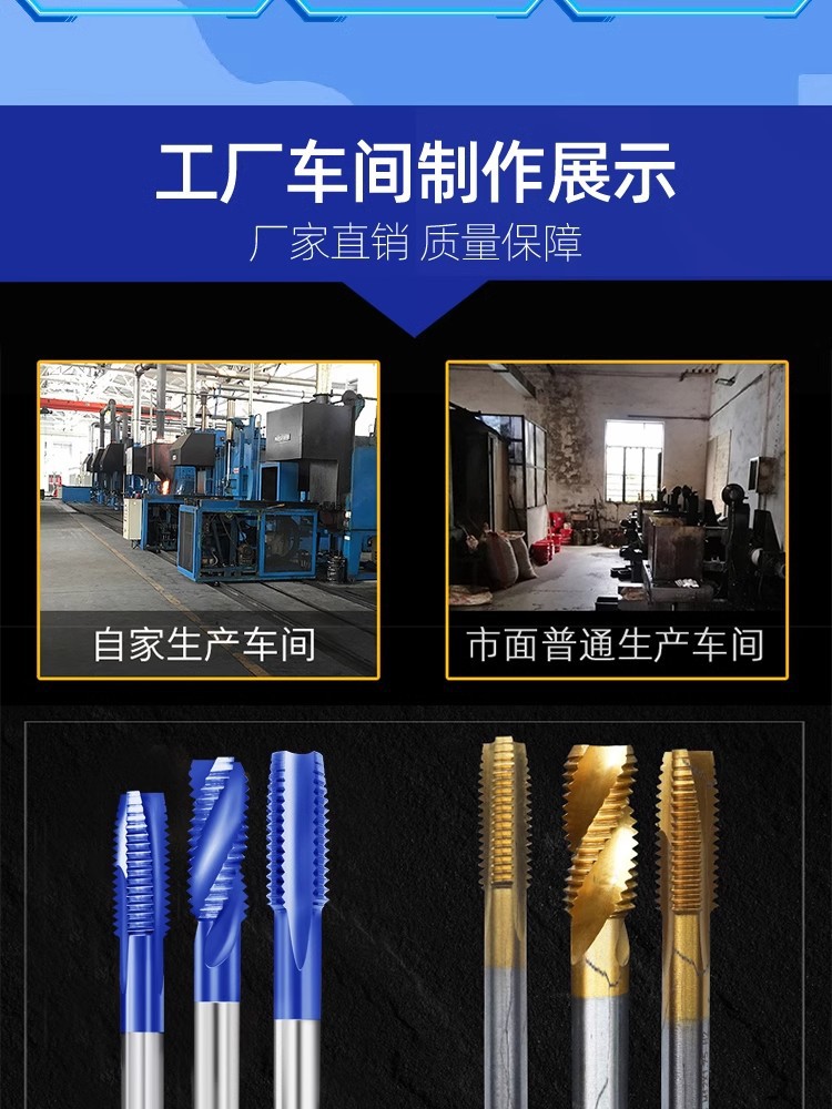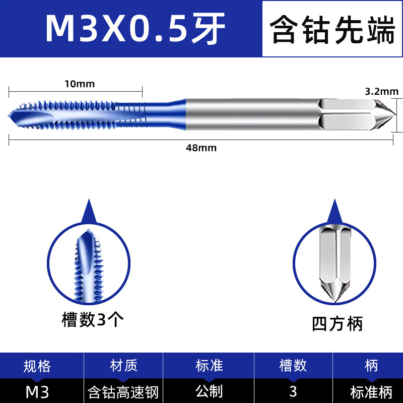 스테인레스 스틸 특수 탭에는 코발트 블루 나노 탭 나선형 팁 기계 탭 드릴 비트 m2m3m4m5m6m8이 포함되어 있습니다.스토어 가기