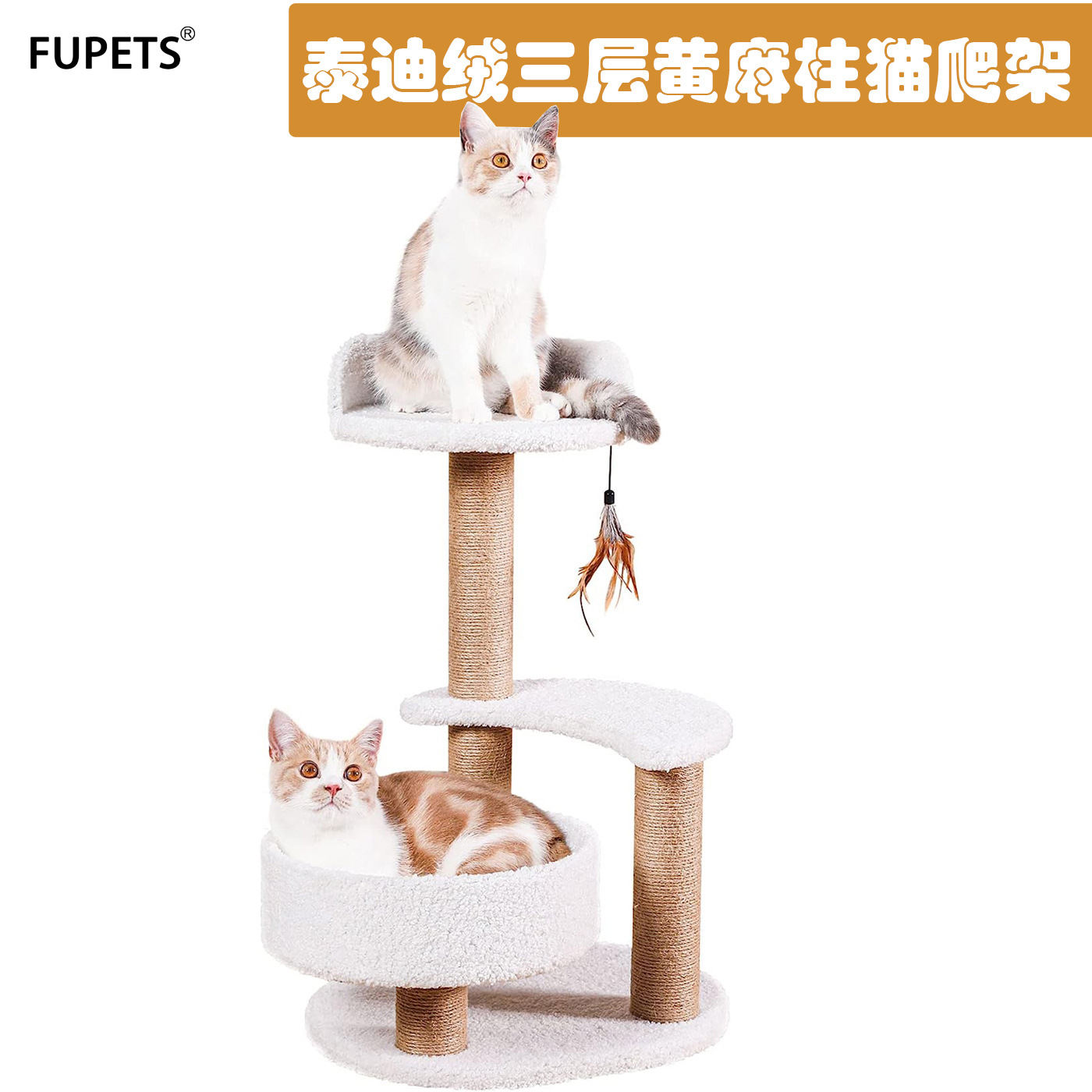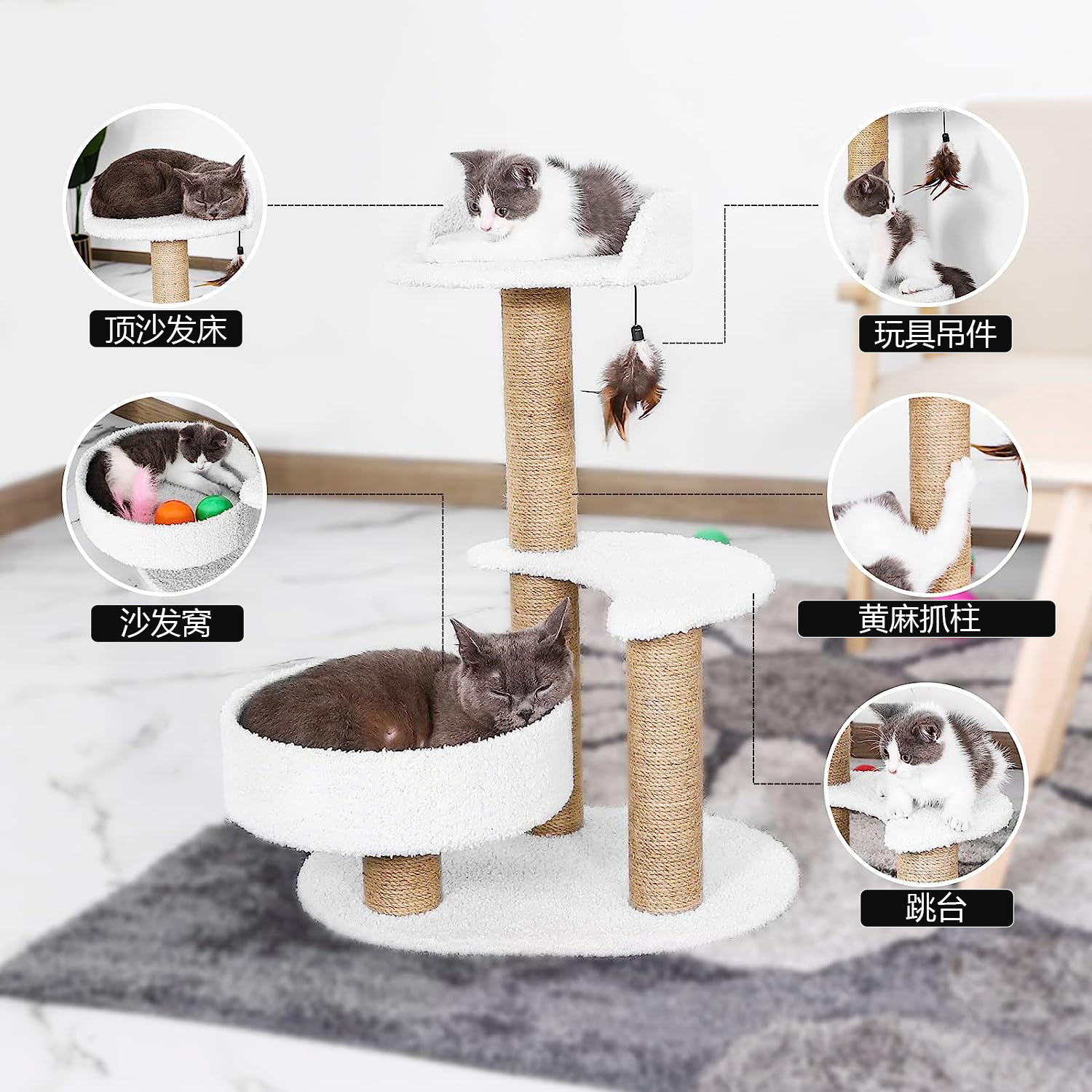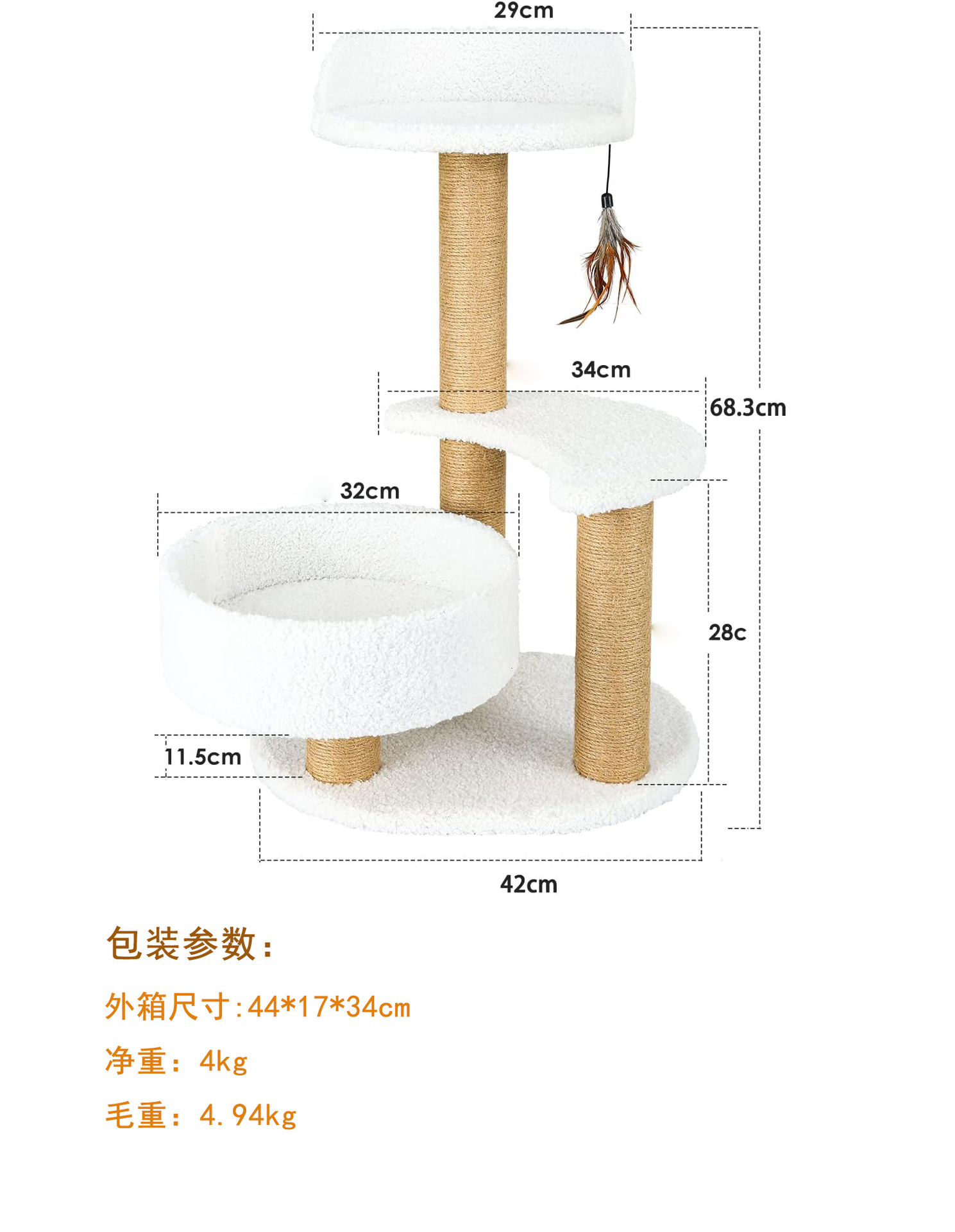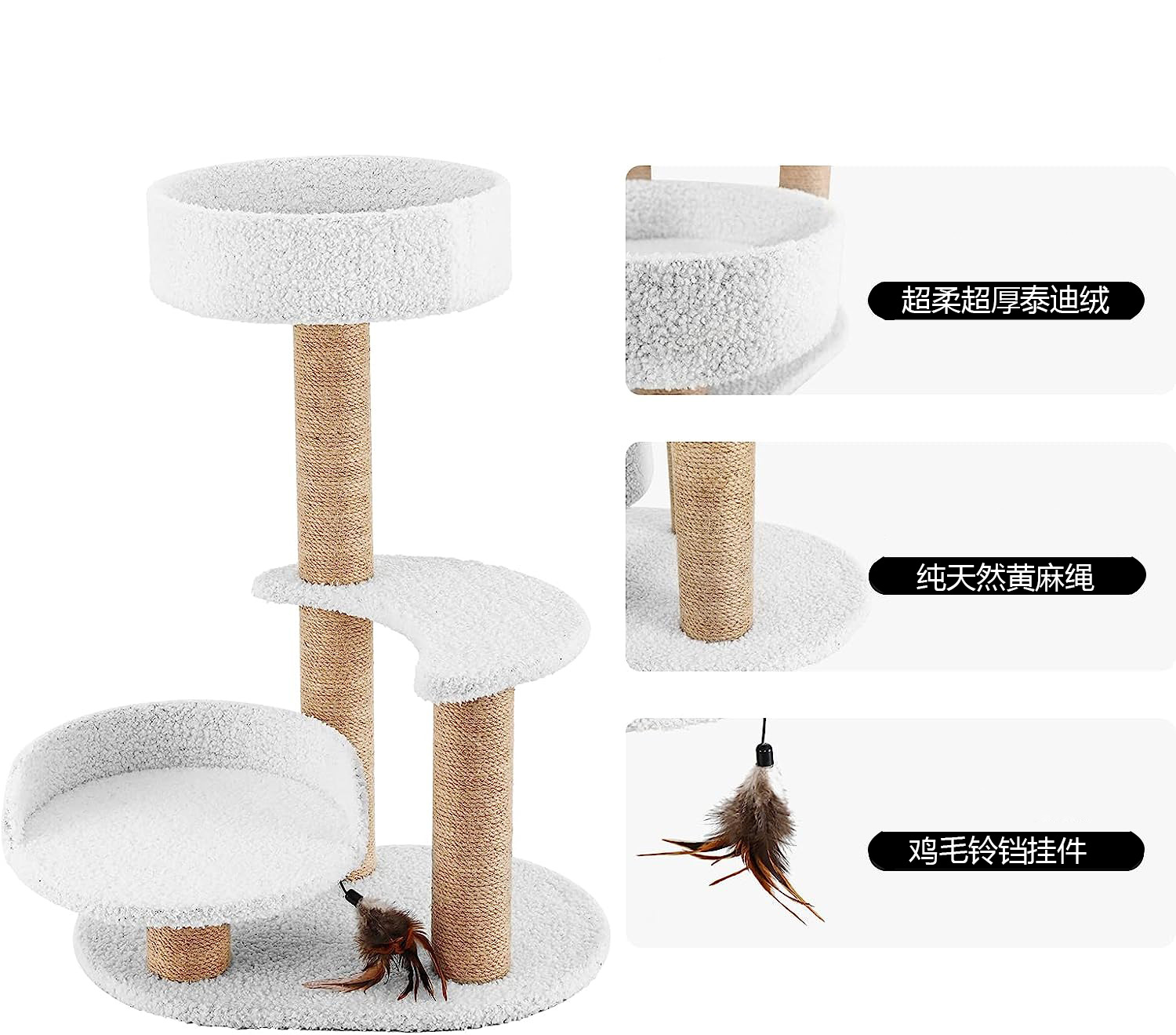 테디 벨벳 흰색 3층 닭 깃털 장난감 황마 고양이 클라이밍 프레임 플러시 둥지 플러시 점프 플랫폼 황마 고양이 스크래치 포스트