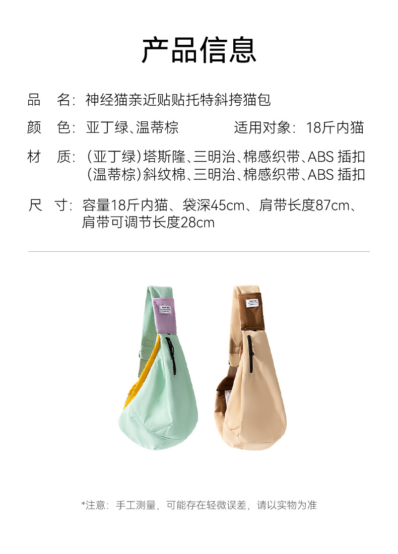 고양이 봄과 여름 신선하고 단순하며 가까운 토트 크로스 바디 고양이 가방 개 야외 경량 개 가방 애완 동물 가방