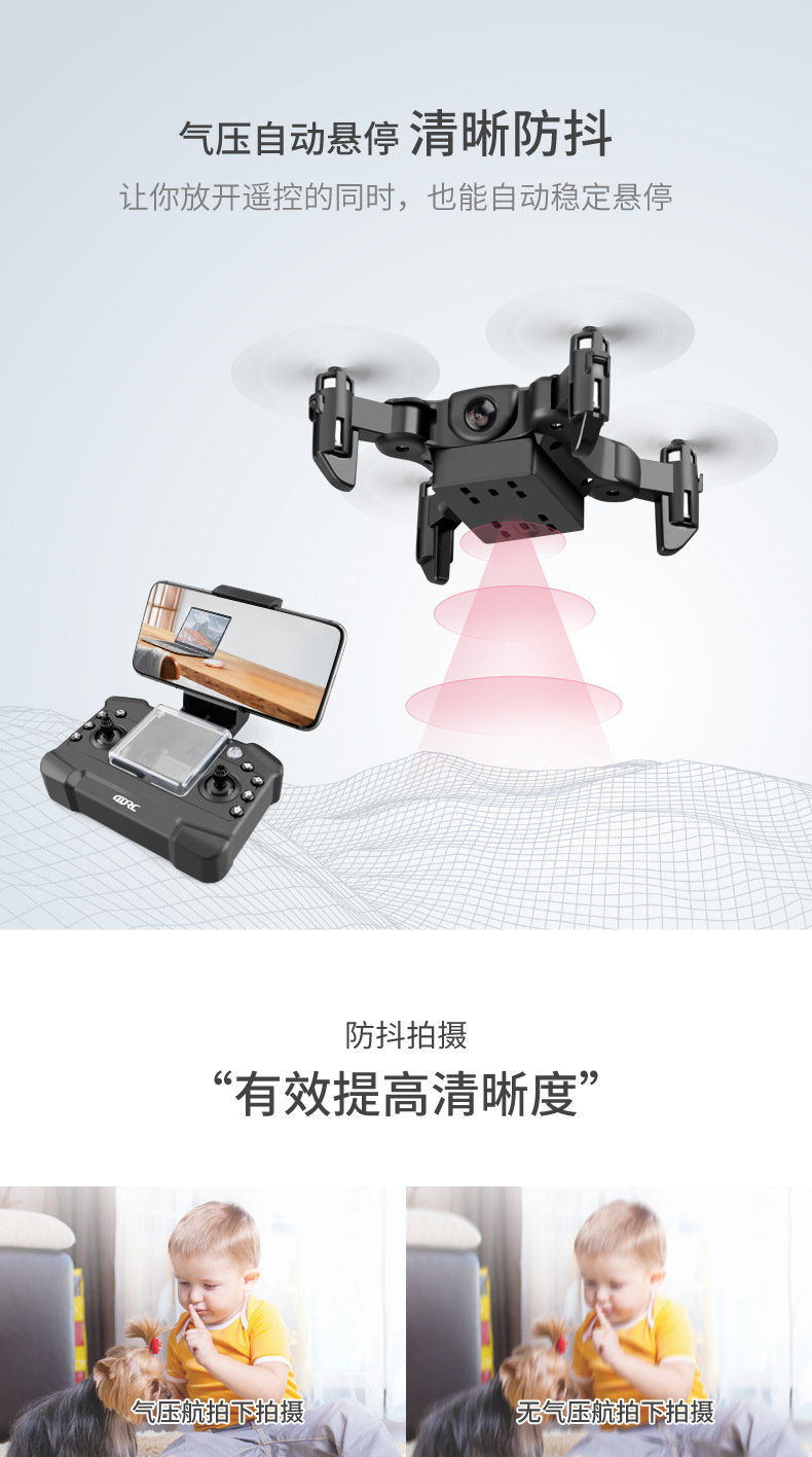 前进 后退 左转 右转 左侧飞 右侧飞 一键翻滚,360度花样翻滚 指南针无头模式,一键返航轻松召回 手机WiFi操控,手机屏幕实时传输 定高模式,飞行/悬停稳定, 降落平稳 可折叠机身,体积小,方便携带 自拍功能 创新航拍新模式