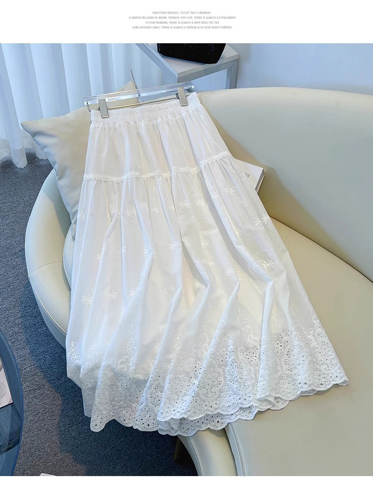 중대형 어린이용 흰색 스커트, 여아용 패셔너블한 롱 스커트, 봄 여름 중간 길이의 달콤한 중공 자수 레이스 스커트스토어 가기