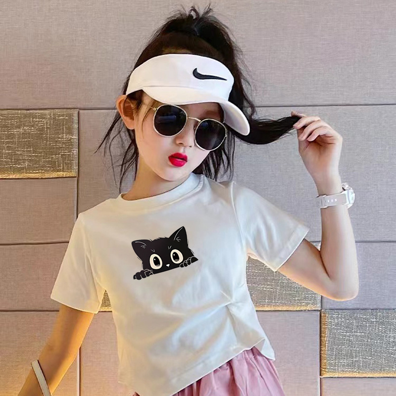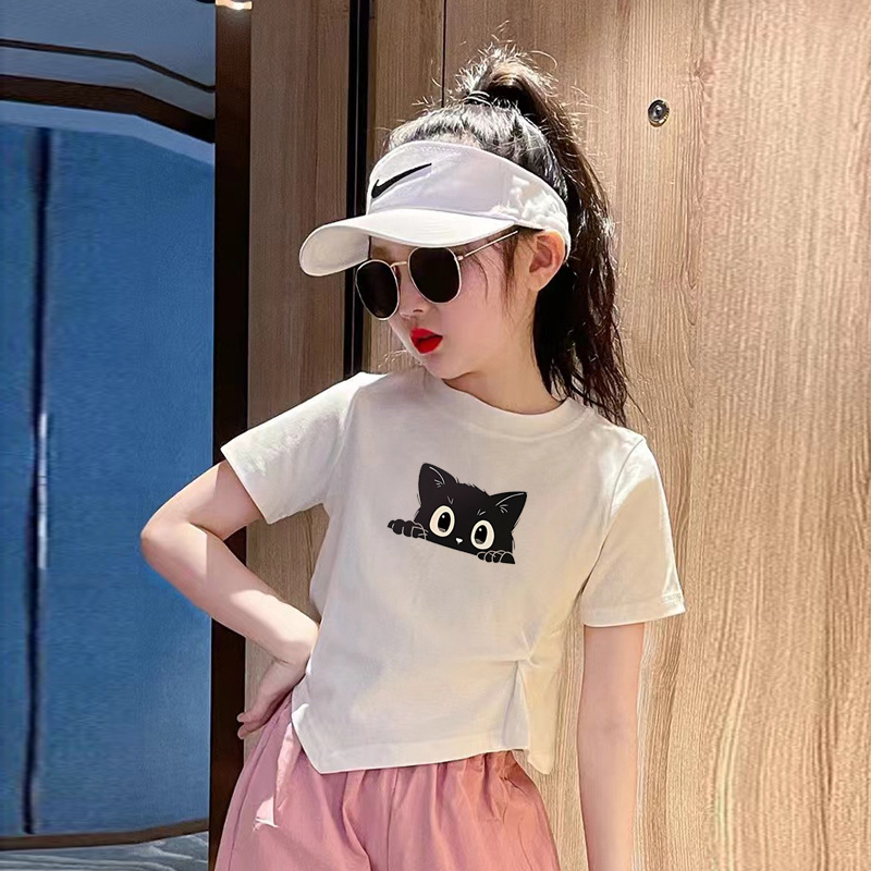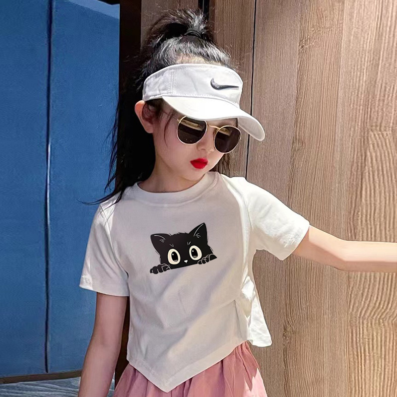국경 간 소녀 순수 코튼 만화 고양이 반팔 티셔츠 2025 새로운 여름 어린이 소녀 흰색 짧은 탑
