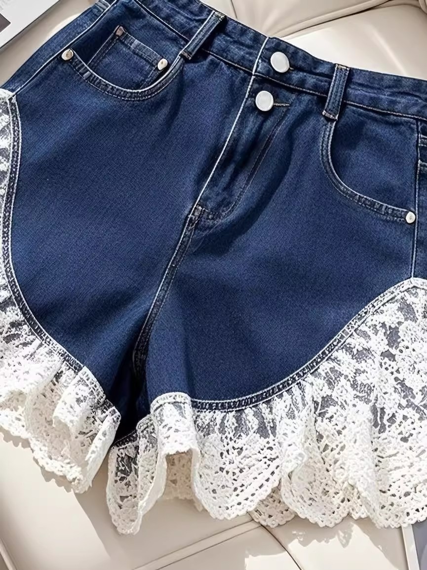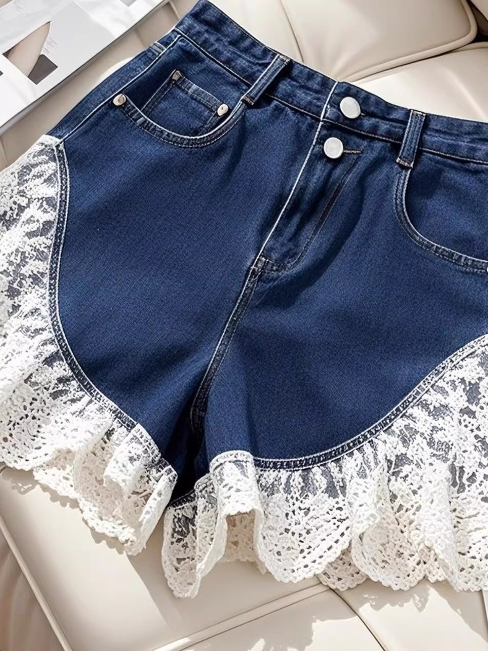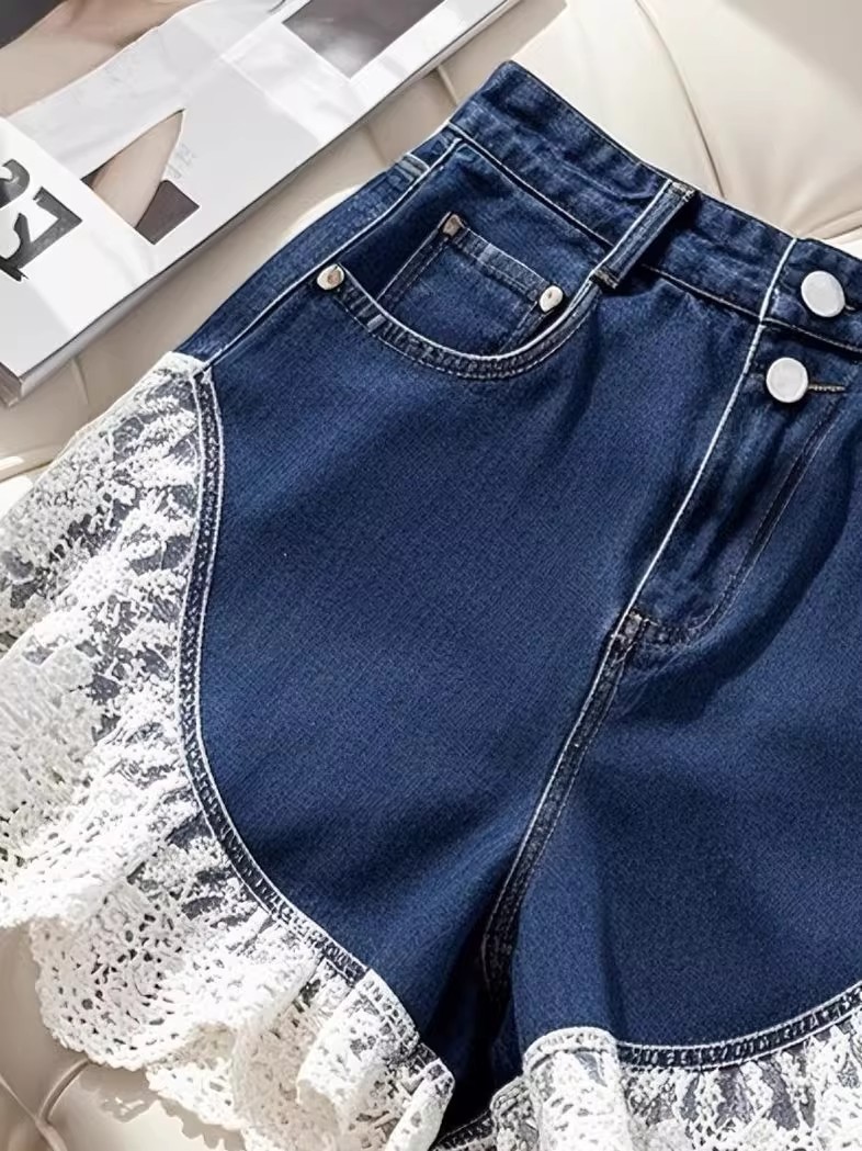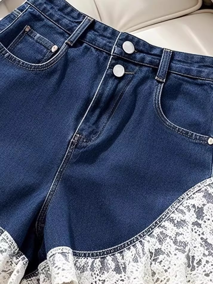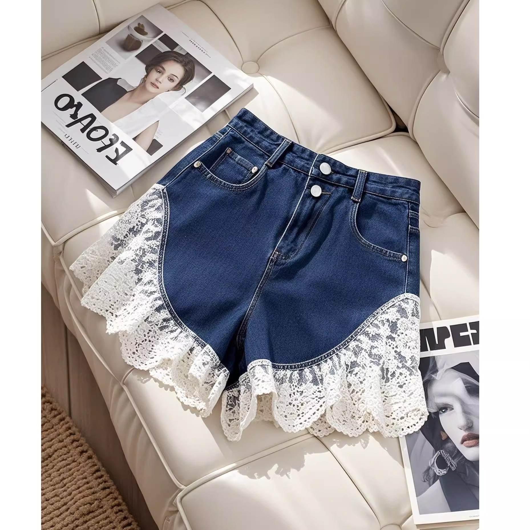 여름 여성용 고급 절묘한 레이스 청바지, 미국식 쿨한 핫걸 슬리밍 스트레이트 와이드 레그 반바지 핫팬츠스토어 가기