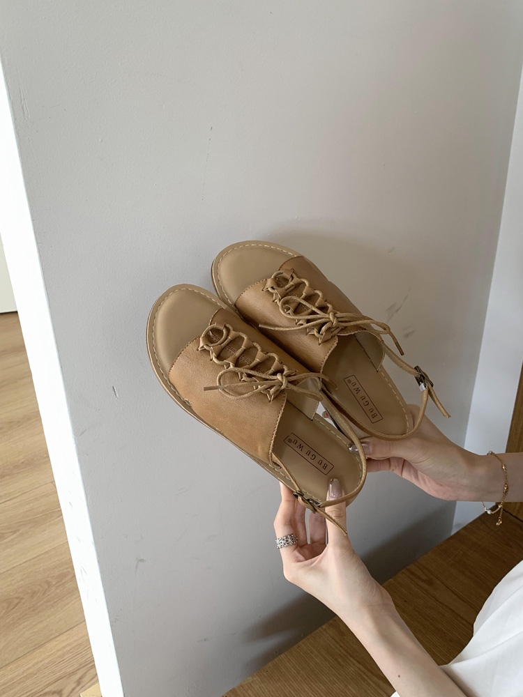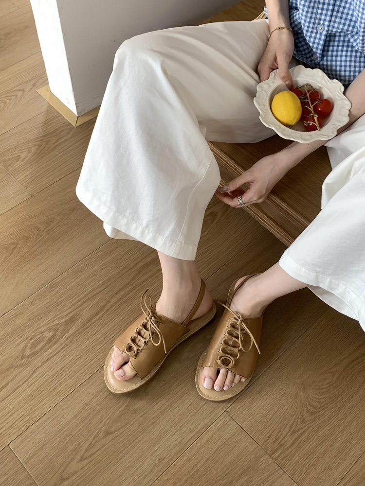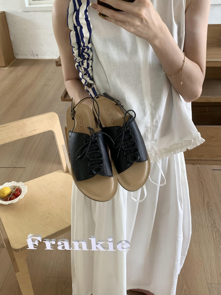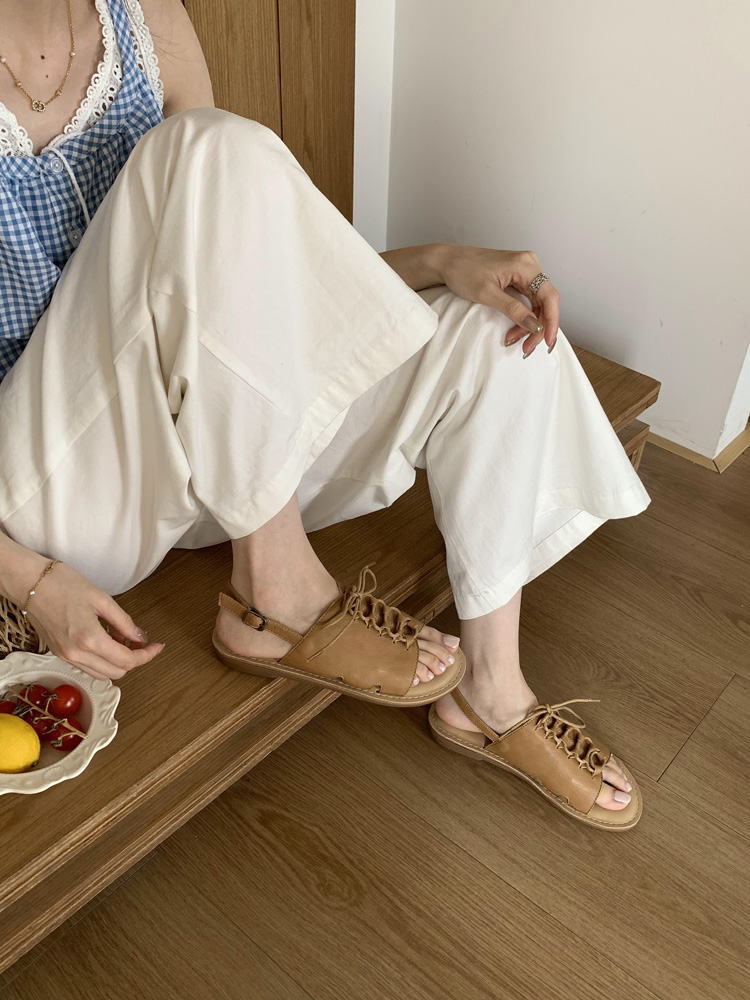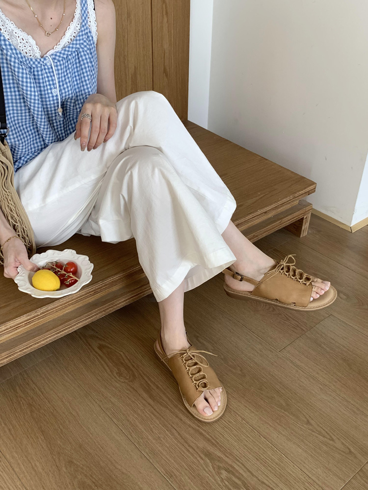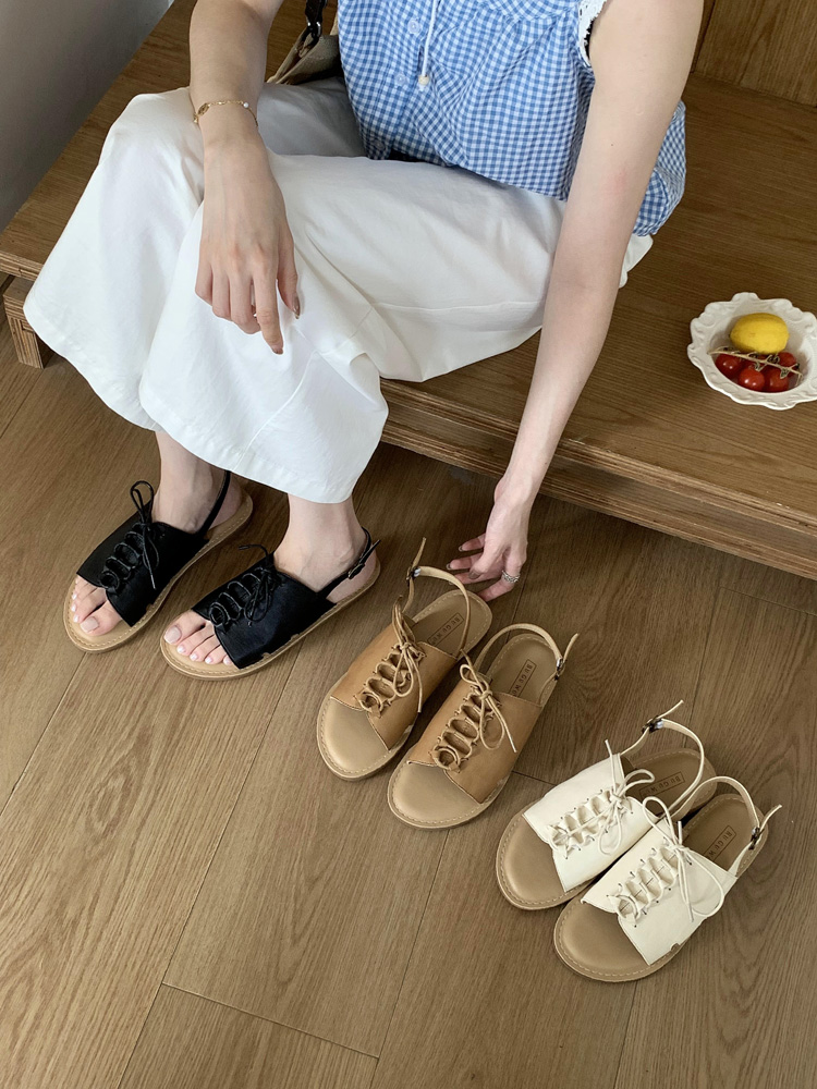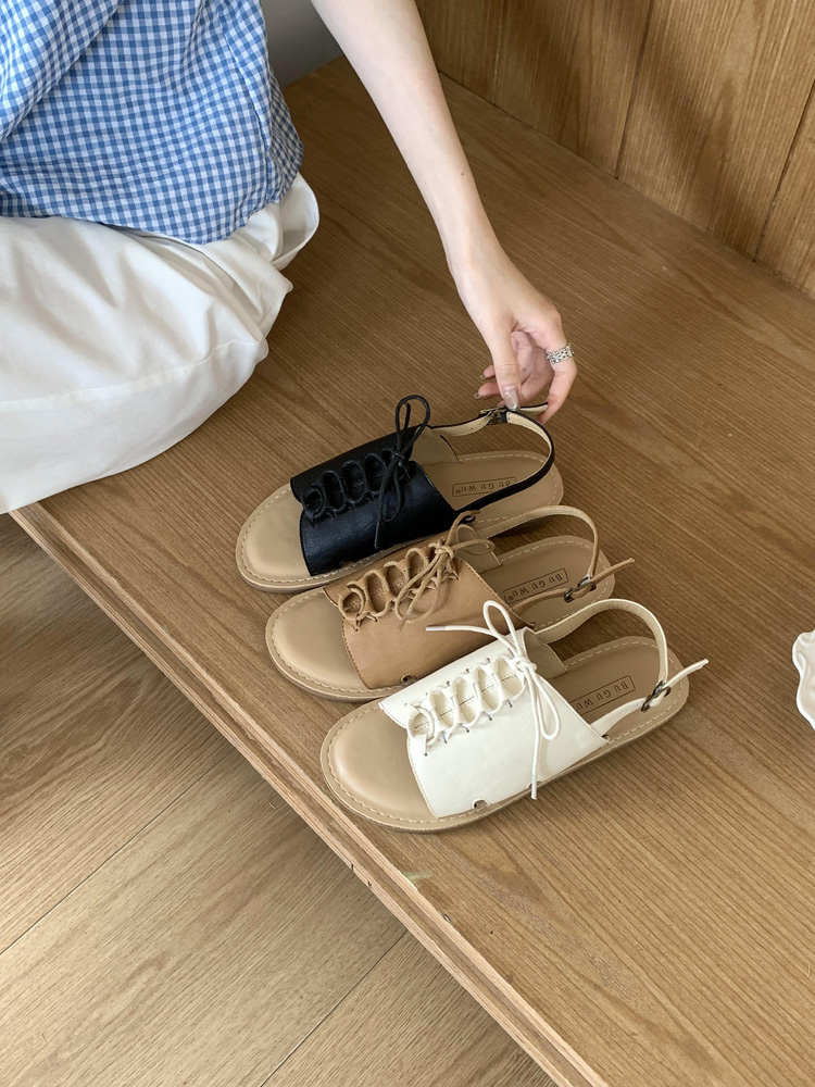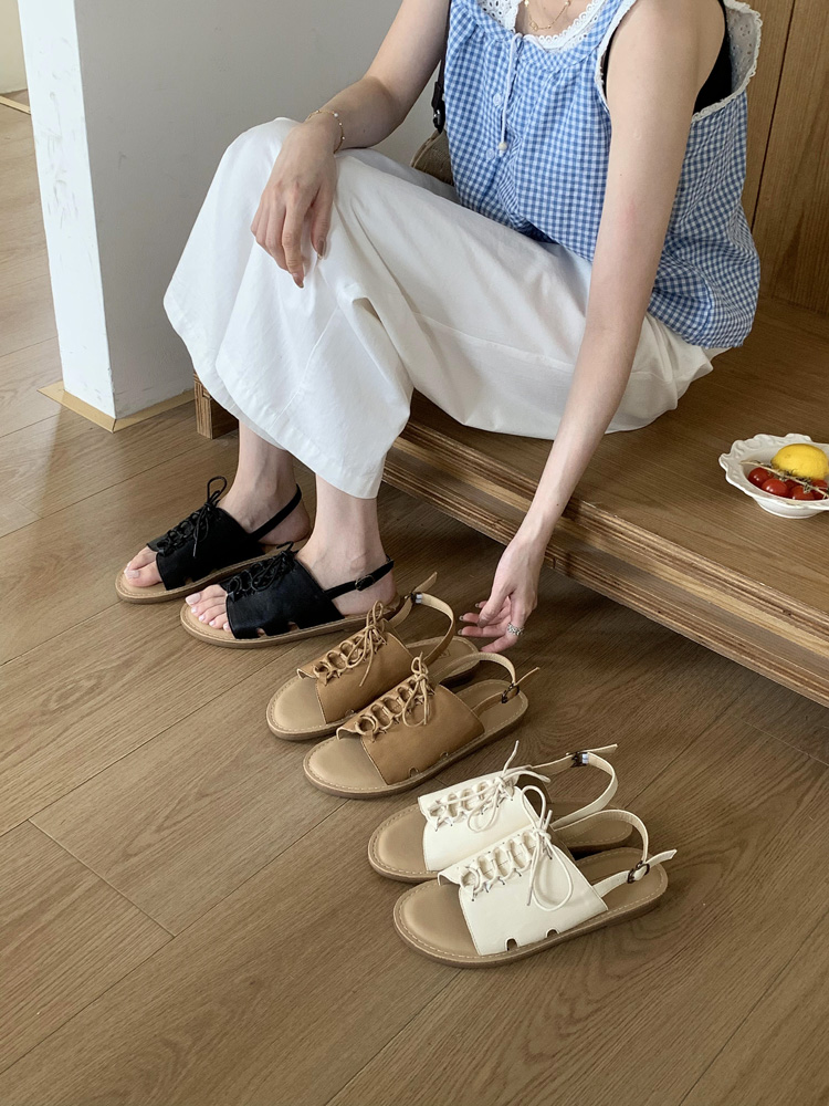 여성용 로마 샌들 2025 여름 새 스타일 플랫 밑창 레이스 업 요정 스타일 화이트 스커트 라운드 발가락 여성용 간단한 샌들스토어 가기