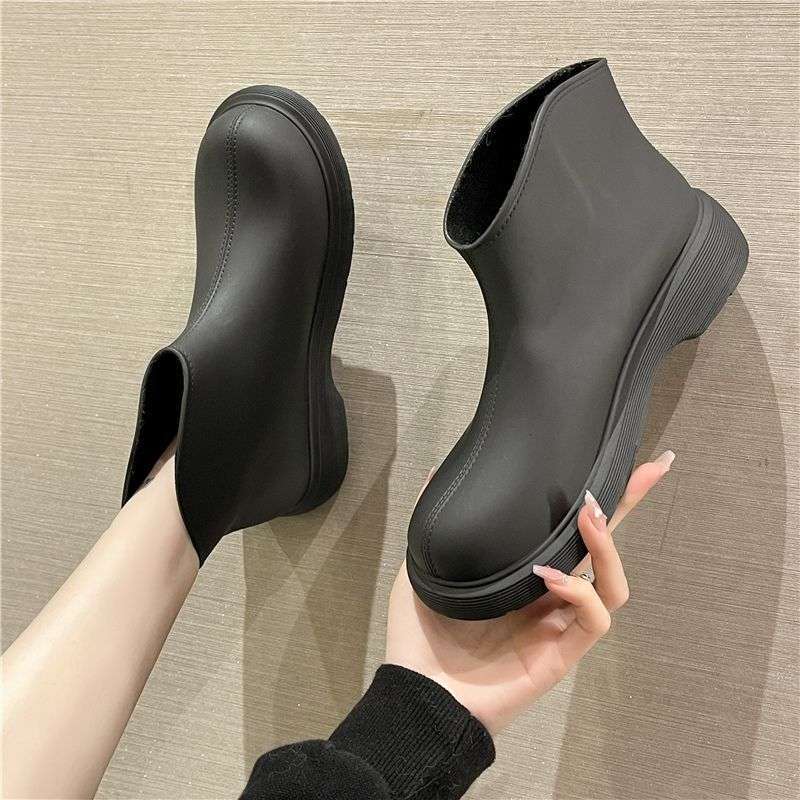 한국 스타일 비 신발 여성 짧은 기모 방수 고무 신발 낮은 최고 따뜻한 패션 물 신발 야외 미끄럼 비 신발