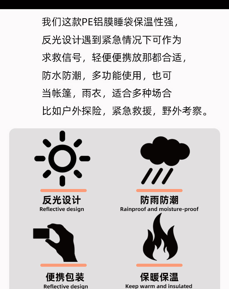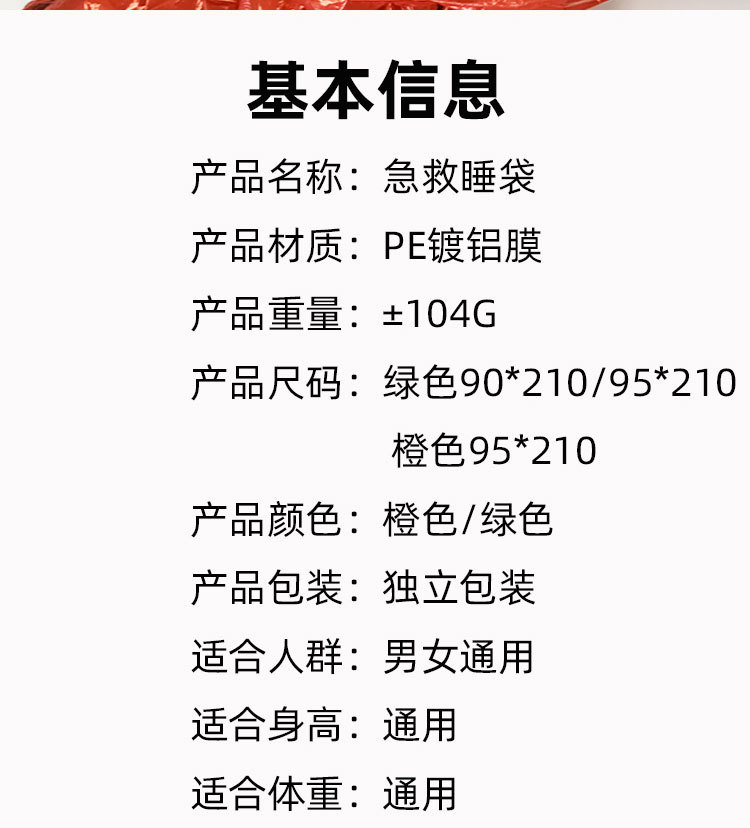 야외 열 손실 방지 침낭 PE 알루미늄 필름 스포츠 응급 처치 텐트 침낭 따뜻한 오렌지 열 프레스 응급 침낭