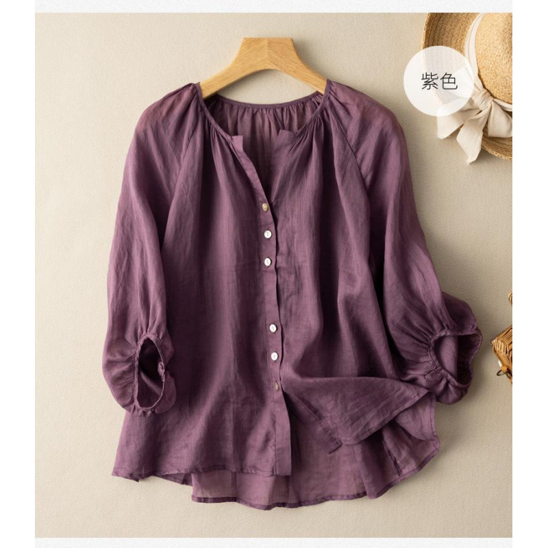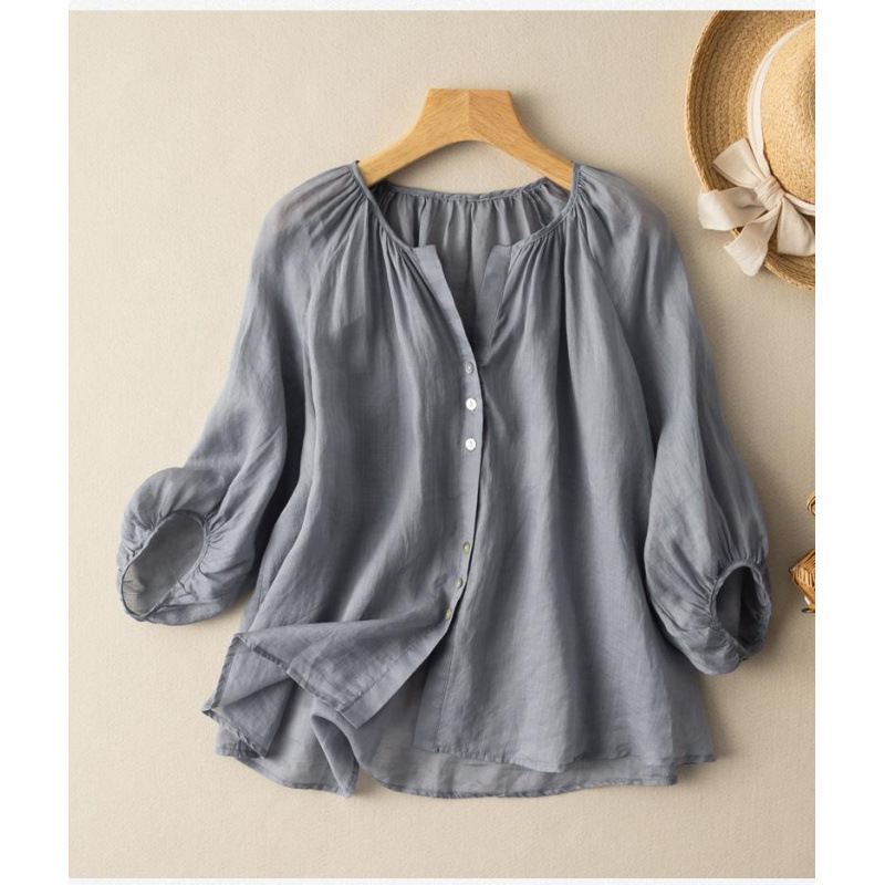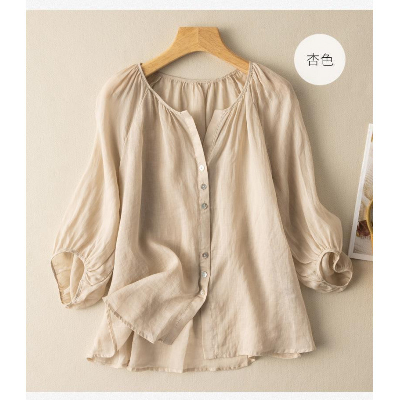2024 봄 여름 신작 랜턴 슬리브 v 넥 린넨 셔츠 여성 7부 소매 문학 복고풍 홍콩 스타일 코튼 린넨 셔츠스토어 가기