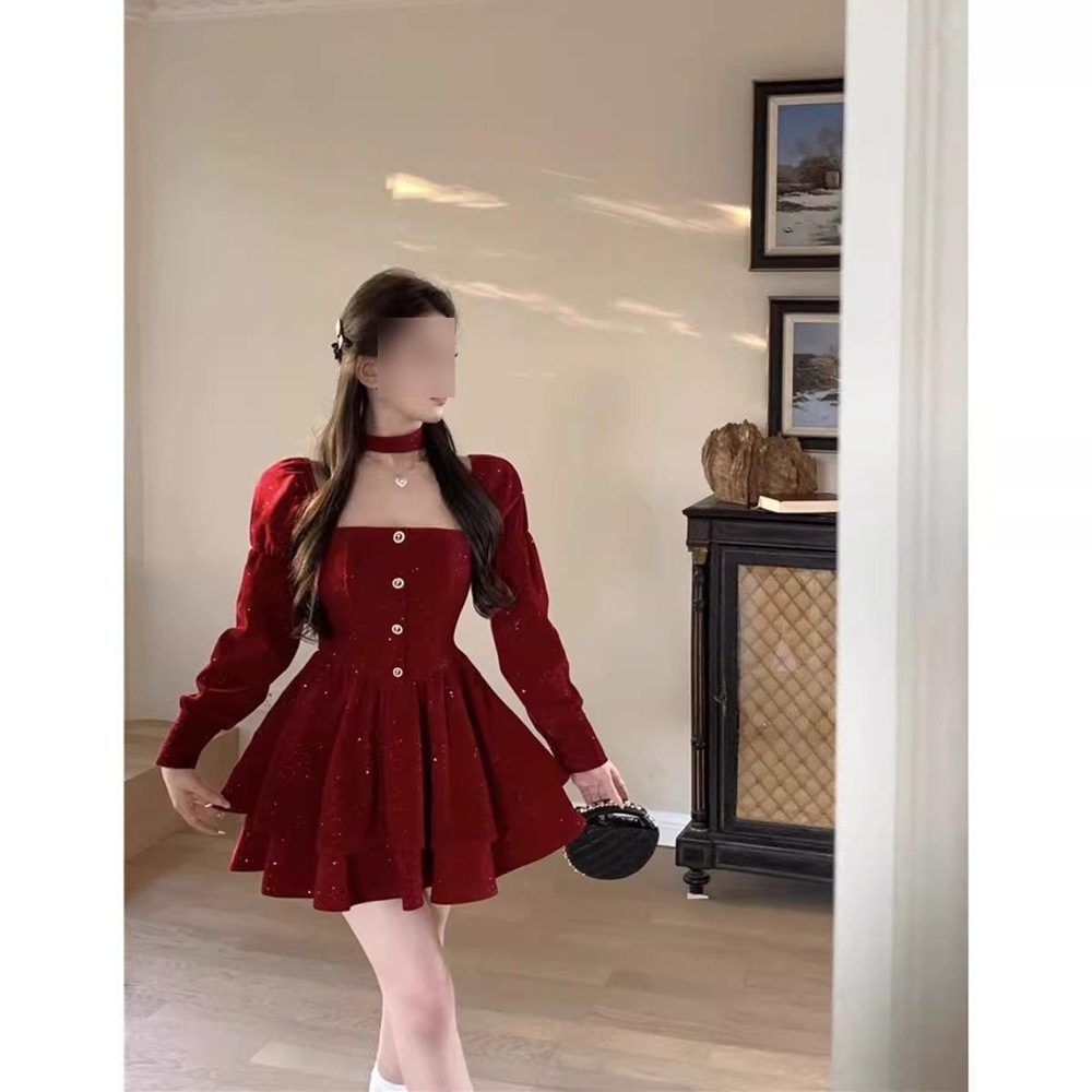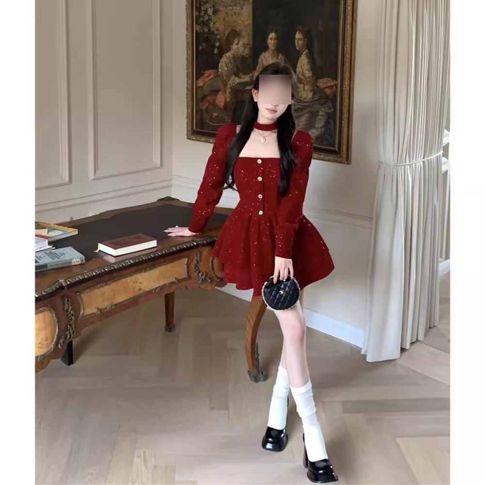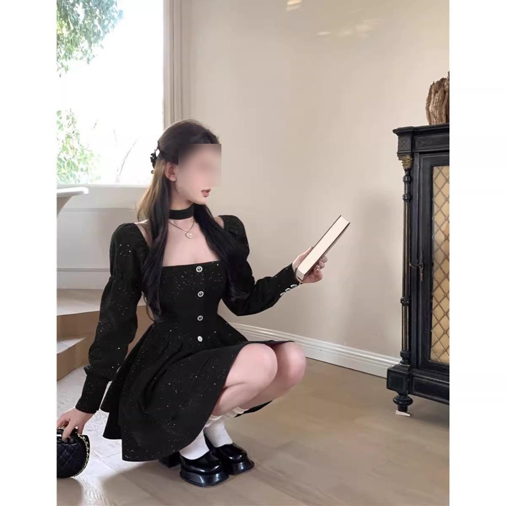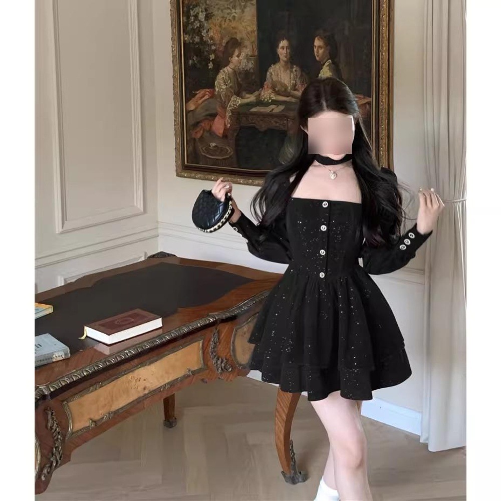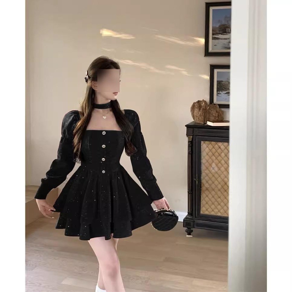 黑色方领连衣裙女秋冬精致碎闪蓬蓬a字短裙百搭公主裙生日小礼裙스토어 가기