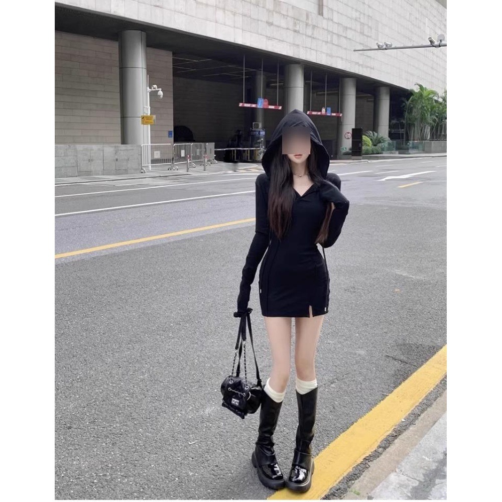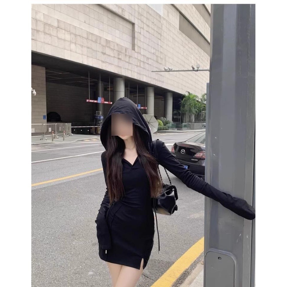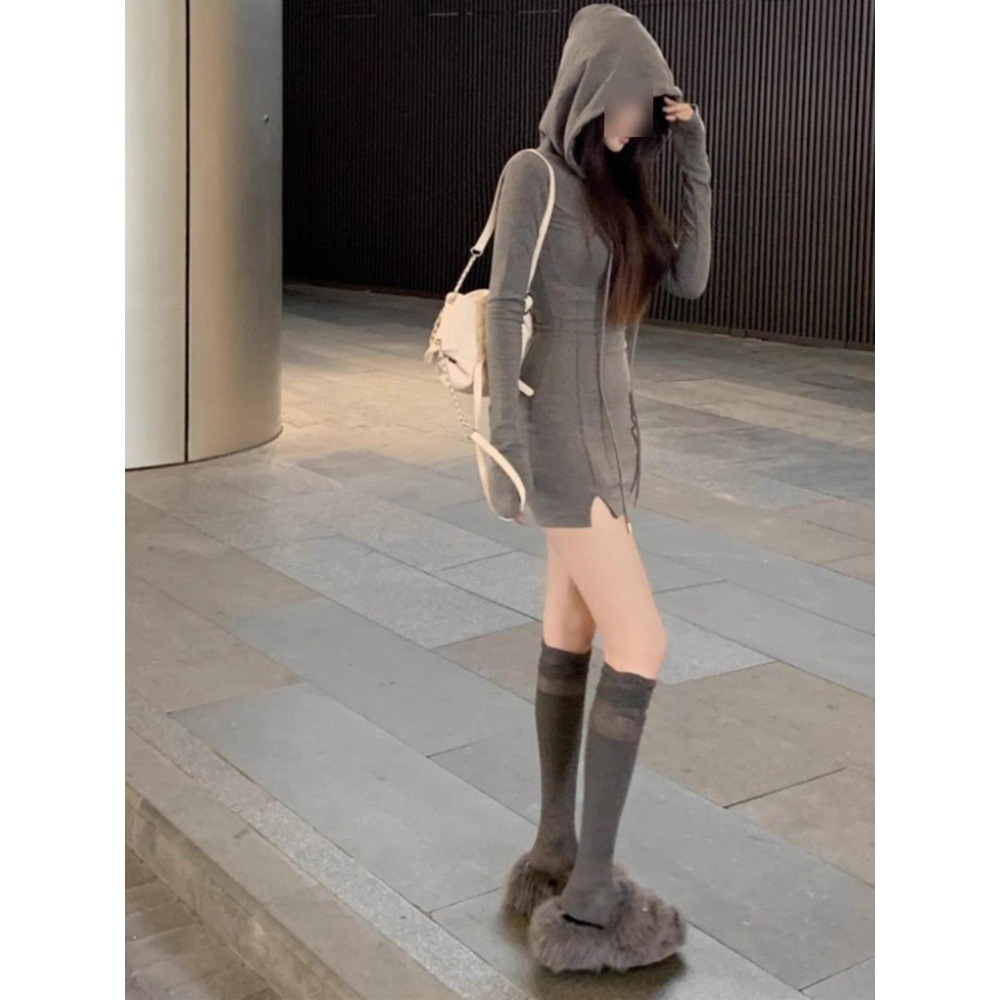 复古灰色连帽长袖连衣裙女春季修身辣妹包臀短裙气质紧身收腰裙子스토어 가기