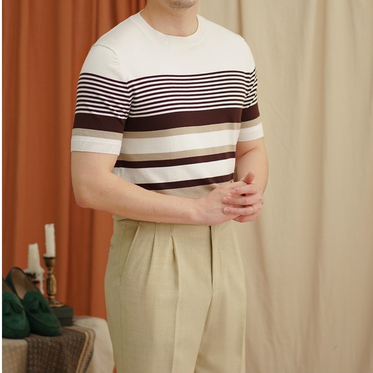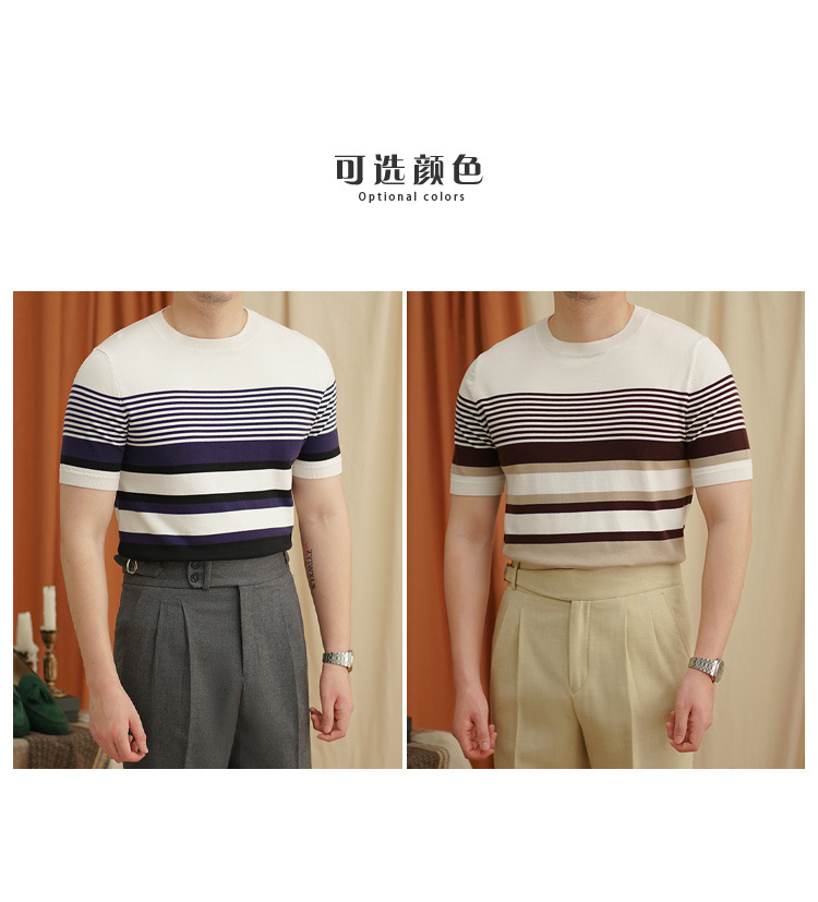 대비 색 줄무늬 반팔 티셔츠 남성 2025 여름 신작 캐주얼 슬림 비즈니스 통근 라운드 넥 반팔 스웨터