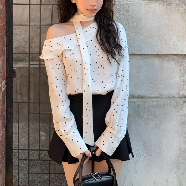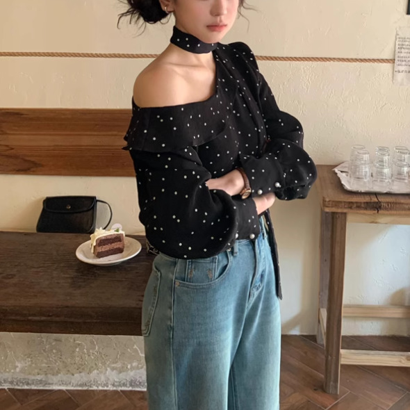 프랑스 스타일 웨이브 도트 러플 원 숄더 칼라 슬랜트 셔츠 여성의 2025 새로운 레트로 스트랩 긴 소매 셔츠 봄과 여름스토어 가기
