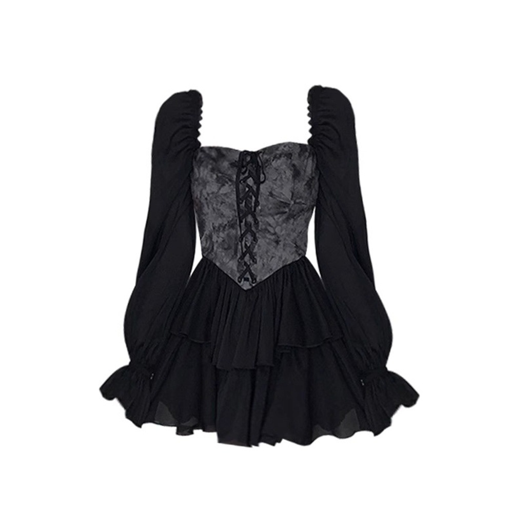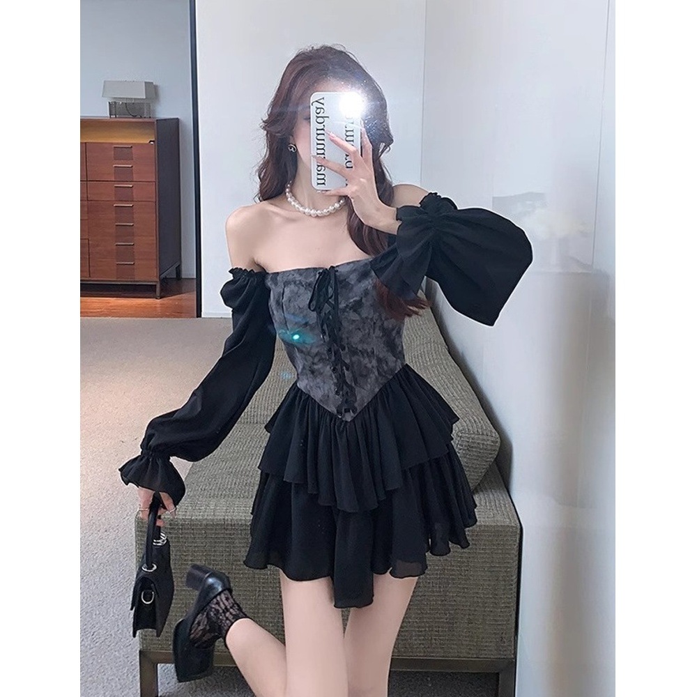甜辣穿搭公主裙女秋装性感辣妹小黑裙收腰连衣裙扎染不规则蓬蓬裙스토어 가기