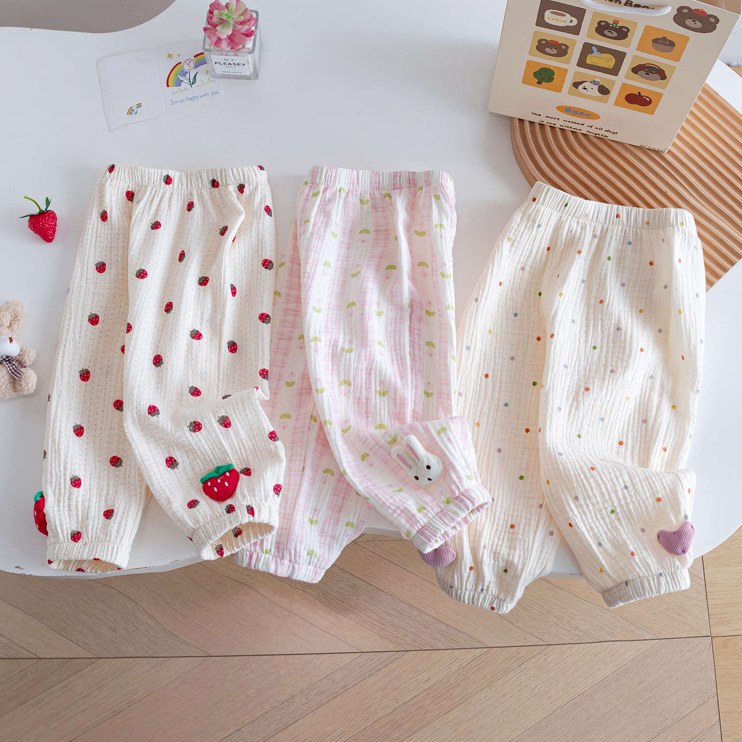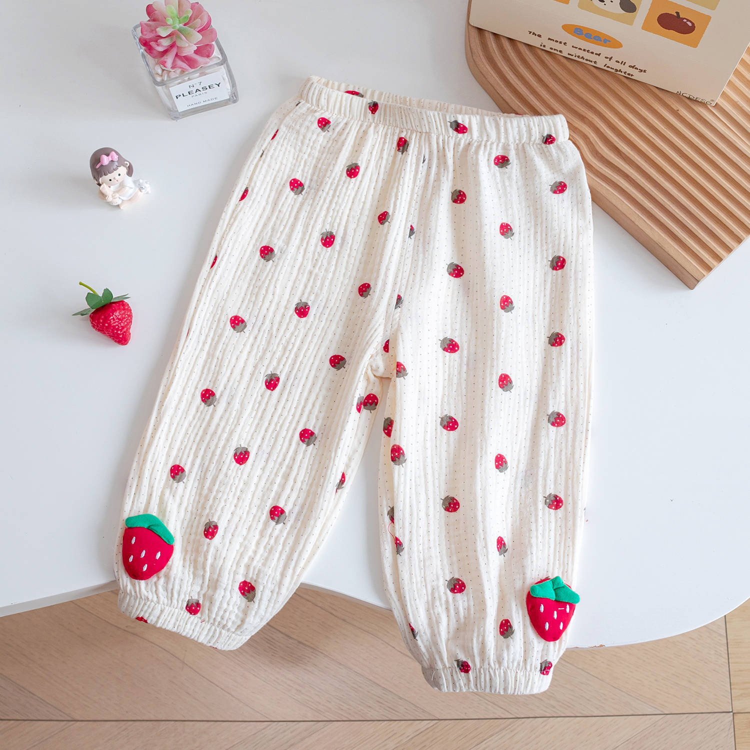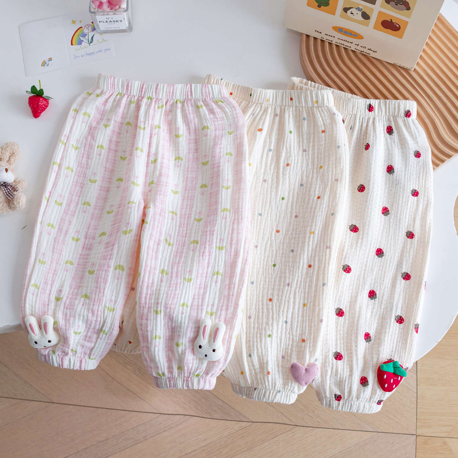 아동용 면 거즈 모기 방지 바지, 세련된 꽃무늬 딸기 프린트 꽃무늬 면 에어컨 바지, 여름 레깅스, 여아용 부드러운 바지스토어 가기