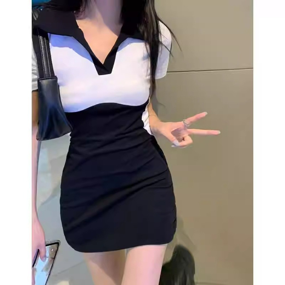 撞色拼接设计感紧身收腰弹力短袖连衣裙女Polo辣妹纯欲显瘦包臀裙스토어 가기