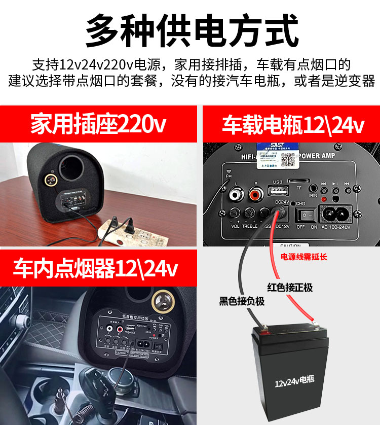 • 기본 구성품 (220V 전원 케이블, 12V/24V 배터리 연결 케이블, 리모컨 포함) 12inch 초저음 블루투스 우퍼