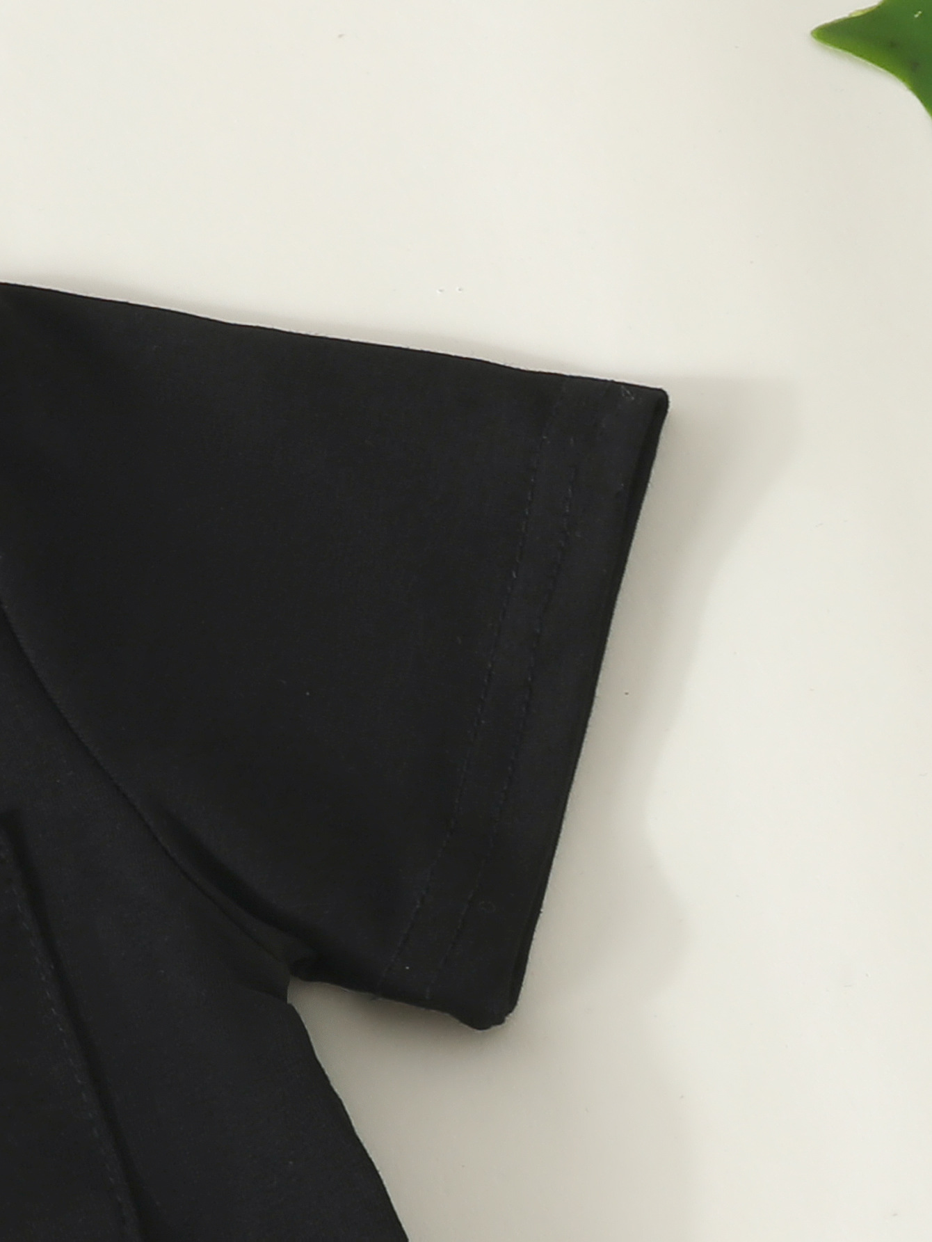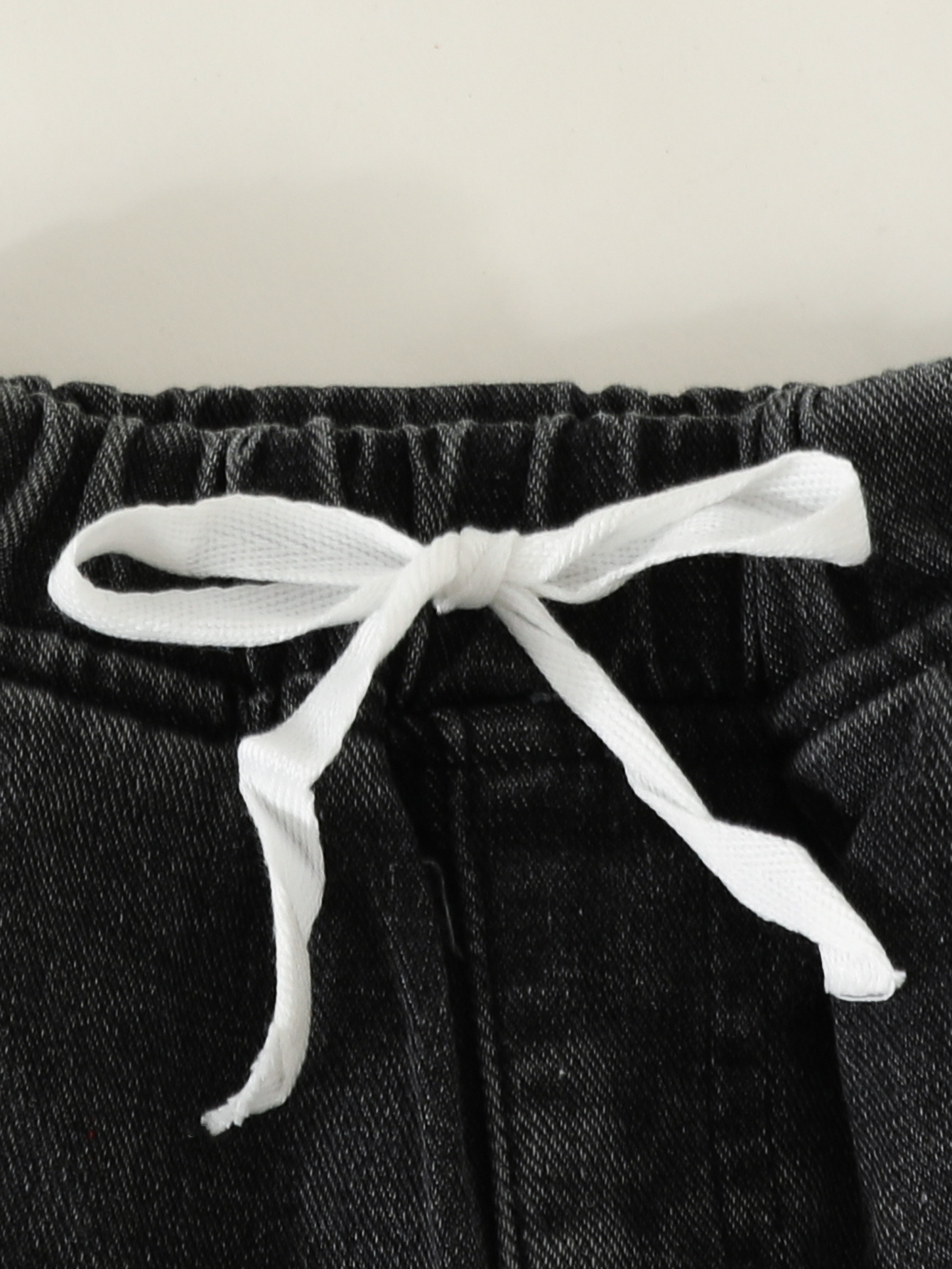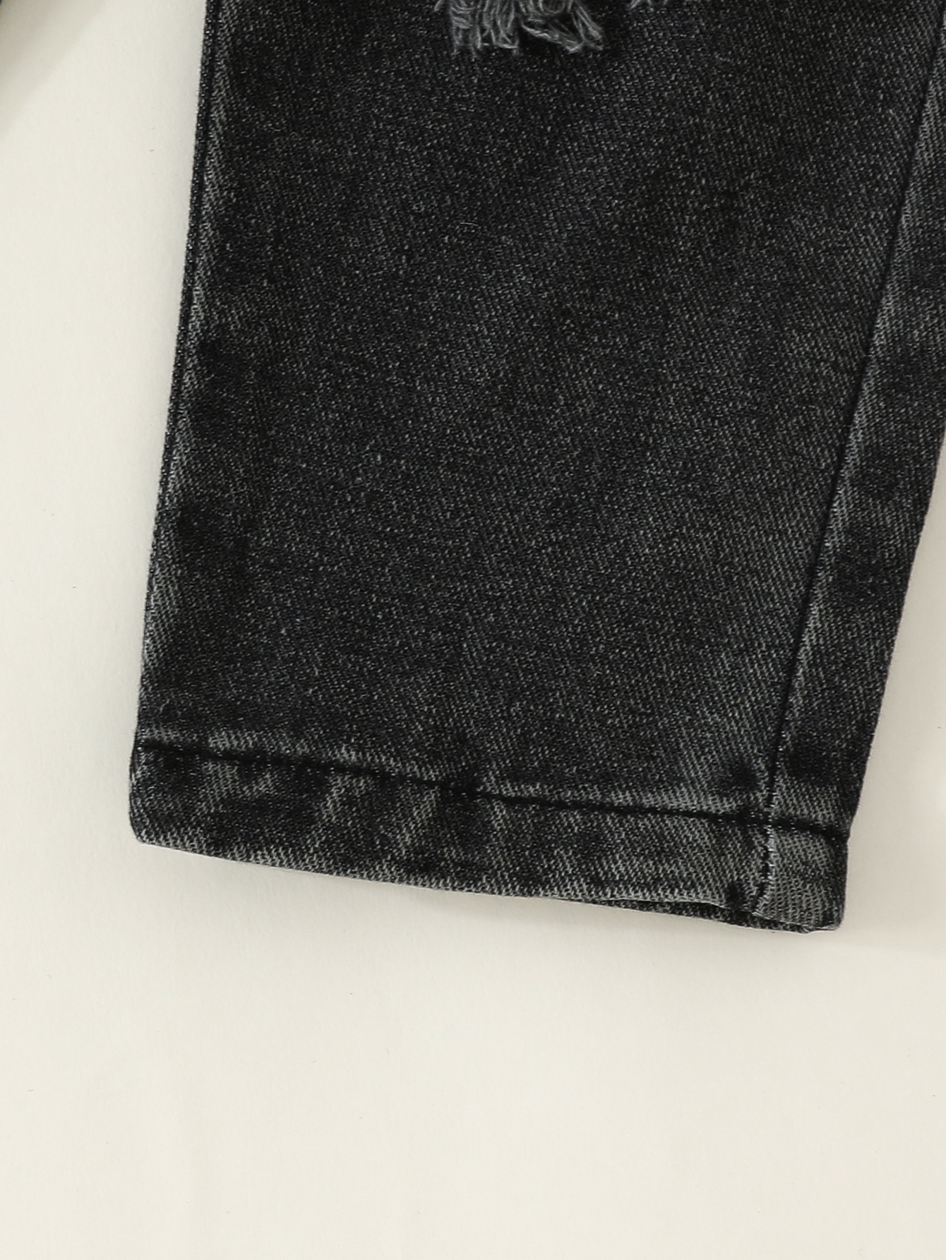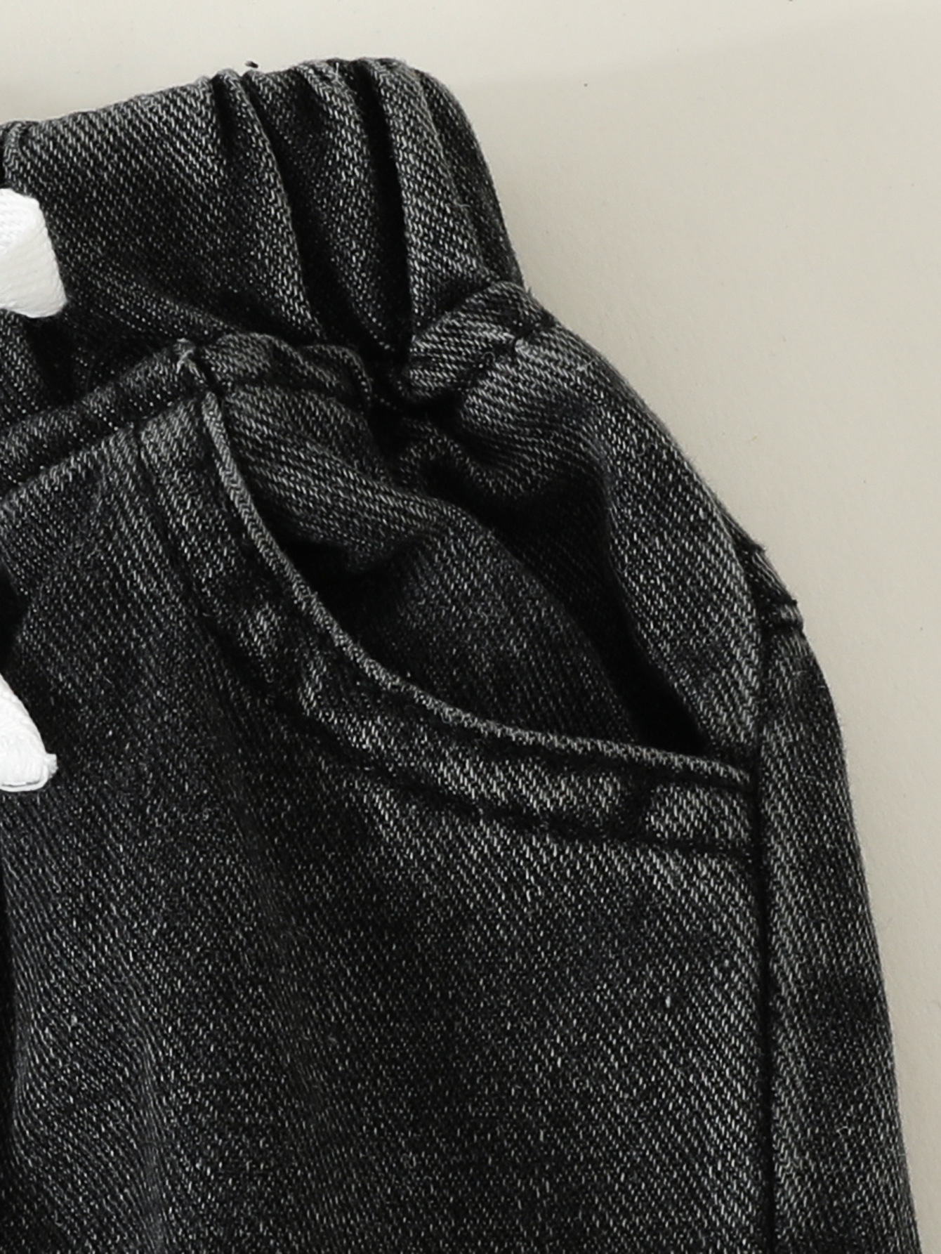 여름 소년 포켓 반팔 티셔츠 + 찢어진 검은색 데님 바지