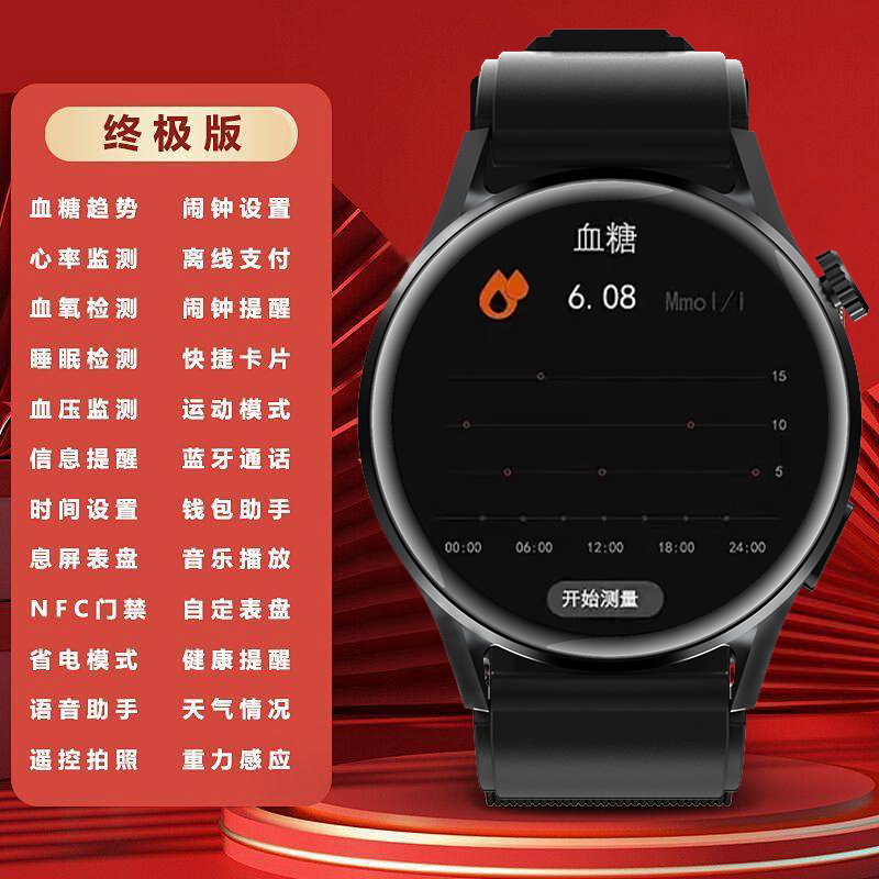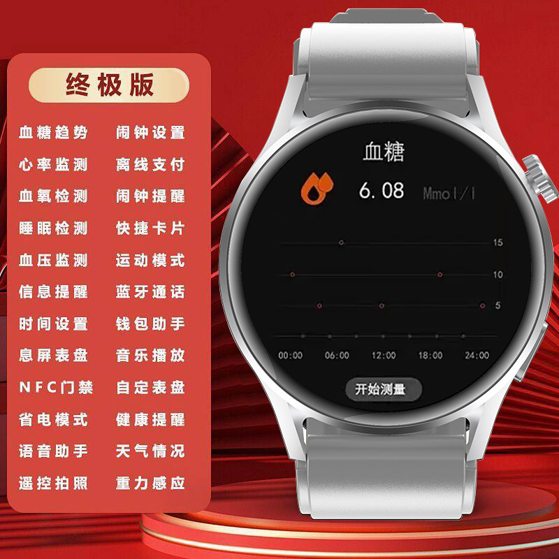 비침습적 무바늘 혈당 시계, 혈압, 혈중 산소, 심박수, 수면, 블루투스 통화 및 수신, 혈당 스마트 팔찌