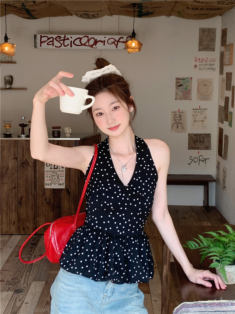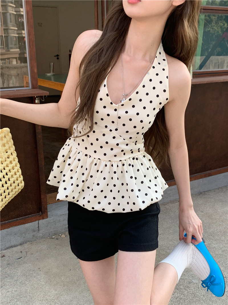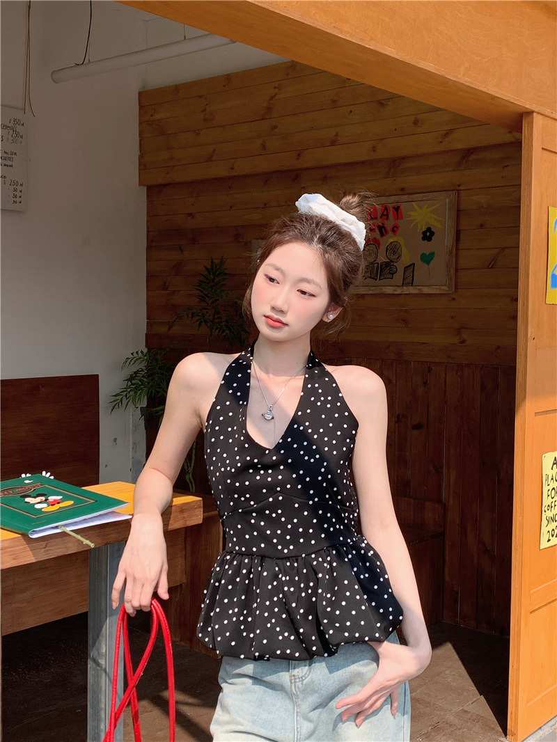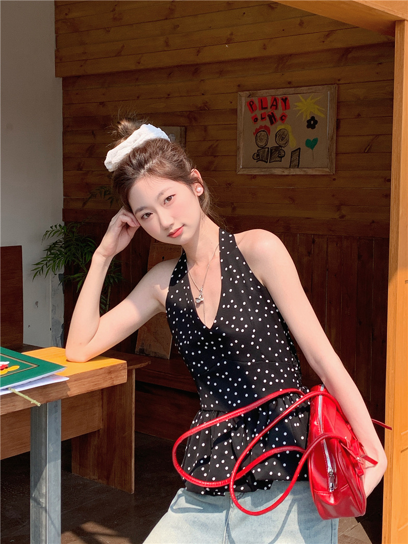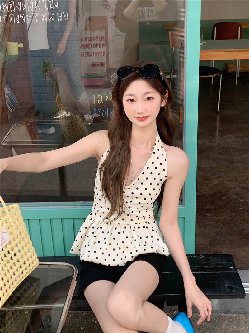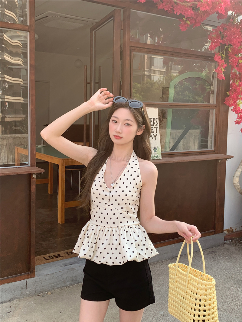 여성을위한 홀터넥 폴카 도트 민소매 조끼 2025 여름 새로운 한국 디자인 틈새 슬리밍 슬리밍 캐미솔 탑스토어 가기