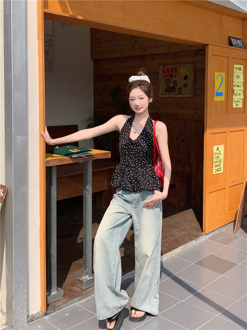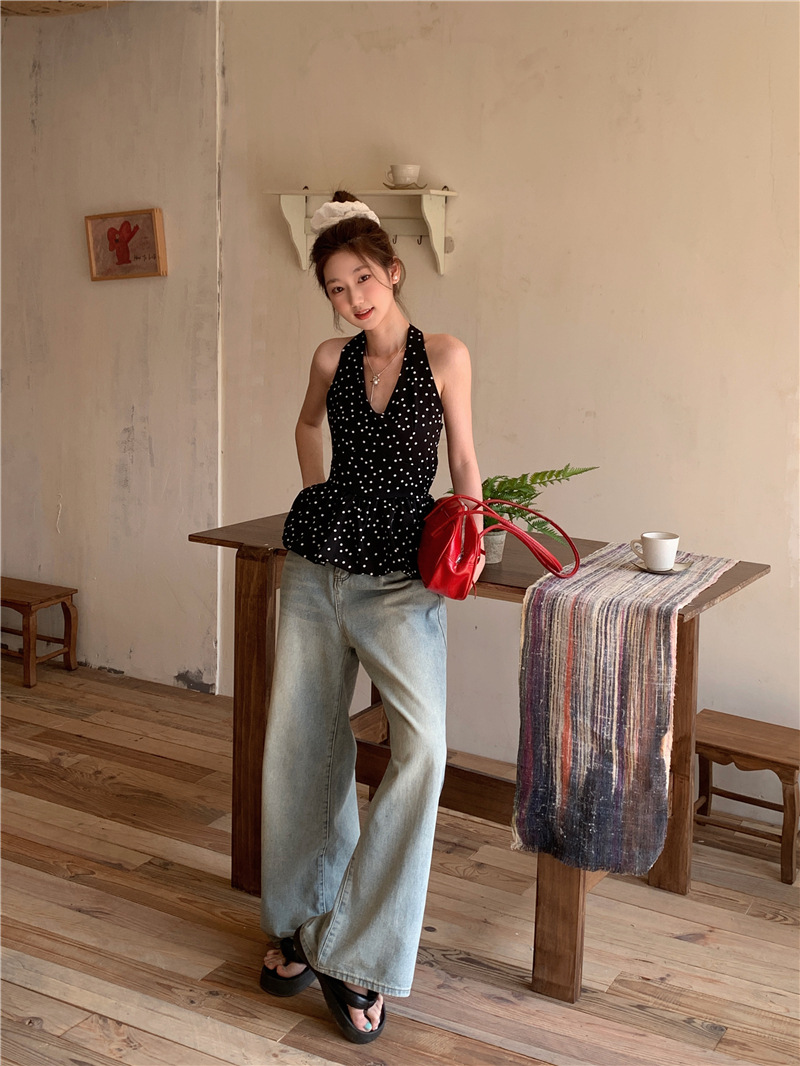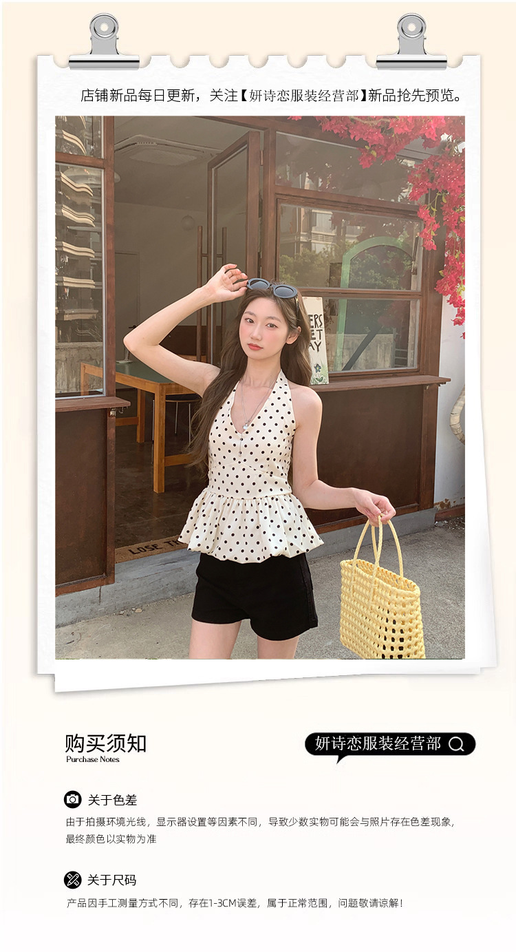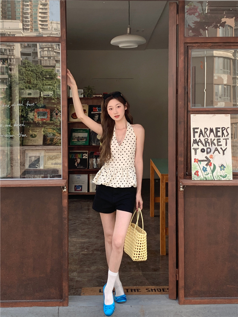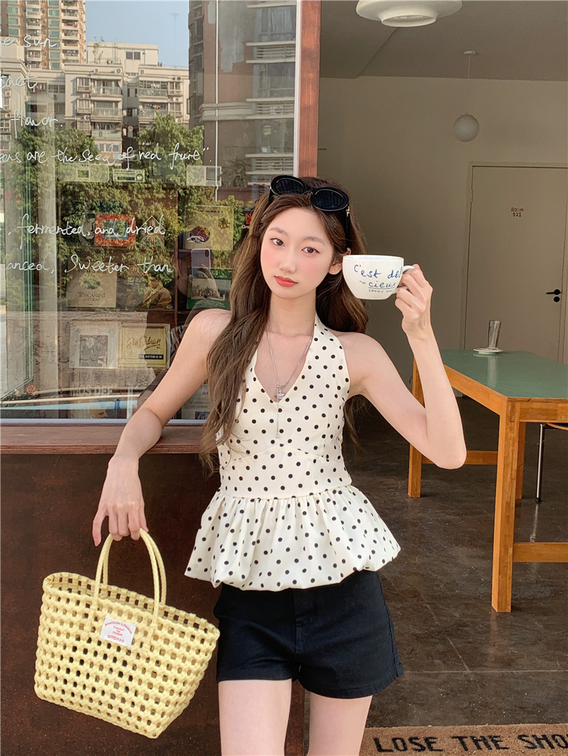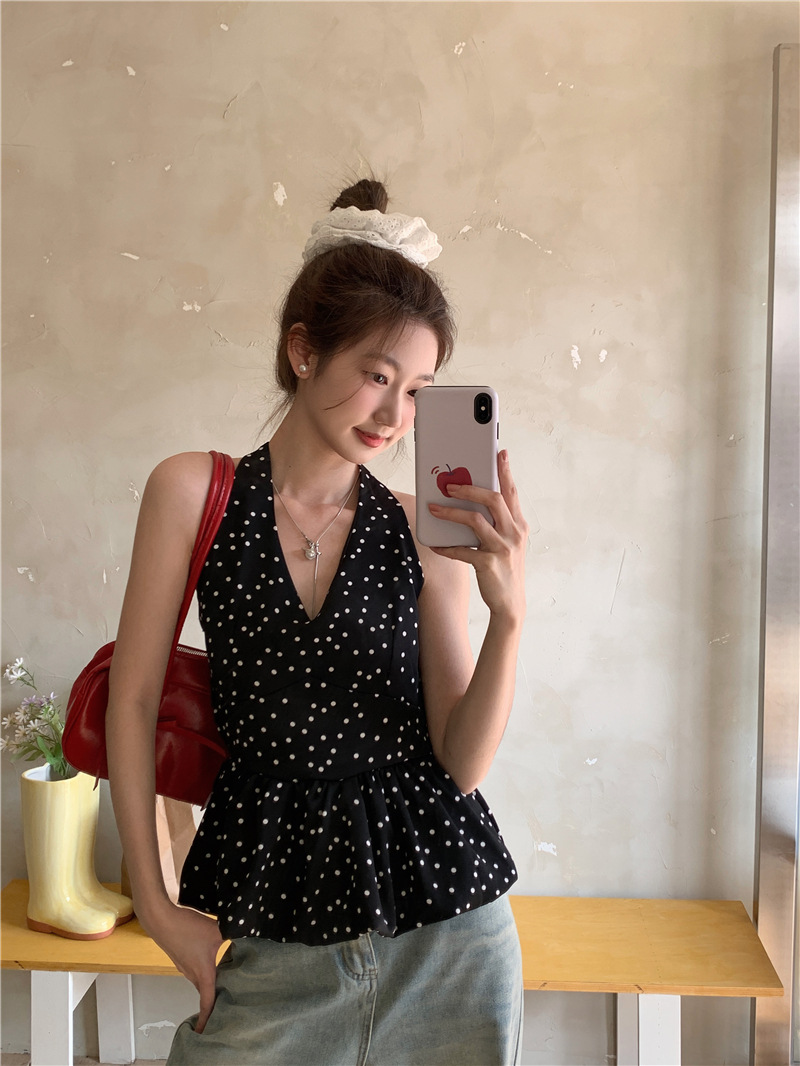 여성을위한 홀터넥 폴카 도트 민소매 조끼 2025 여름 새로운 한국 디자인 틈새 슬리밍 슬리밍 캐미솔 탑스토어 가기