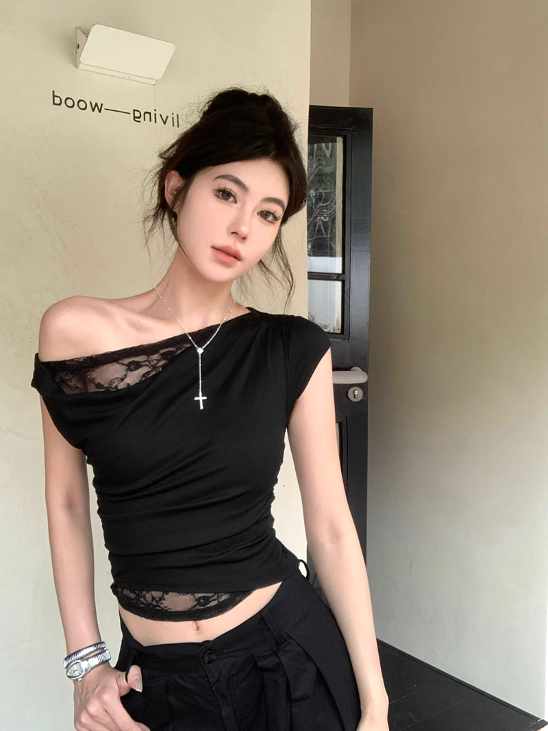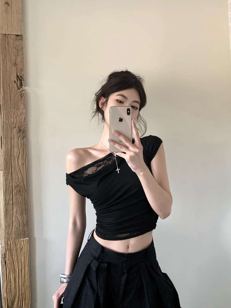 레이스 스티칭 화이트 슬랜트 어깨 반팔 티셔츠 여성용 여름 슬림 핏 플리츠 불규칙한 스파이스 걸 슬림 핏 쇼트 탑