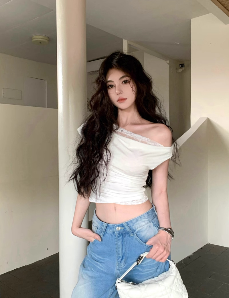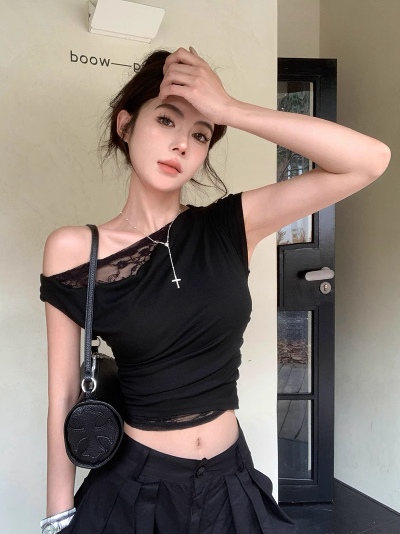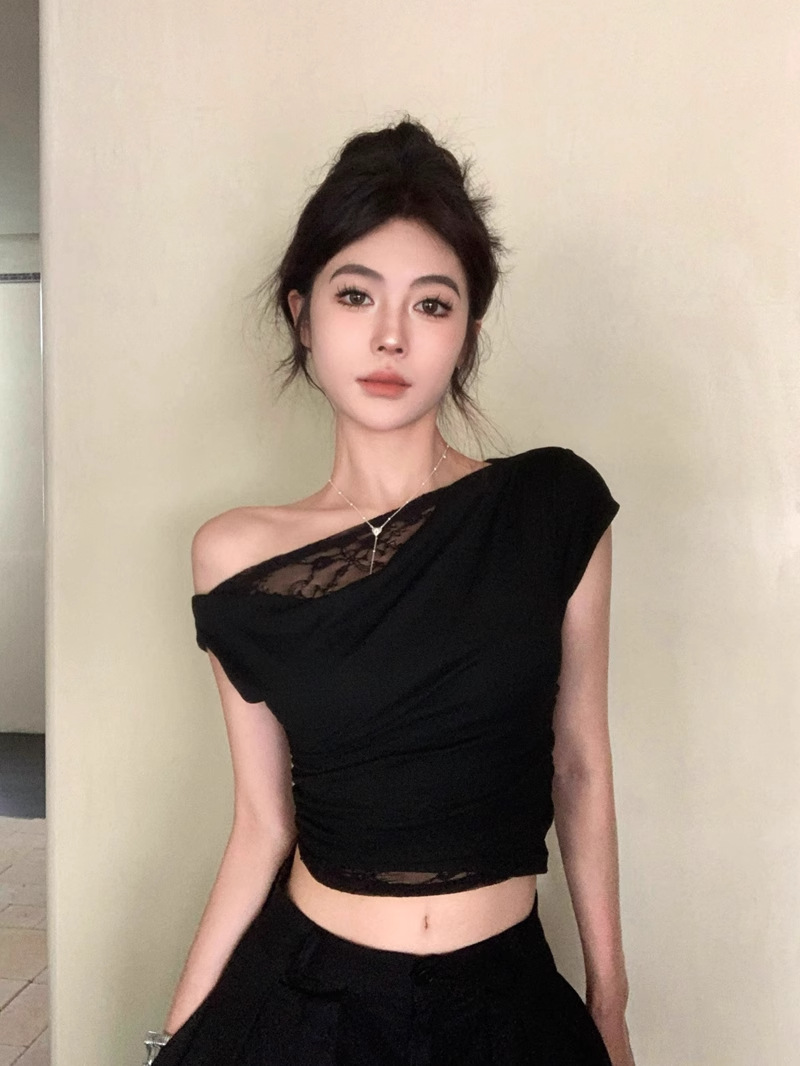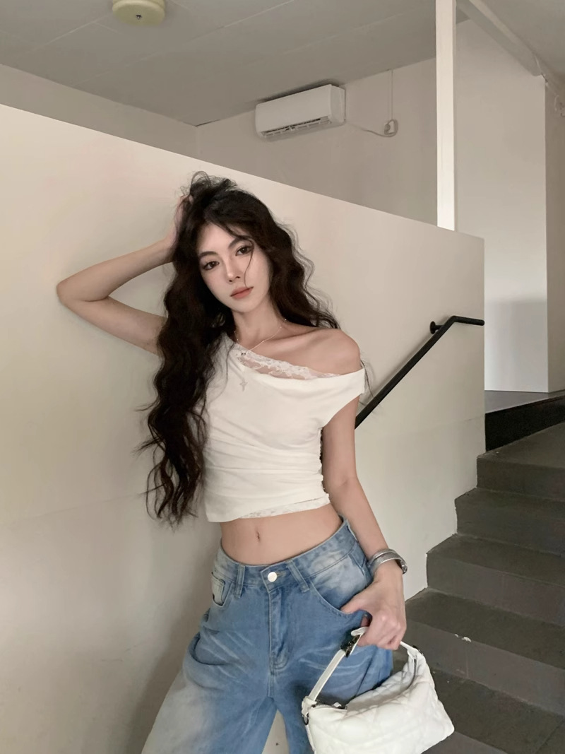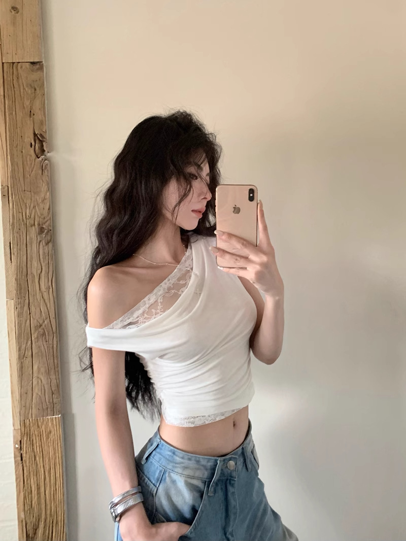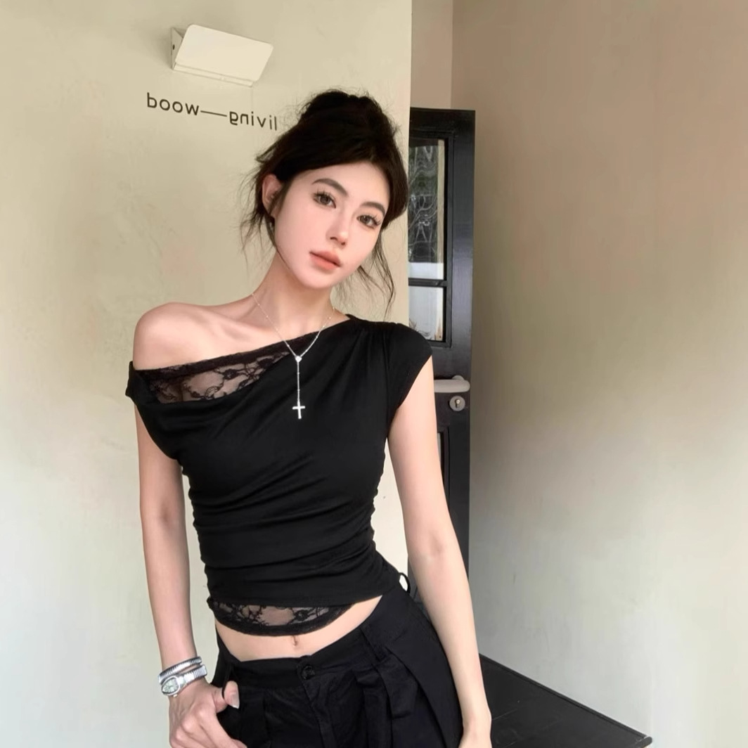 레이스 스티칭 화이트 슬랜트 어깨 반팔 티셔츠 여성용 여름 슬림 핏 플리츠 불규칙한 스파이스 걸 슬림 핏 쇼트 탑스토어 가기