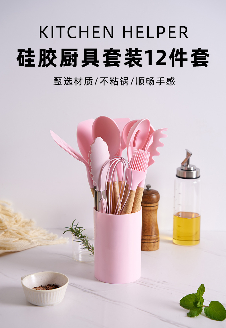 재고 있음 도매 나무 손잡이 실리콘 주방 용품 12 피스 세트 보관 튜브 요리 스푼 주걱 비 스틱 팬 세트 주방 도구스토어 가기