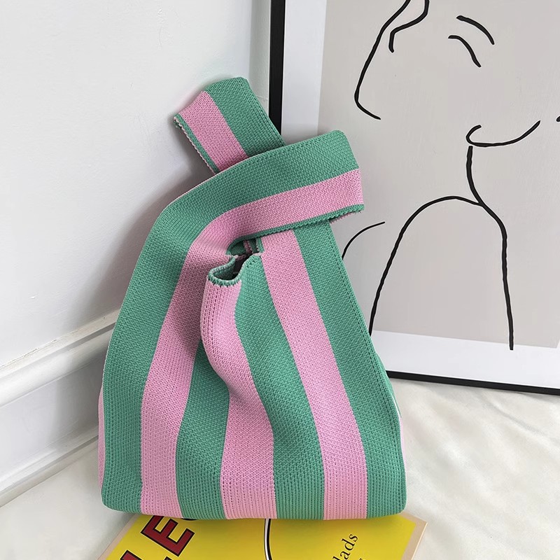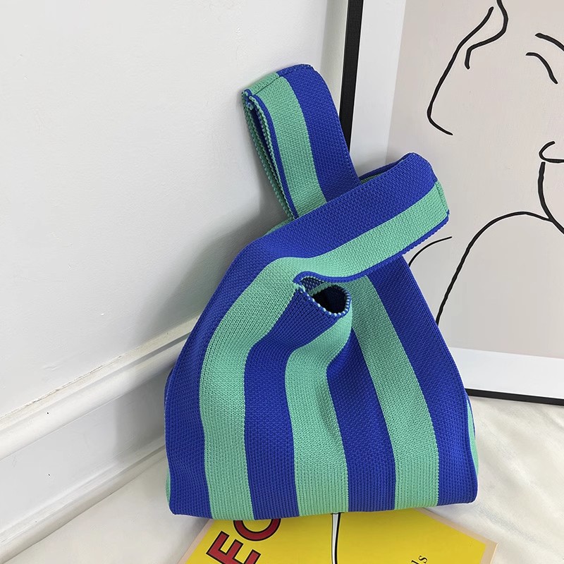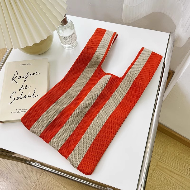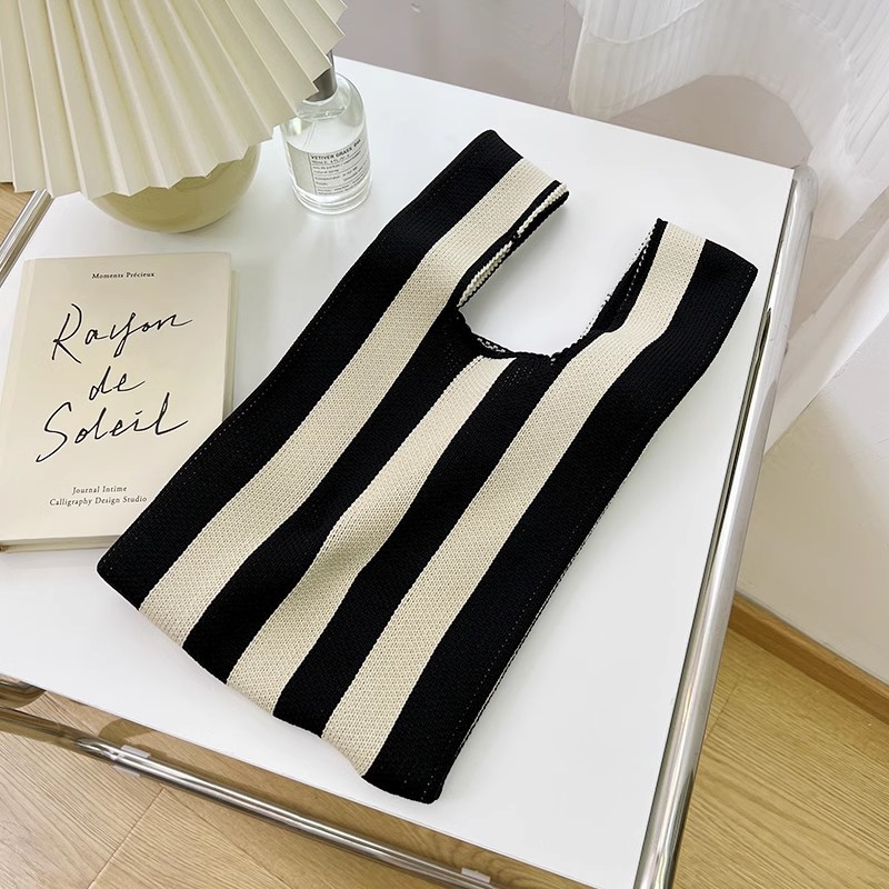 일본과 한국 스타일 간단한 올 매치 흑백 컬러 줄무늬 토트 버킷 백 유행 유행 소녀의 편리한 니트 백스토어 가기
