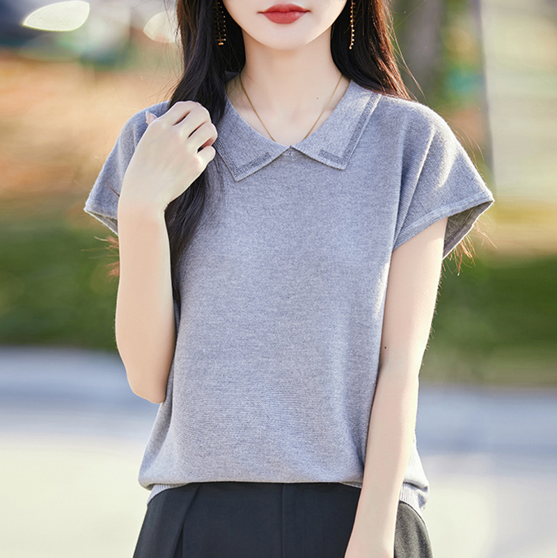 여성을위한 인형 칼라 반팔 울 니트 탑 여름 2025 새로운 젊은 바닥 셔츠 솔리드 컬러 티셔츠 얇은