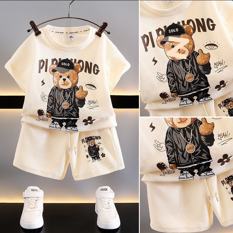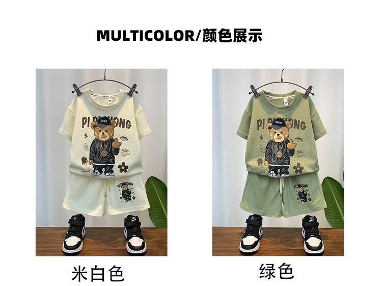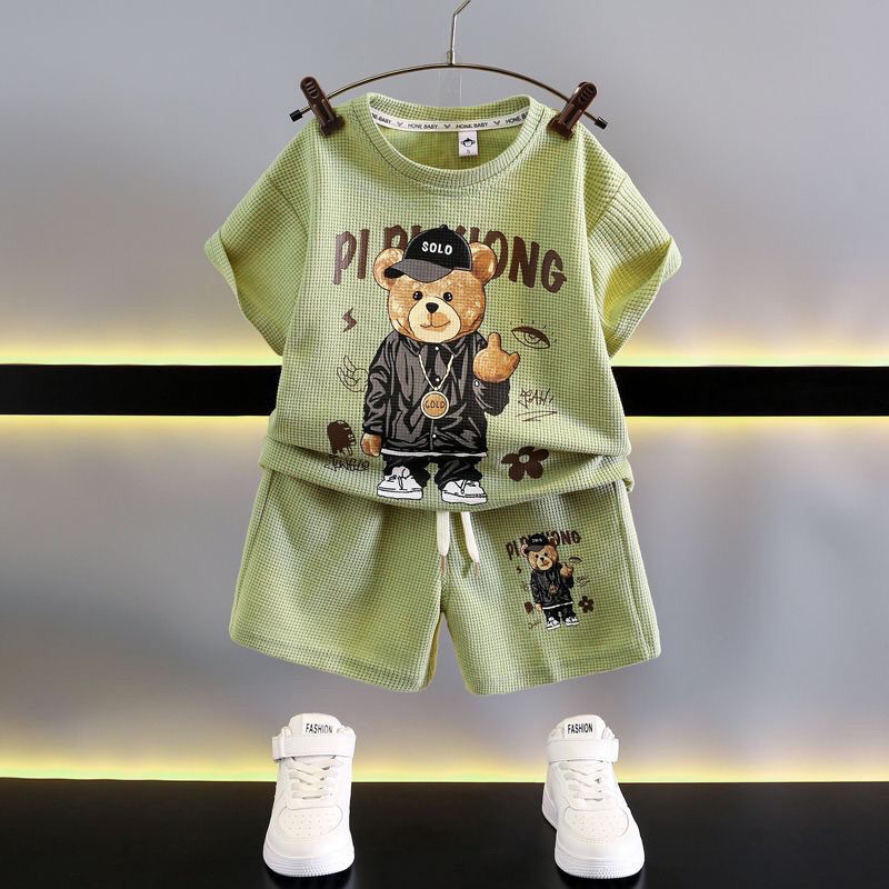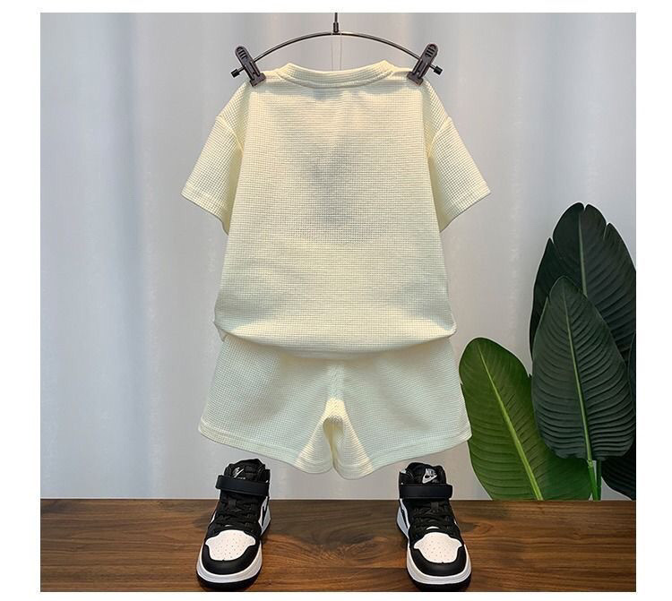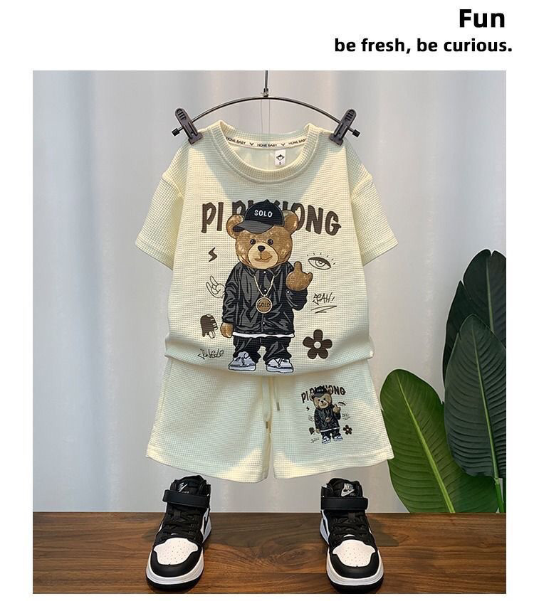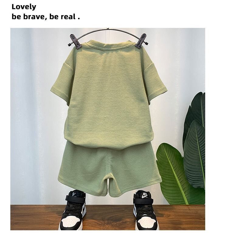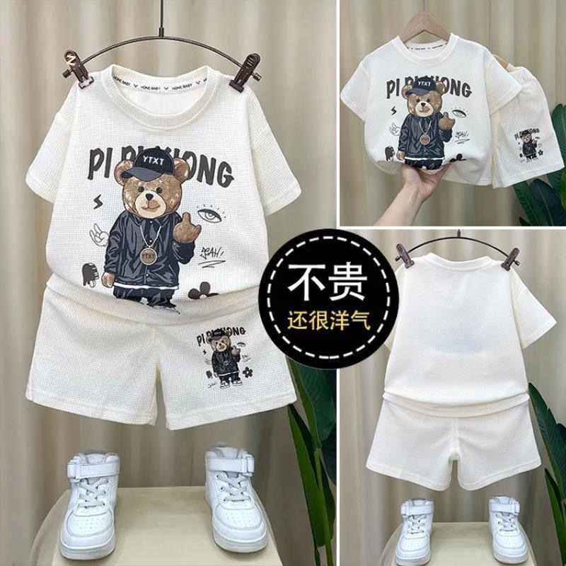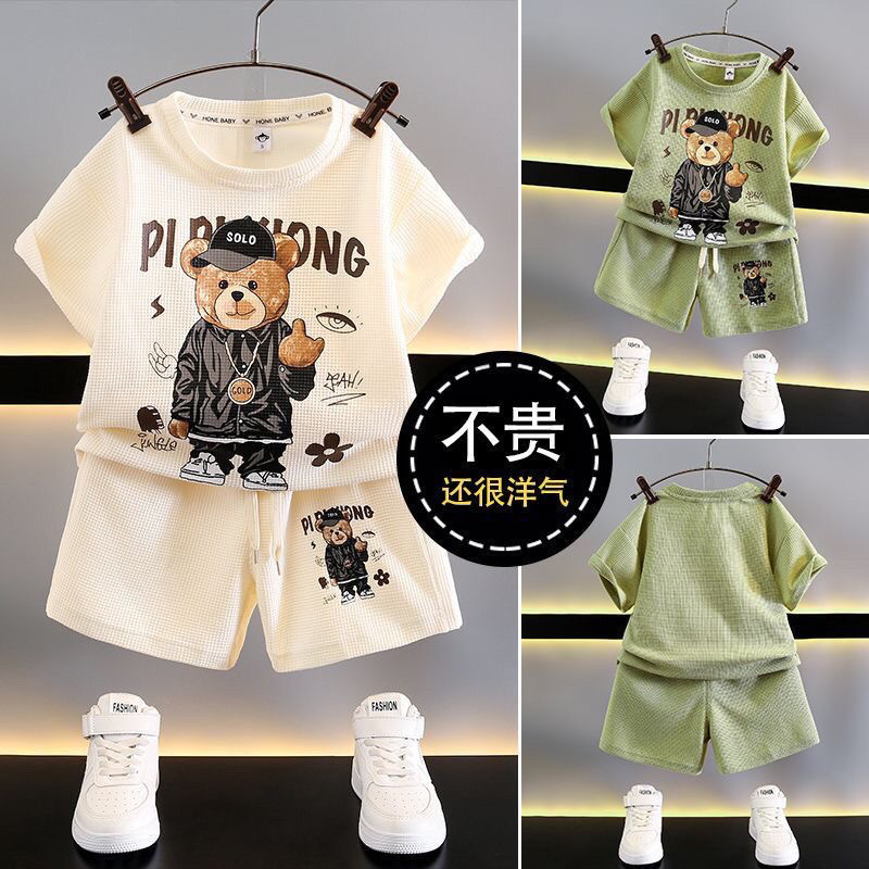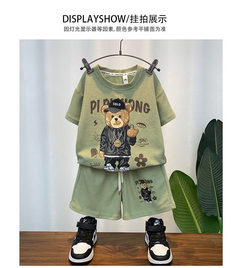 아동용 반팔 양복 2025 트렌디하고 멋진 소년 여름 옷 소년의 세련된 여름 투피스 세트 인기 스플릿 오프셋 인쇄스토어 가기