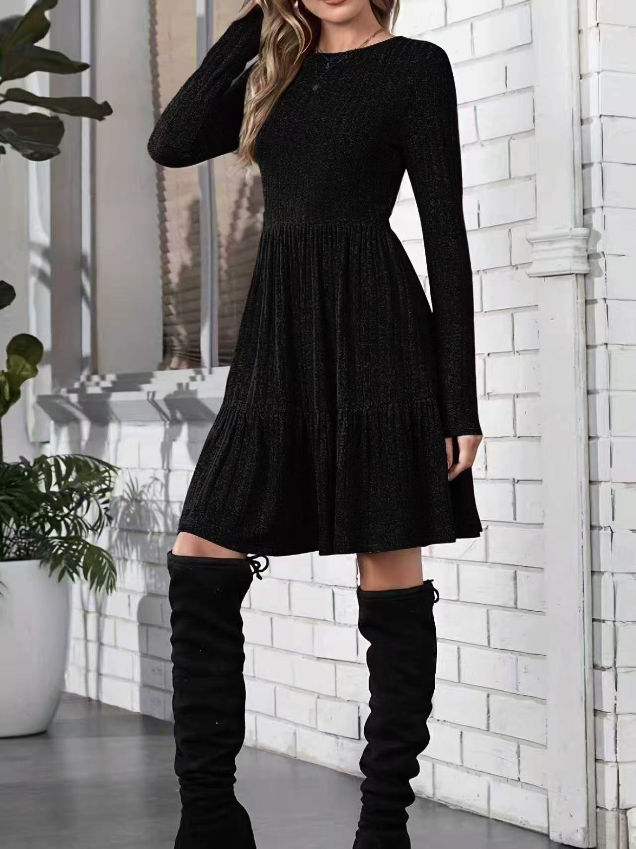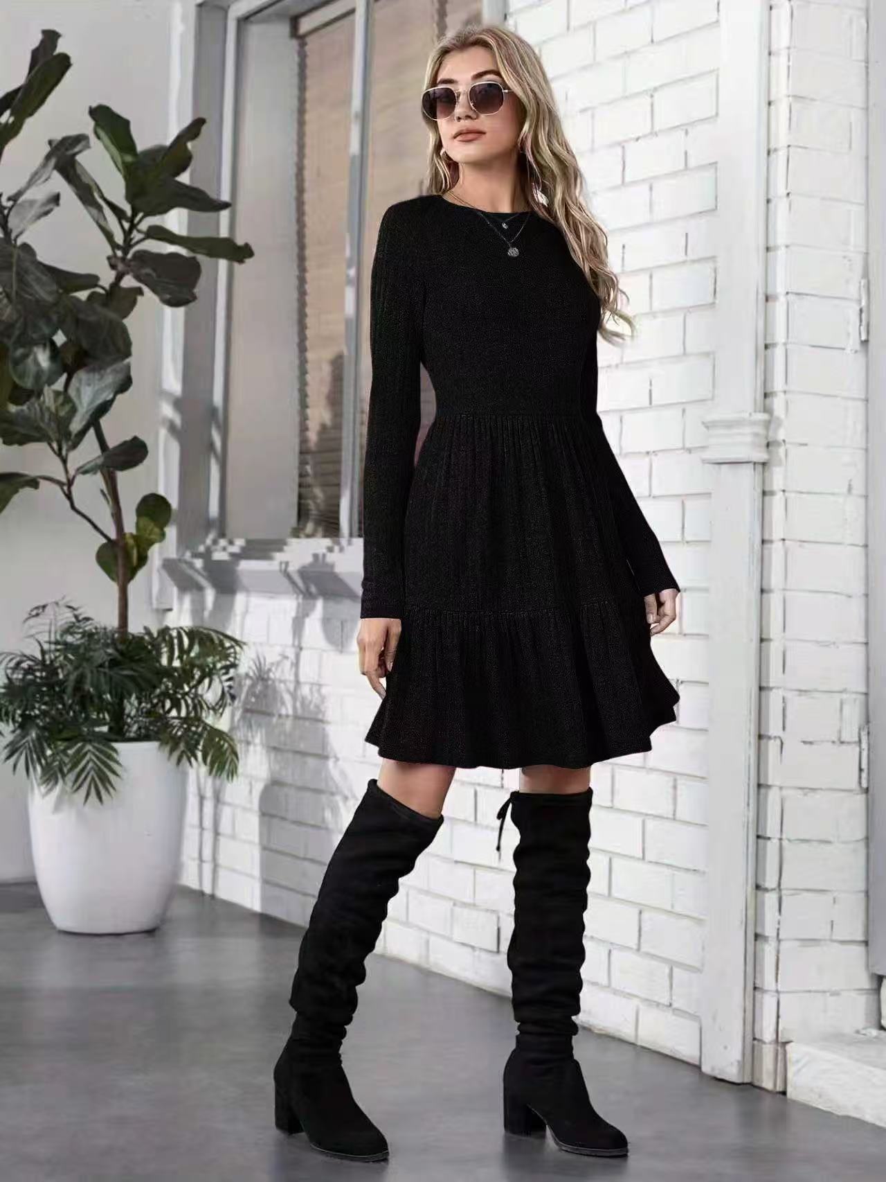 2025 유럽 및 미국 스타일의 우아한 라운드넥 주름 폴리에스터 원피스스토어 가기