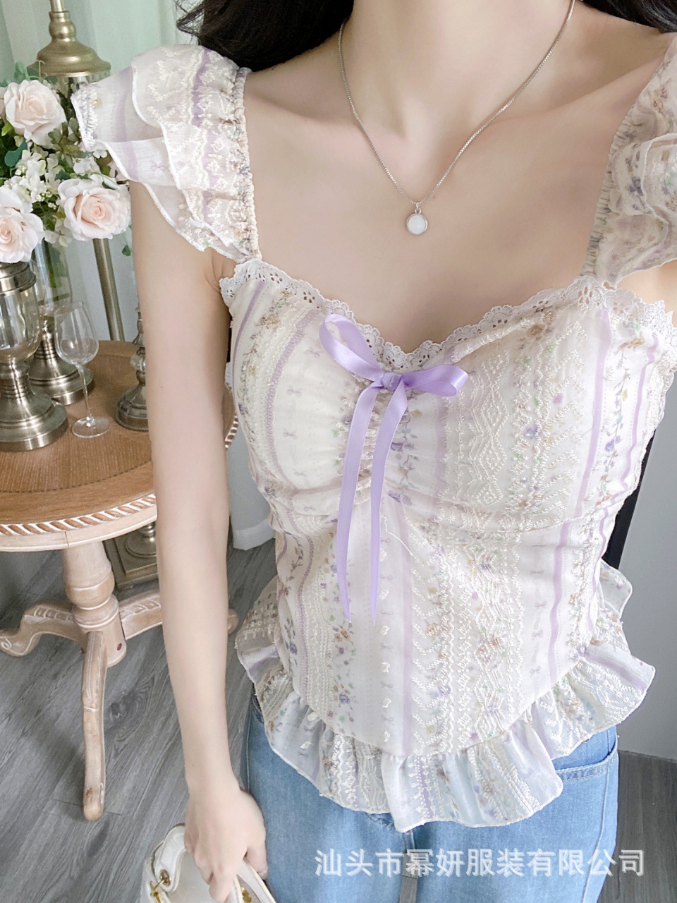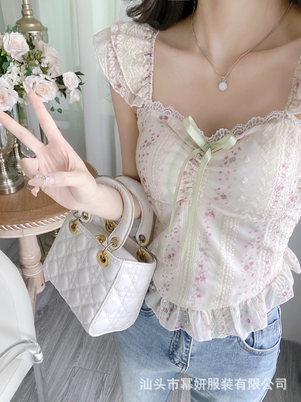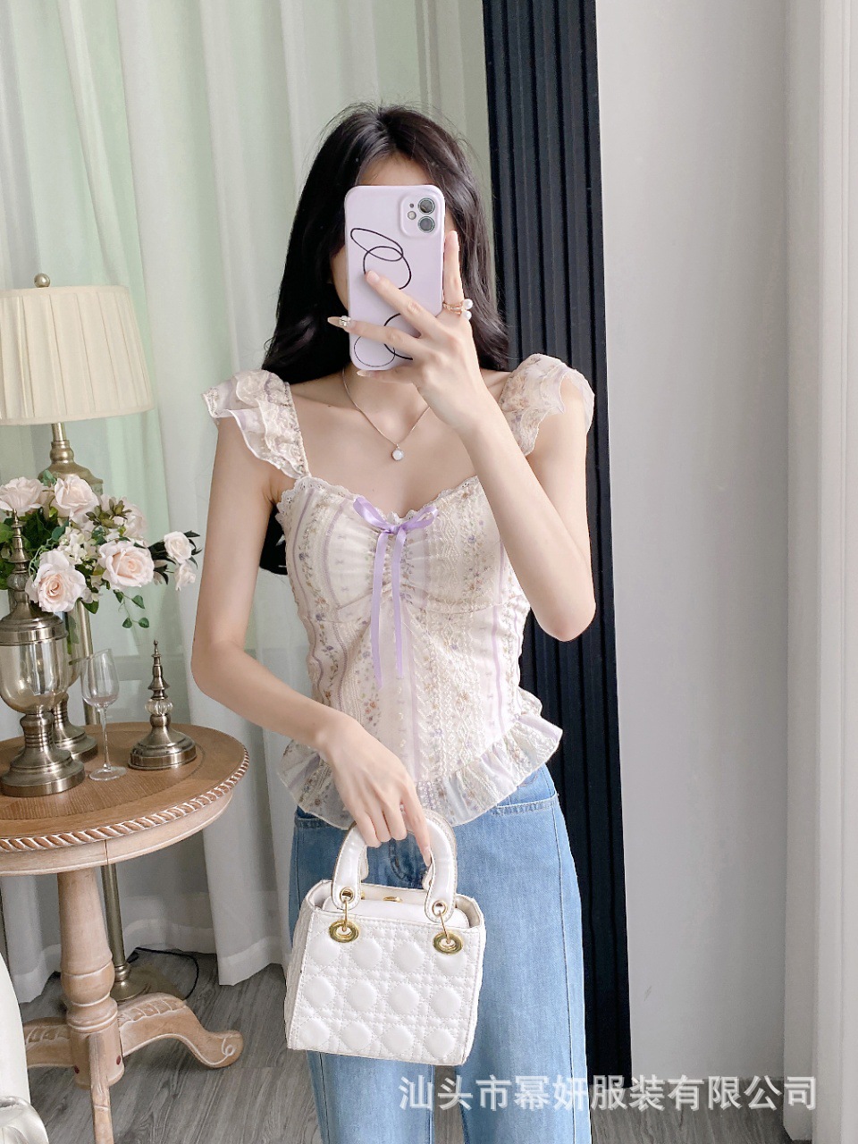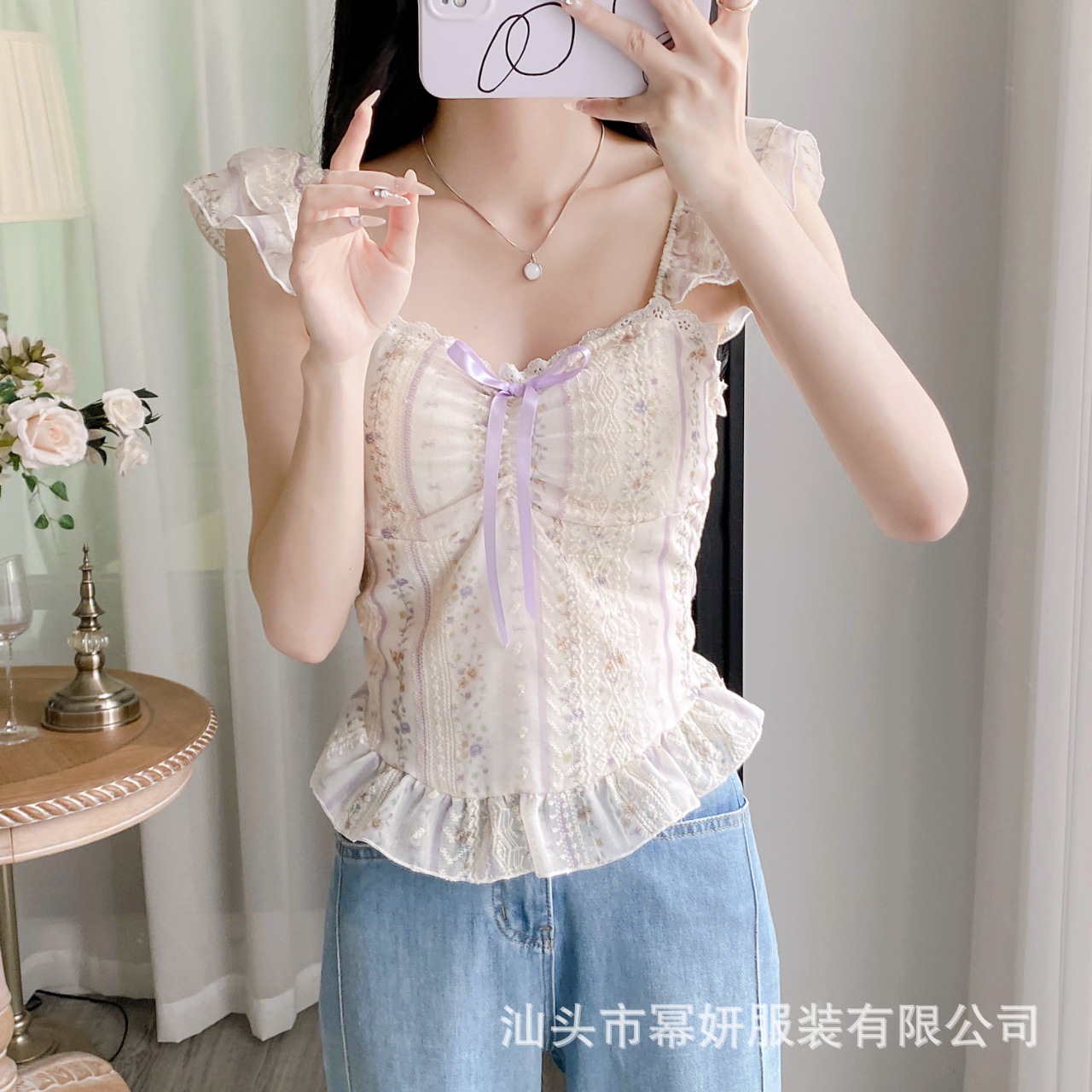 순수한 욕망 달콤한 목가적 스타일의 캐미솔 여성 여름 작은 플라잉 슬리브 꽃무늬 튜브 탑 레이스 아름다운 뒷면스토어 가기