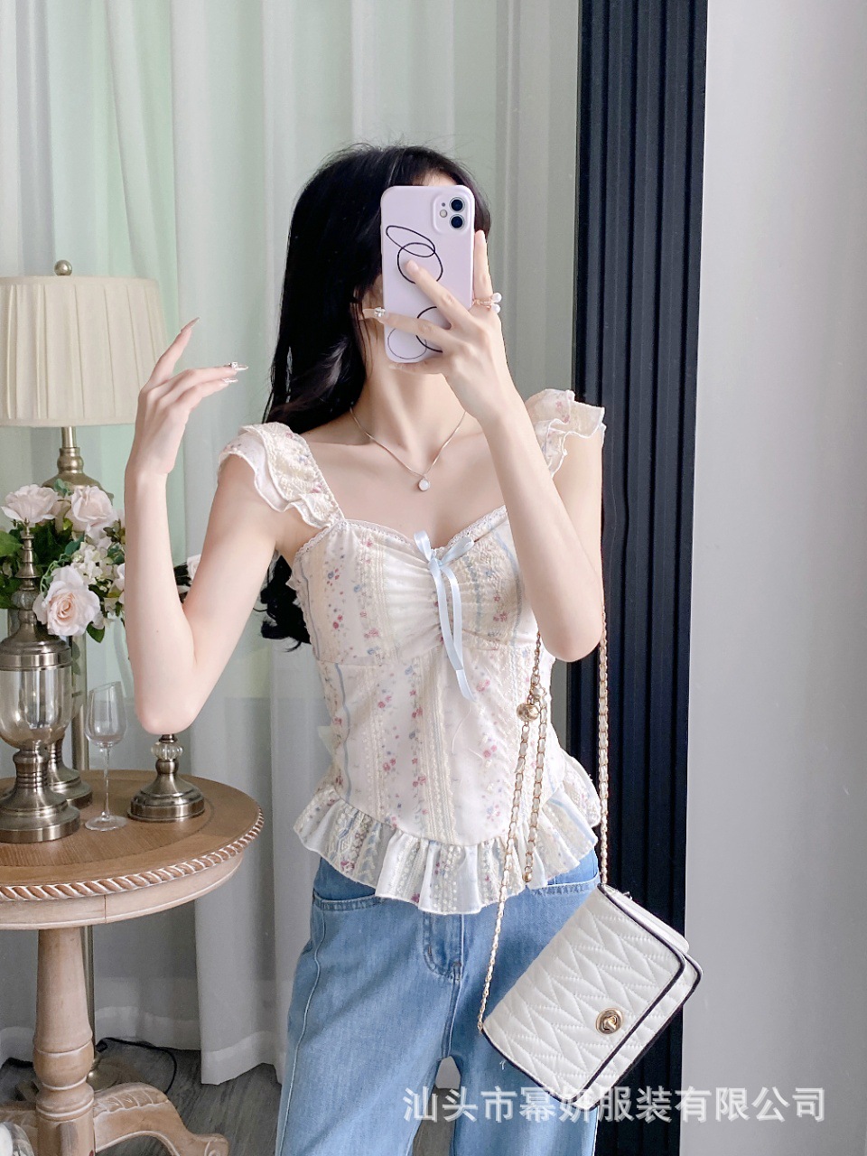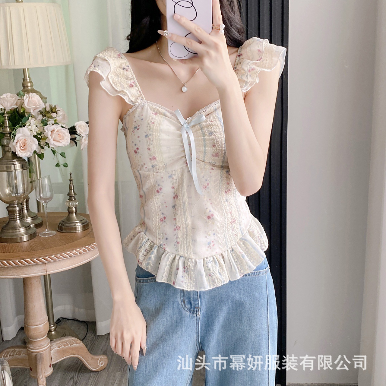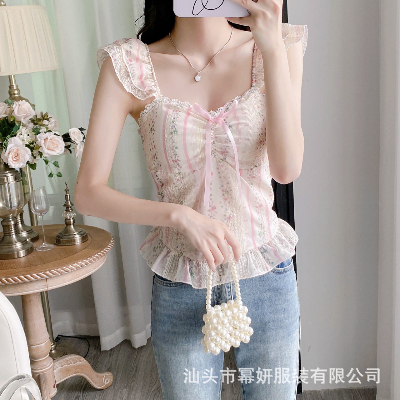 순수한 욕망 달콤한 목가적 스타일의 캐미솔 여성 여름 작은 플라잉 슬리브 꽃무늬 튜브 탑 레이스 아름다운 뒷면스토어 가기