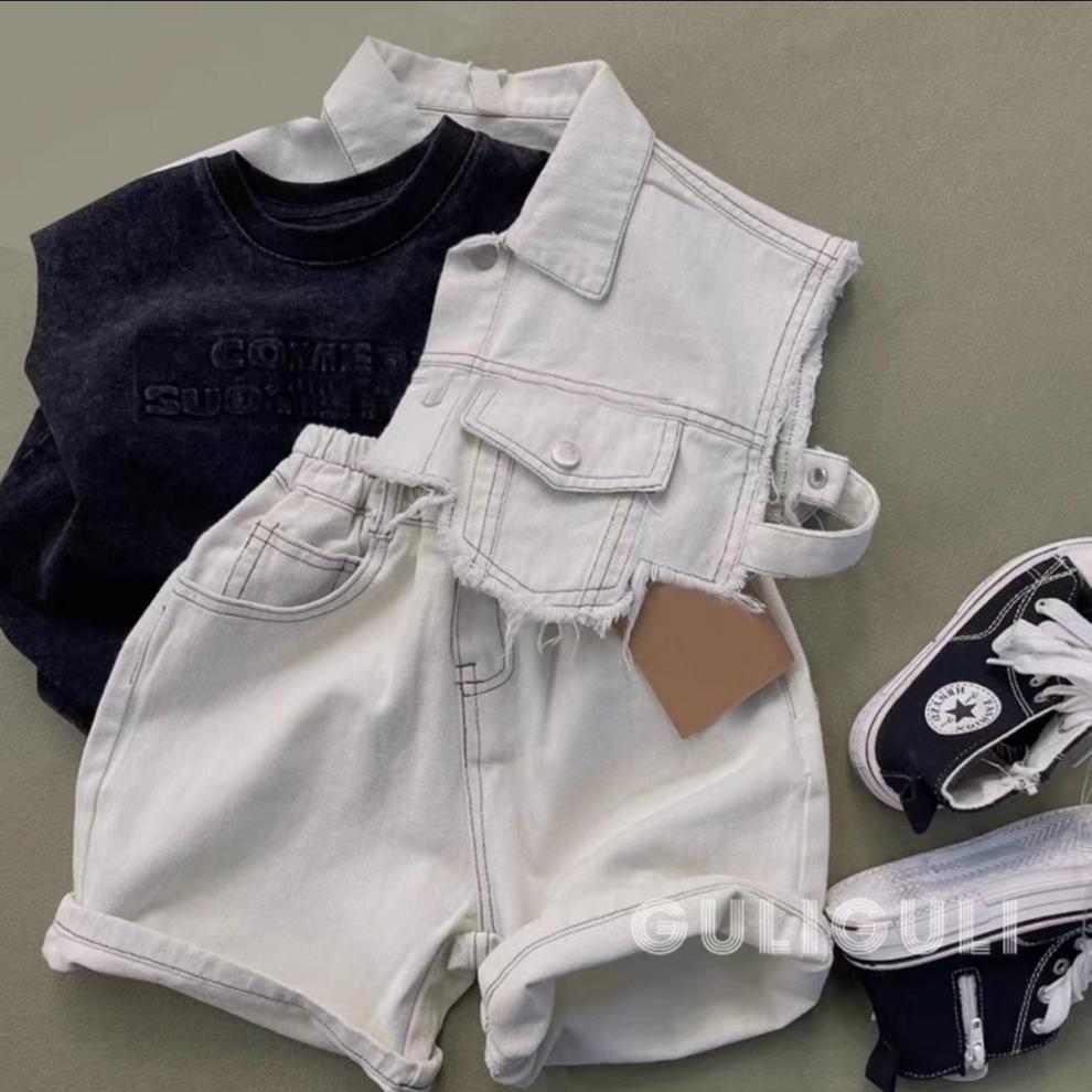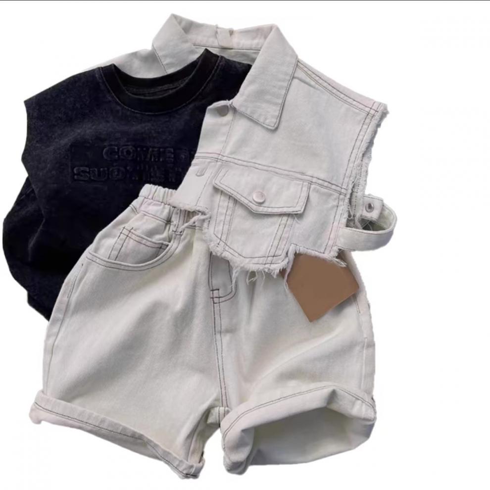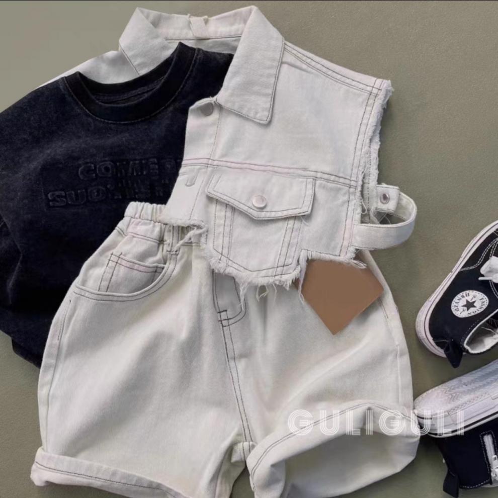 남아 여름 데님 슈트, 핸섬 스트리트 패션 루즈 아동 데님 셔츠, 얇은 반바지 3종 세트스토어 가기
