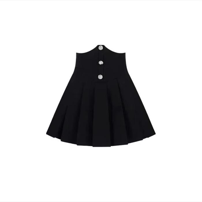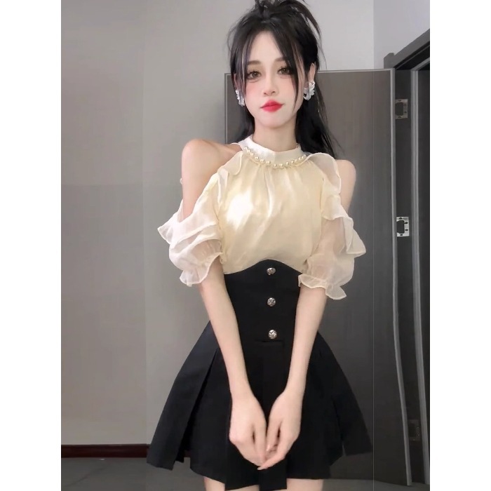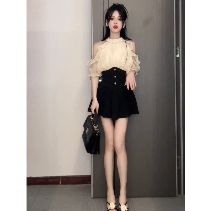 2025 여름 한국 스타일 정장 스커트, 고급 진주 홀터넥 오프숄더 탑 + 하이웨이스트 스커트 투피스 세트