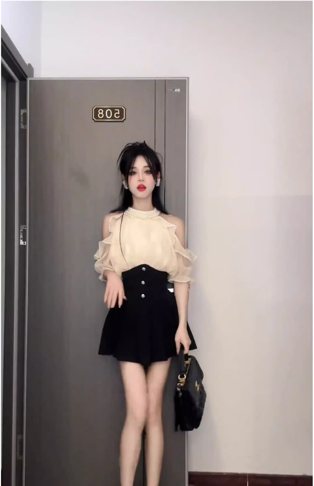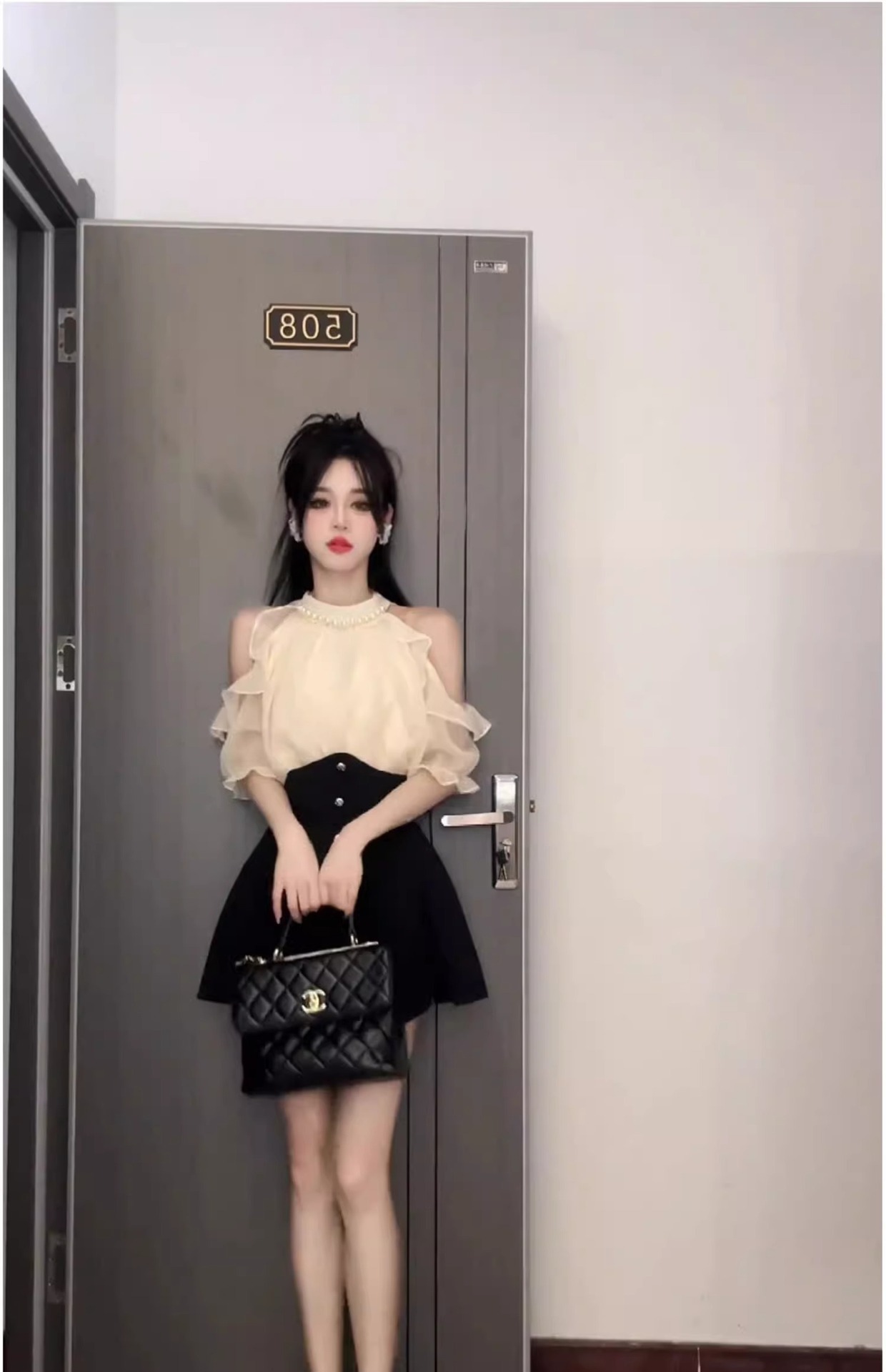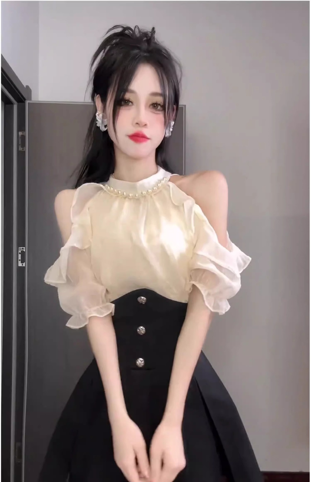 2025 여름 한국 스타일 정장 스커트, 고급 진주 홀터넥 오프숄더 탑 + 하이웨이스트 스커트 투피스 세트스토어 가기