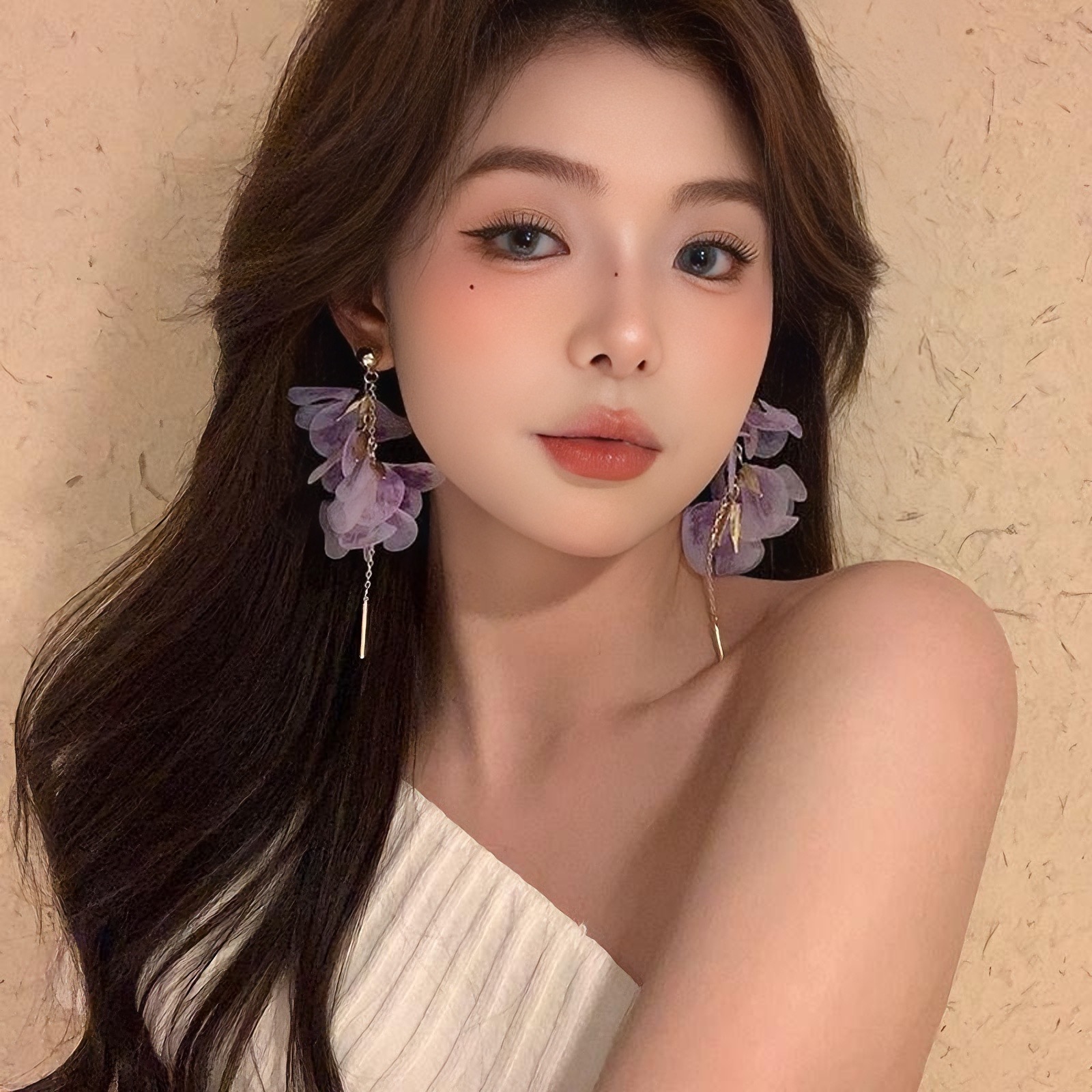 여성을 위한 슈퍼 요정 보라색 메쉬 꽃잎 태슬 귀걸이, 달콤한 스타일의 귀걸이, 절묘하고 아름다운 귀걸이, 독특하고 과장된 귀걸이스토어 가기