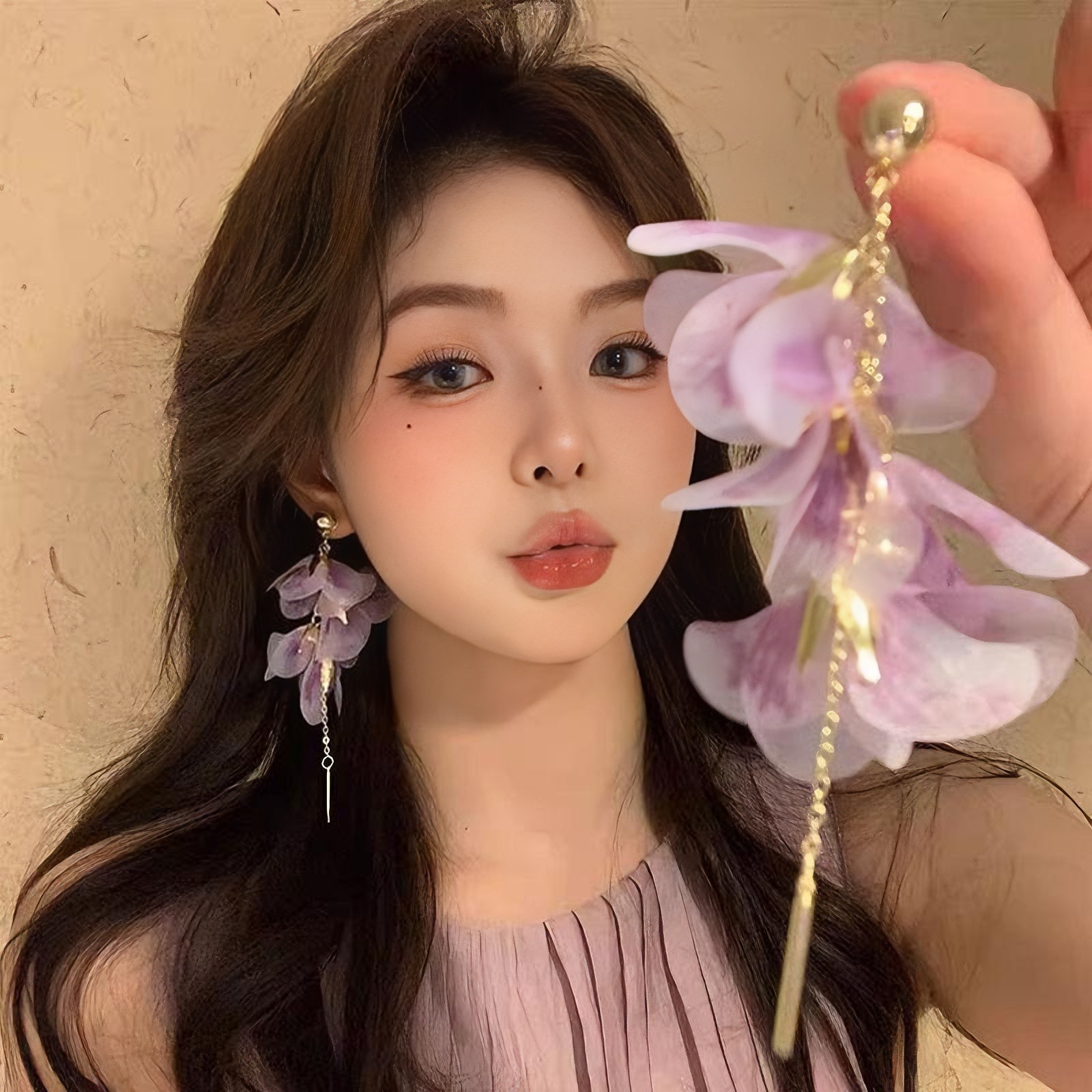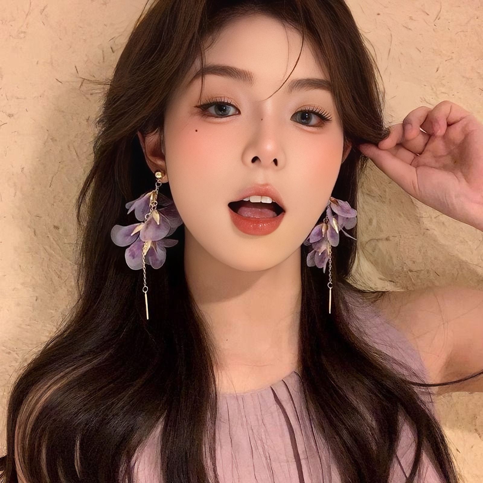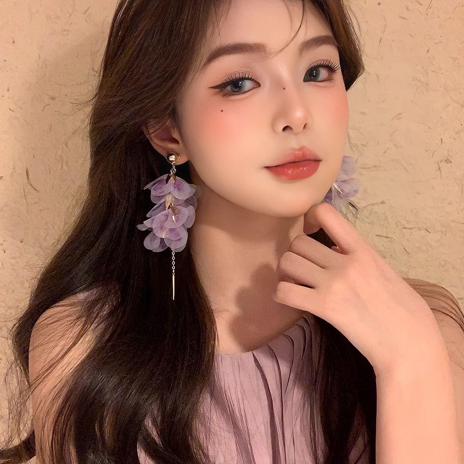 여성을 위한 슈퍼 요정 보라색 메쉬 꽃잎 태슬 귀걸이, 달콤한 스타일의 귀걸이, 절묘하고 아름다운 귀걸이, 독특하고 과장된 귀걸이